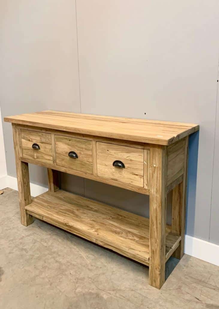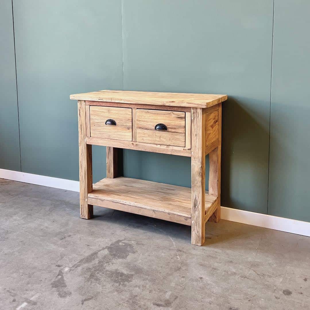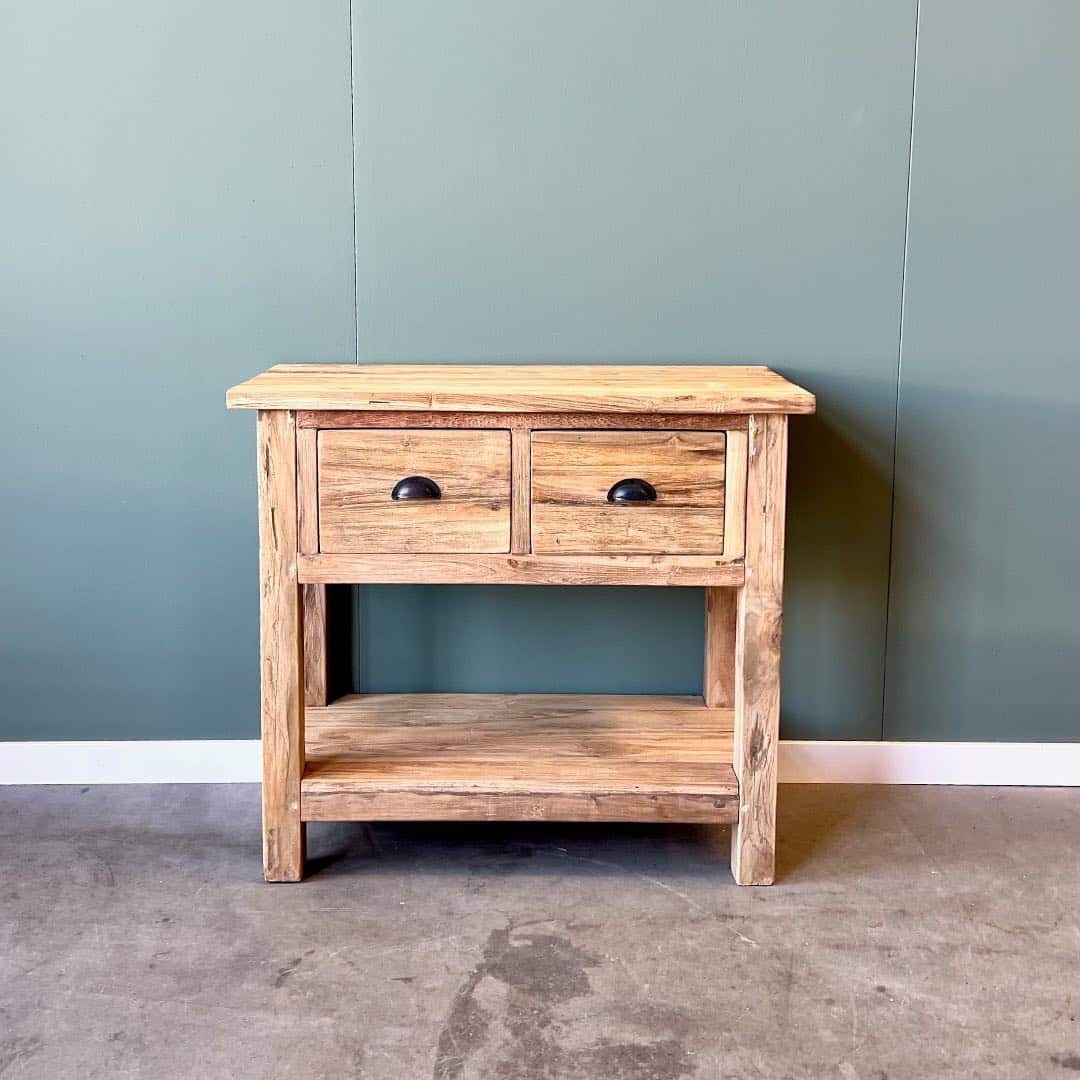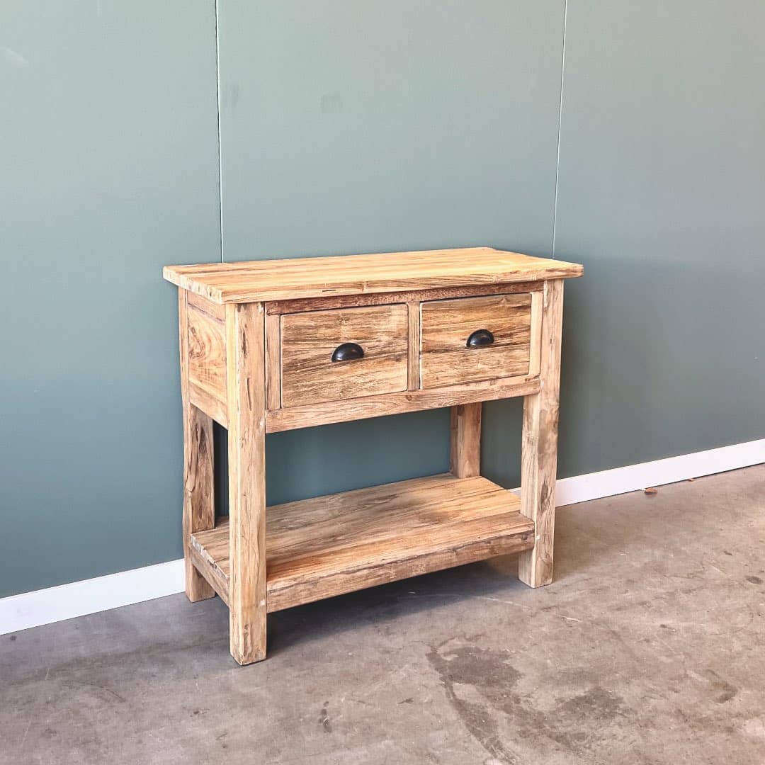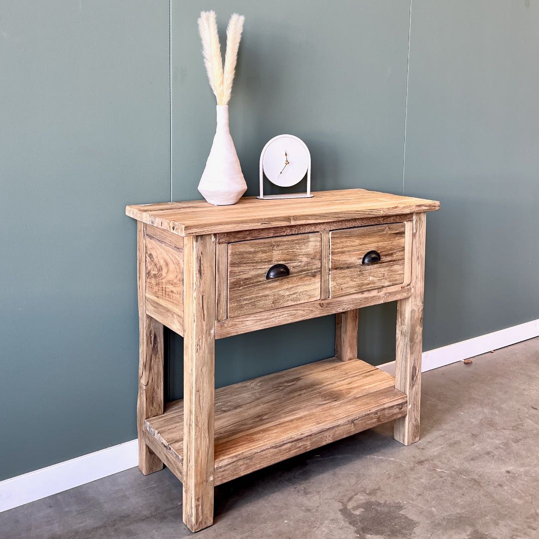 Sidetable met een robuuste afwerking in onbehandeld teakhout.