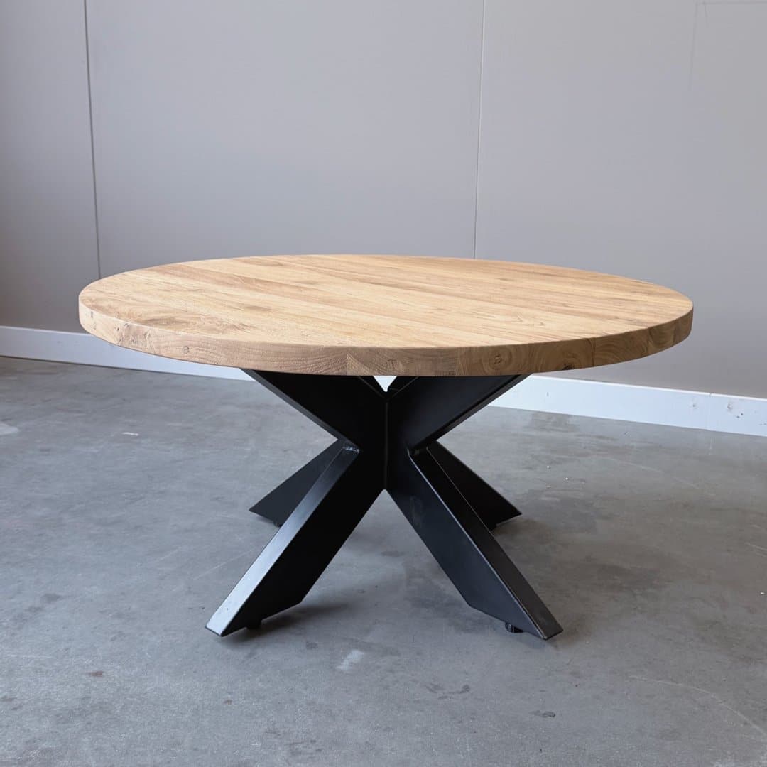 Het ronde tafelblad rust op een zwart gepoedercoate stalen kruispoot, die zorgt voor een stevig en stabiel geheel. De combinatie van warm teakhout en het strakke staal geeft de salontafel een eigentijdse uitstraling die moeiteloos past in zowel industriële als moderne interieurs.