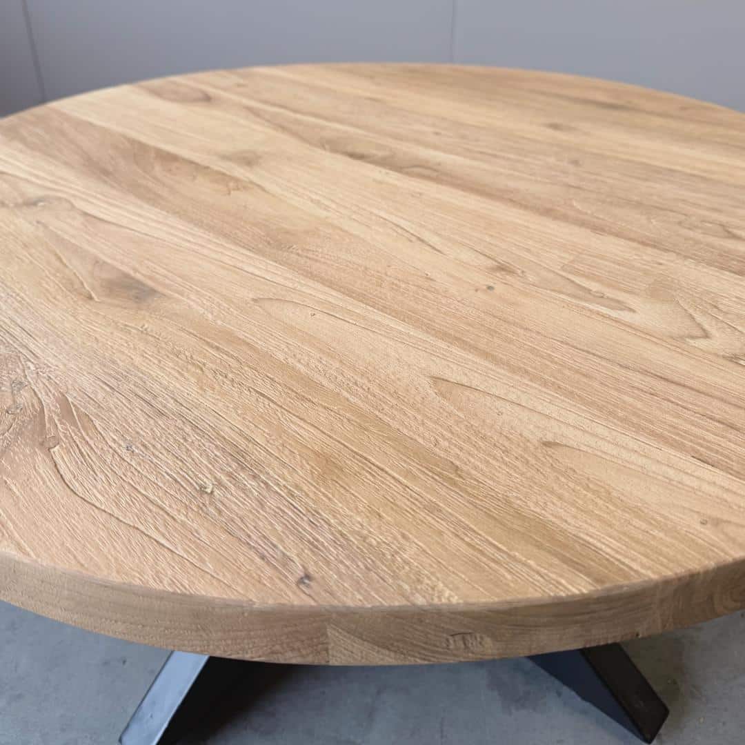 Deze ronde robuuste salontafel is een echte blikvanger in de woonkamer. Het blad is gemaakt van massief gerecycled teakhout met een FSC-keurmerk, wat niet alleen zorgt voor een duurzame keuze, maar ook voor een karaktervolle uitstraling. Het geborstelde teak benadrukt de houtnerf en geeft het blad een stoer, doorleefd karakter.
