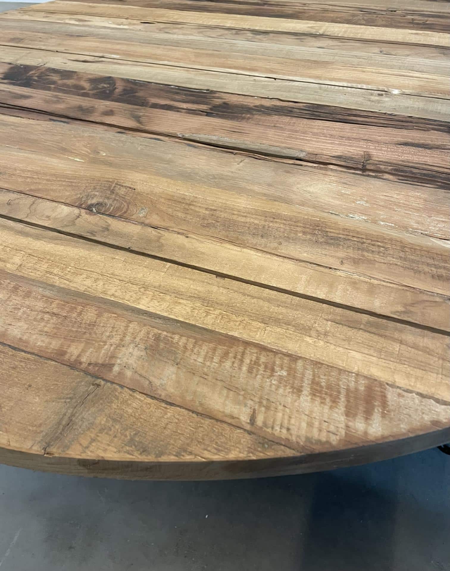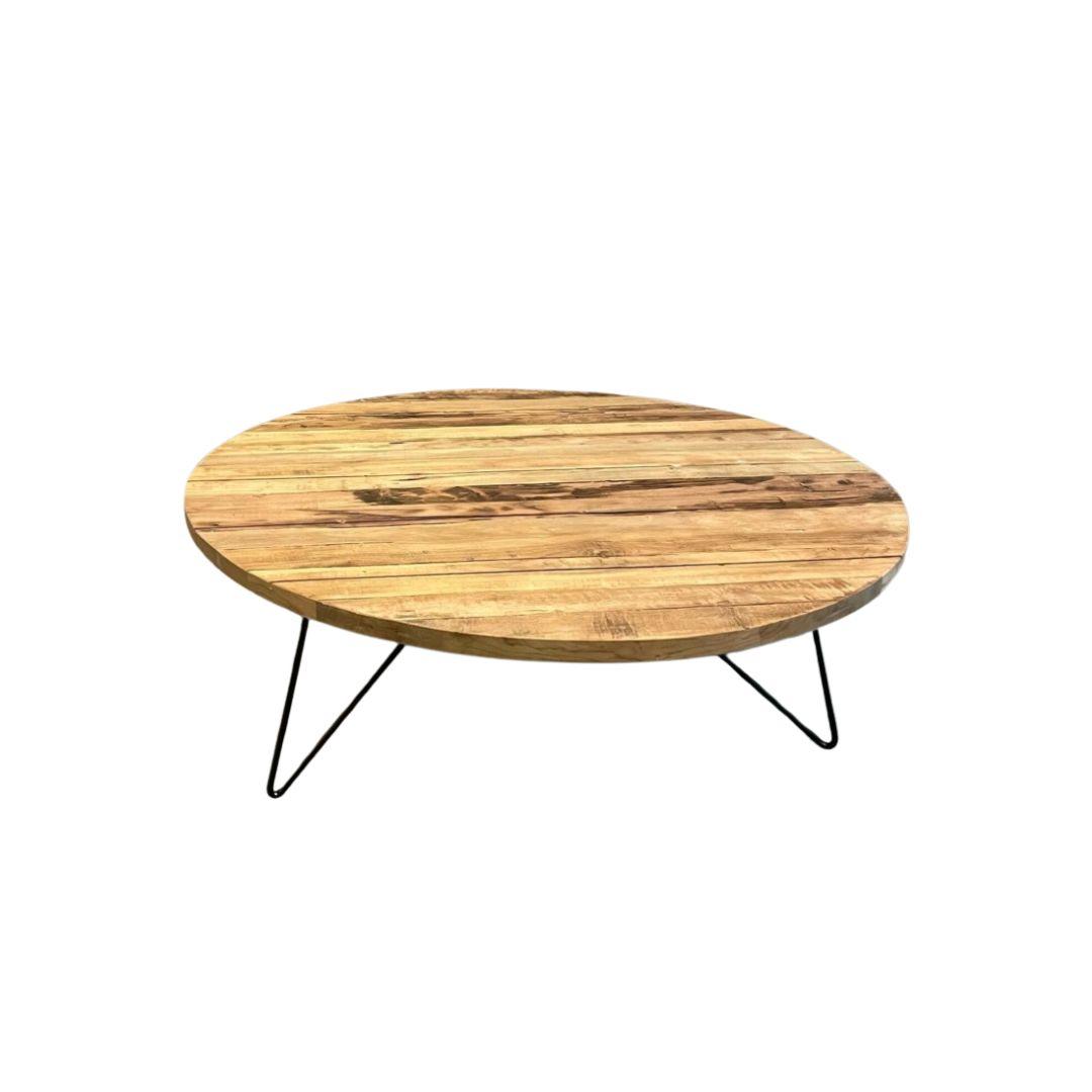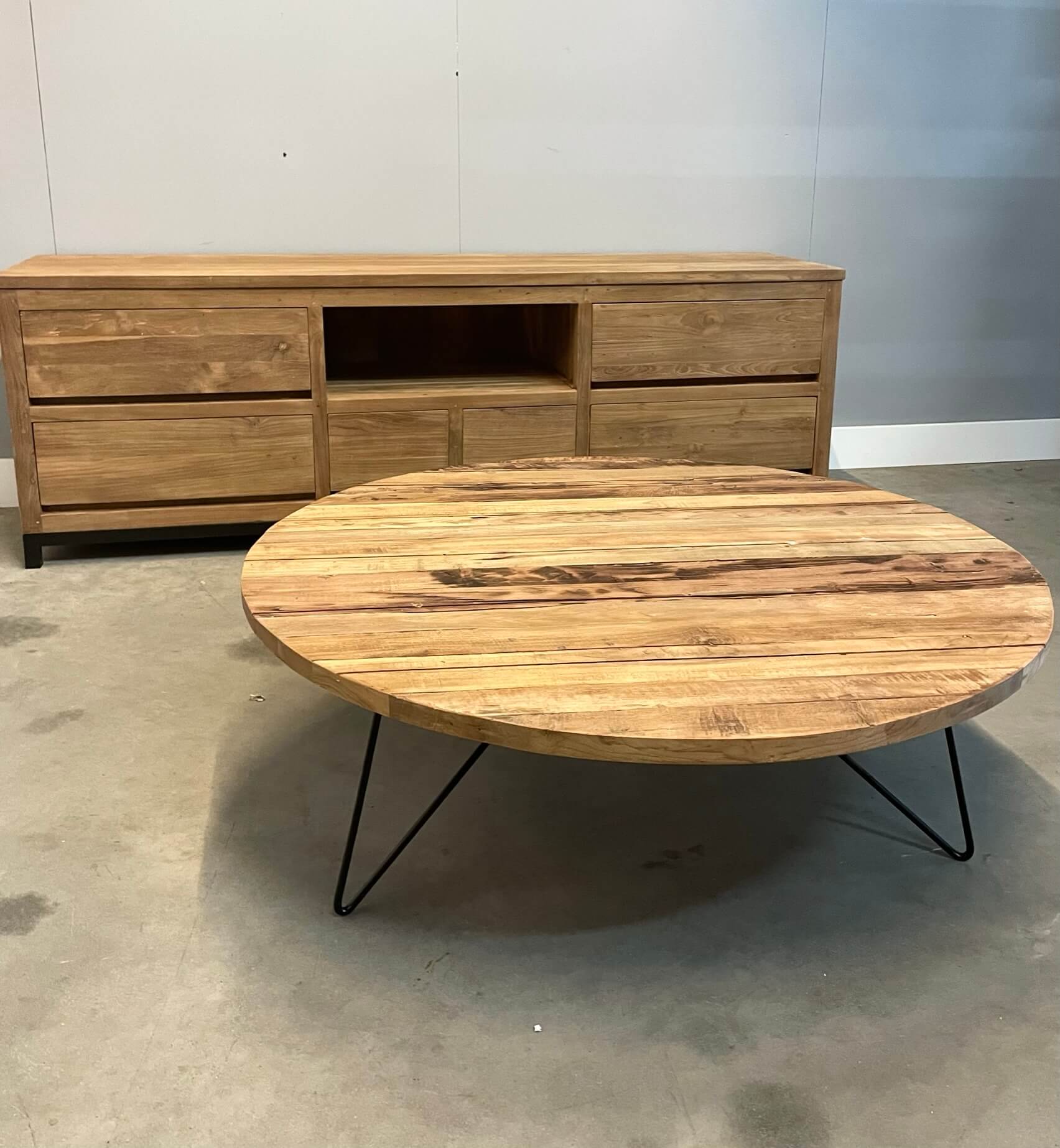 Robuuste salontafel rond gemaakt van gerecycled teakhout. De metalen pootjes passen goed bij het doorleefde blad.