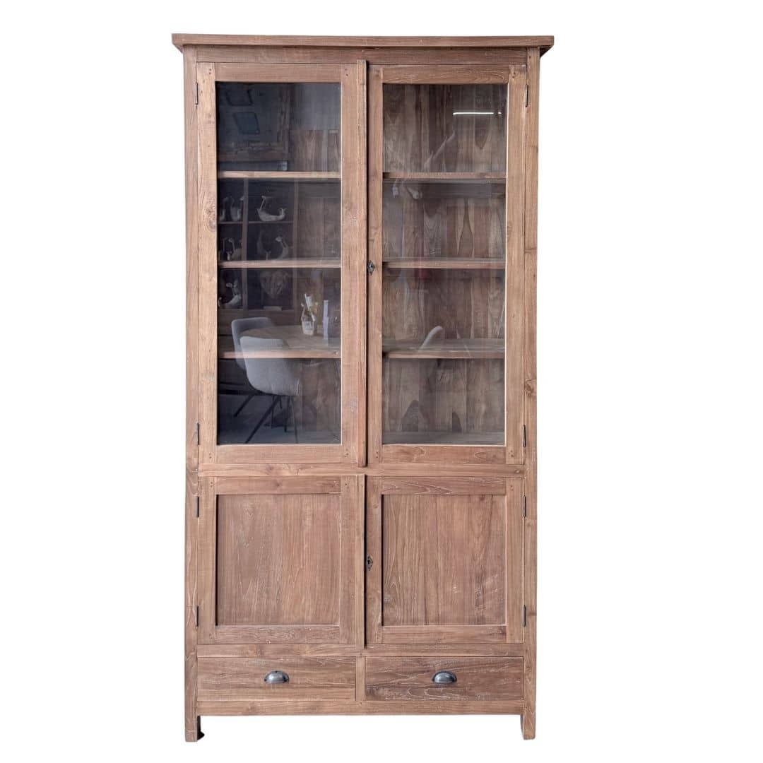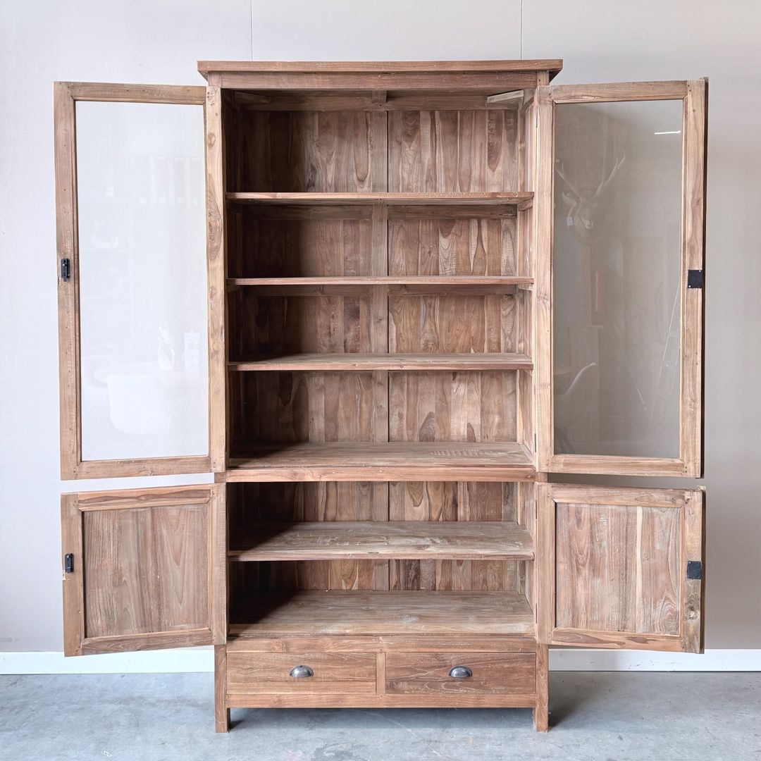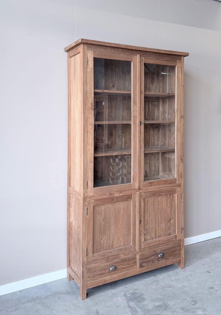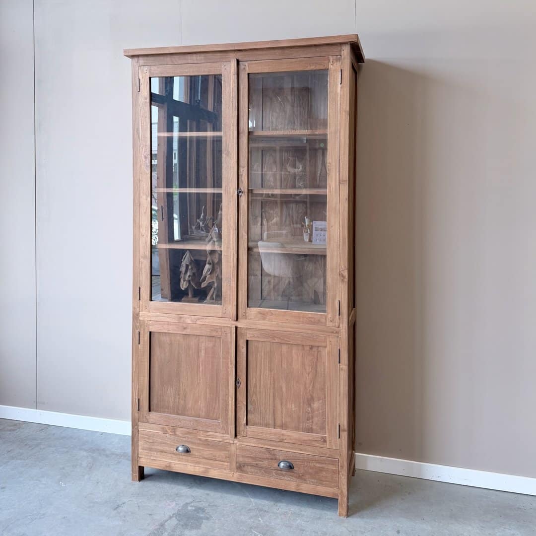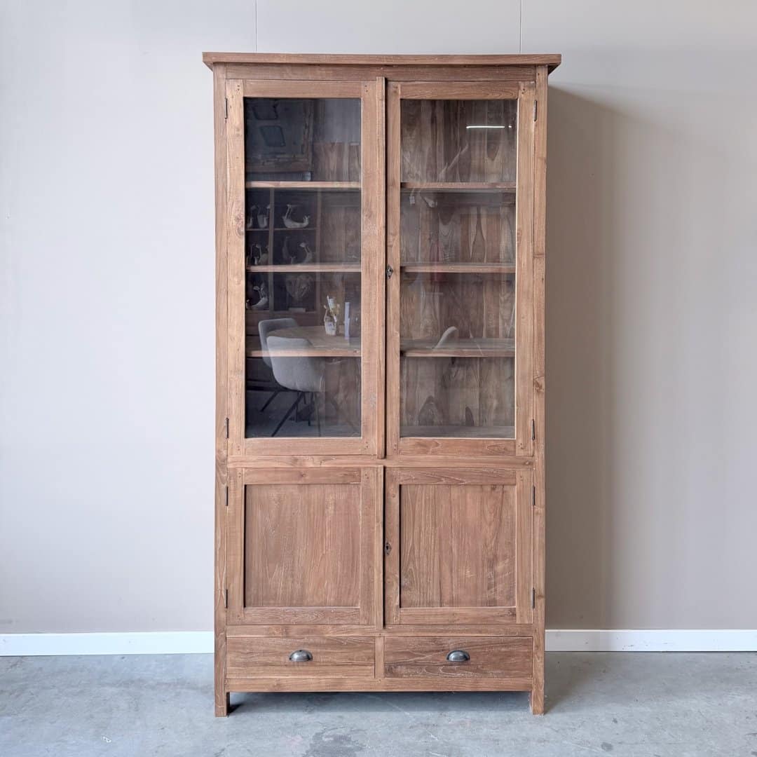 Op zoek naar een robuuste teak houten vitrinekast die karakter toevoegt aan je interieur? De vitrinekast Roosendaal combineert stoere uitstraling met praktische opbergruimte. Deze kast van gerecycled teakhout is verkrijgbaar met dichte deuren of met glazen deuren.
