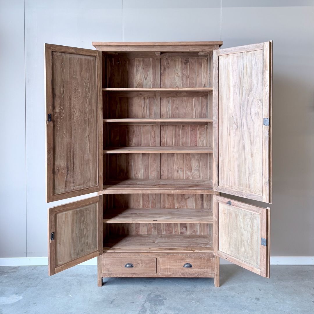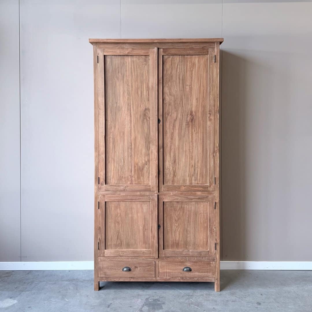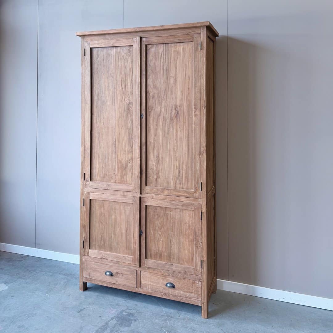 De kast Roosendaal is vervaardigd uit FSC-gecertificeerd gerecycled teakhout. Dit duurzame houtsoort kenmerkt zich door een natuurlijke structuur en warme, authentieke uitstraling. Het robuuste karakter van het teakhout maakt elke kast uniek.