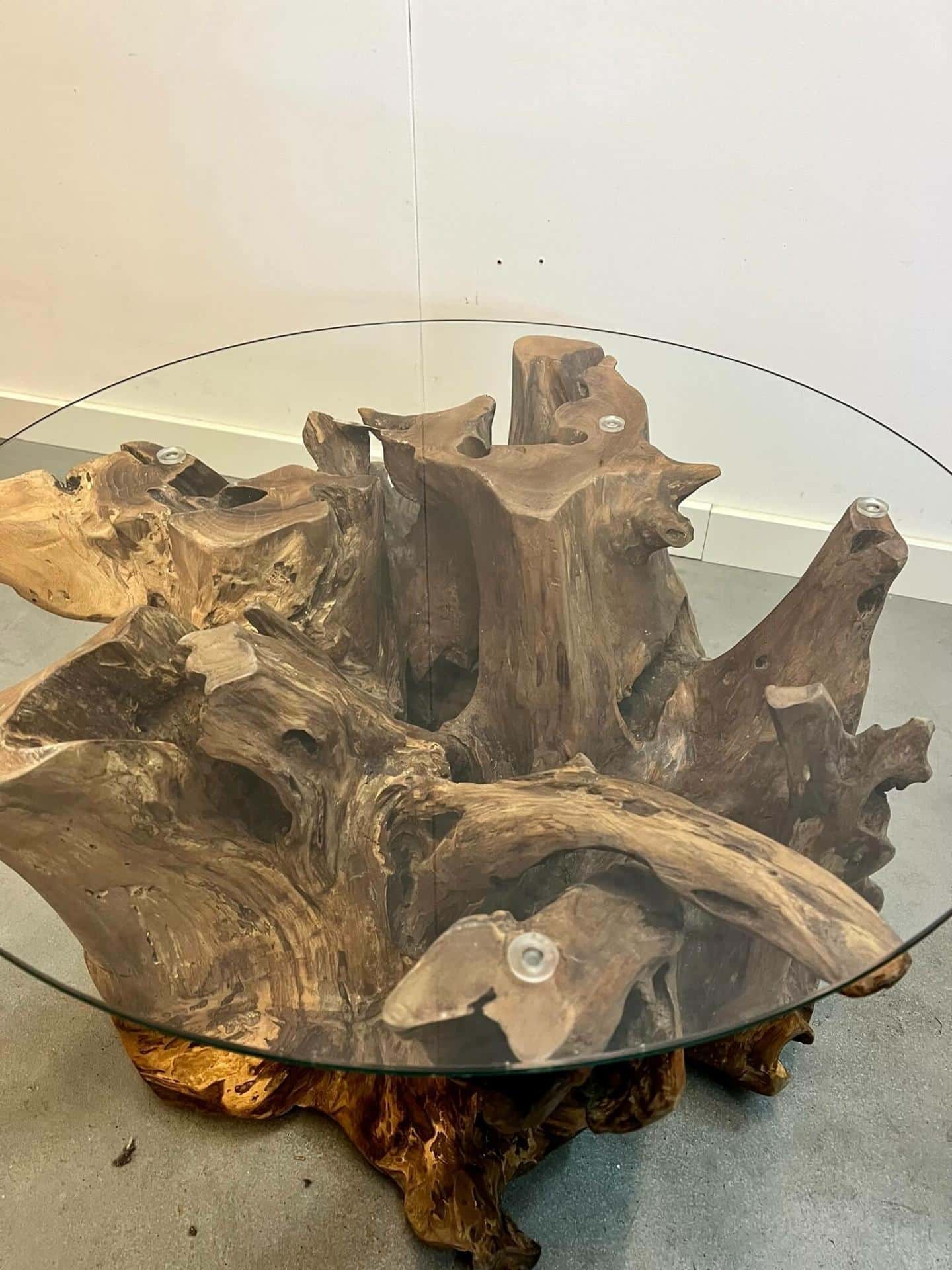 Robuuste salontafel gemaakt van teakhout. Het onderstel is gemaakt van de wortel van een boomstam. De combinatie van het ruwe hout met de glasplaat zorgt voor een elegant geheel.