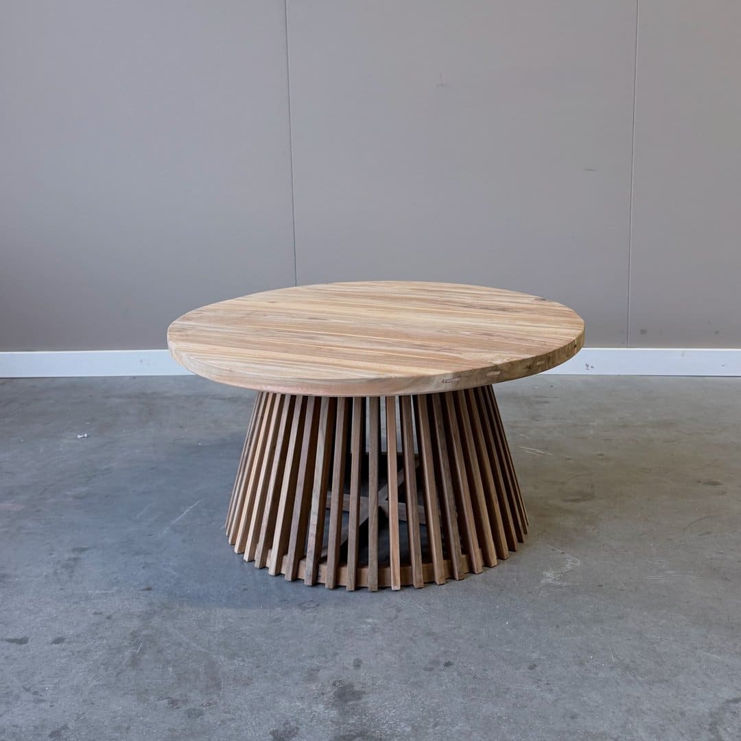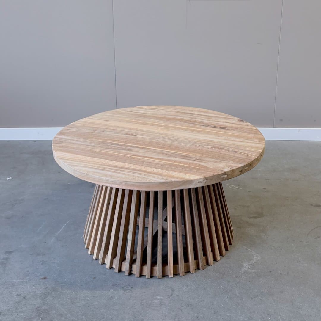 Deze ronde salontafels zijn vervaardigd uit goudgeel plantage teakhout en combineren een warm natuurlijke uitstraling met een eigentijds ontwerp. Het massieve ronde blad rust op een open lattenvoet, wat zorgt voor een luchtig en modern karakter.