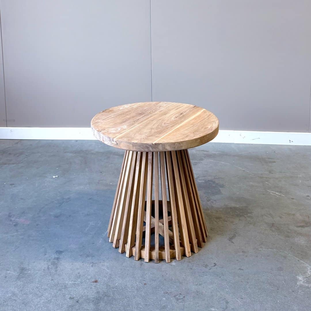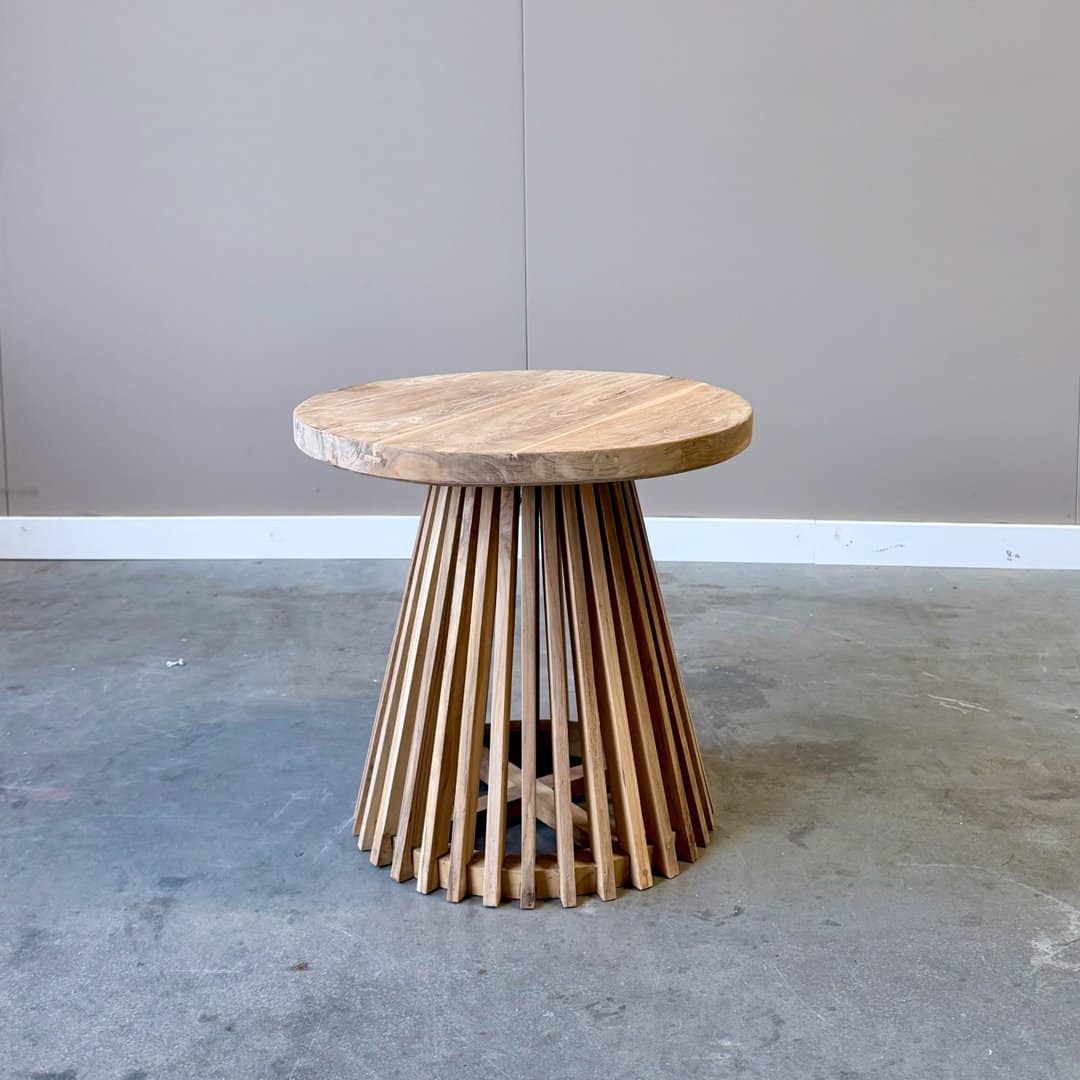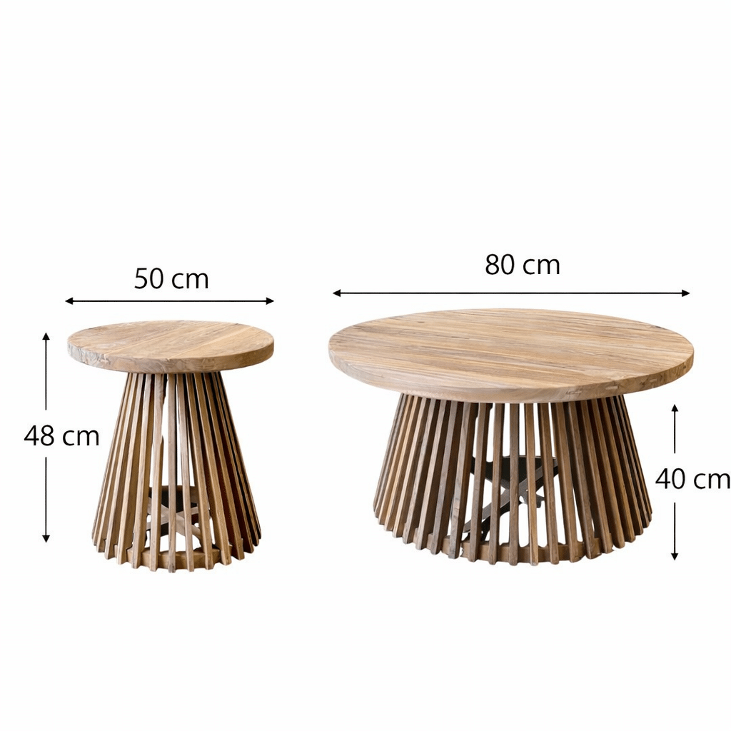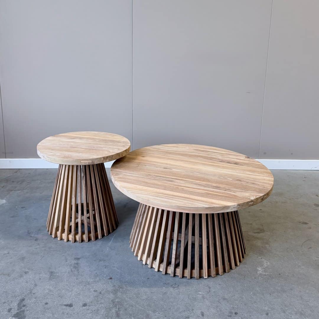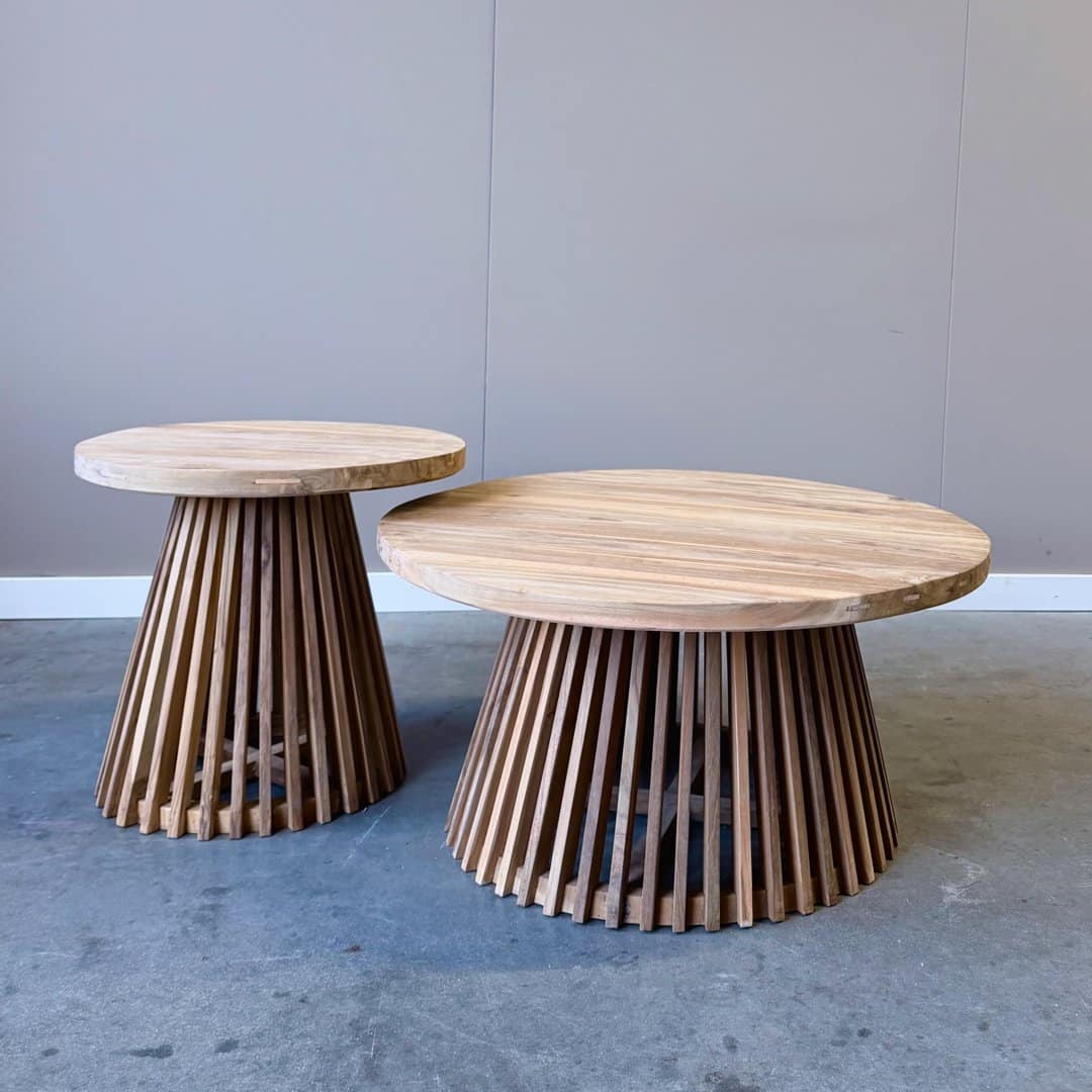 De tafels zijn verkrijgbaar in twee verschillende doorsnedes van 50 cm en 80 cm en kunnen los worden gekocht of als set worden gecombineerd. Ideaal als salontafel, bijzettafel of als speels duo in de zithoek. Dankzij het gebruik van duurzaam plantage teakhout is elke tafel uniek in kleur en houttekening.