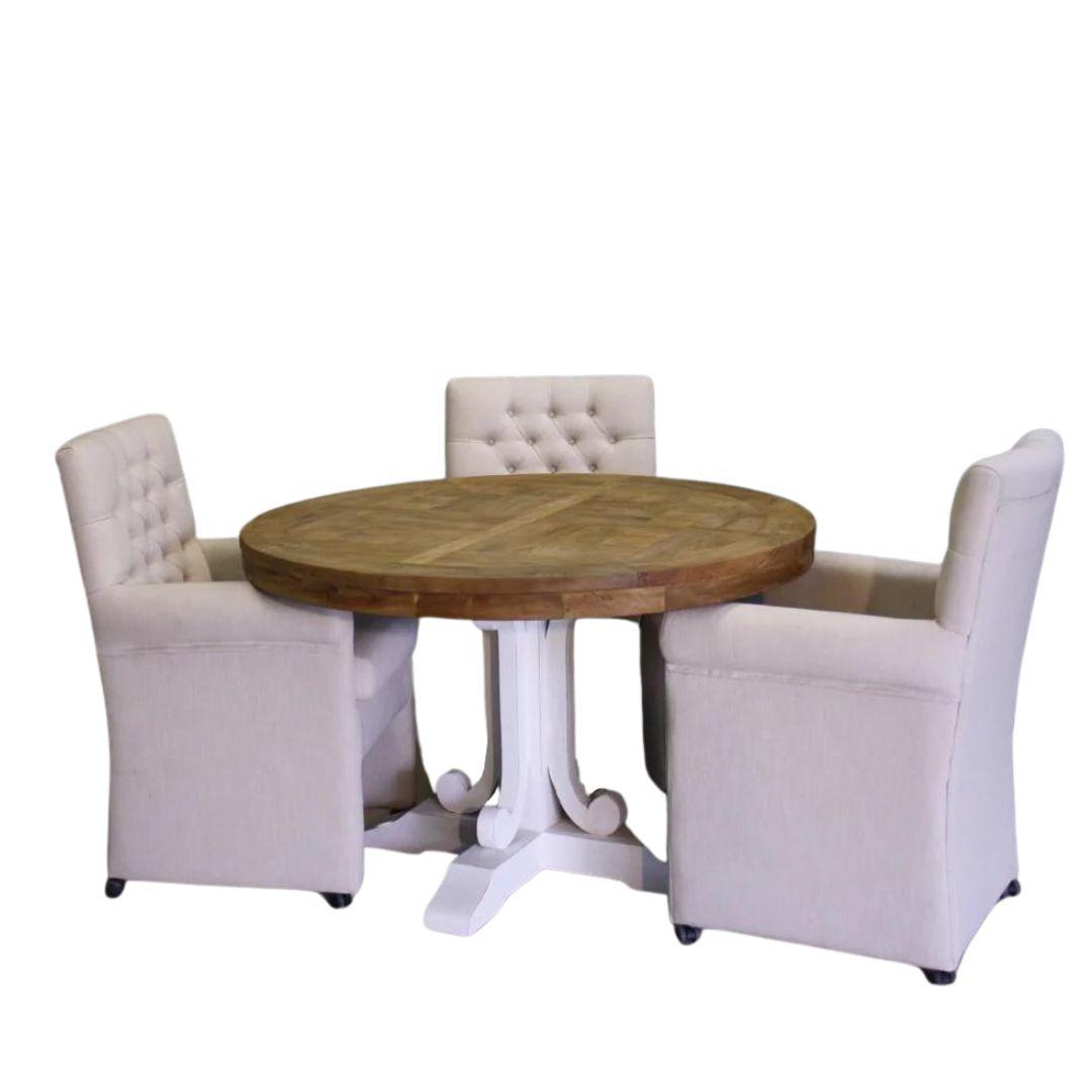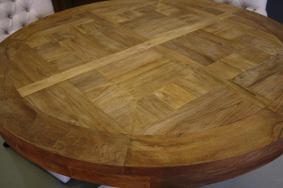 Ronde tafel met witte poot die licht is doorgeschuurd. Het blad is fraai ingelegd.