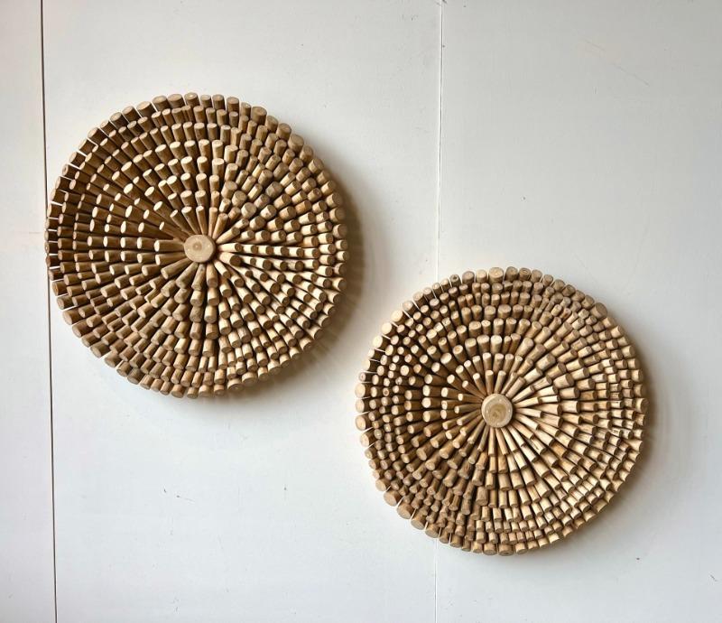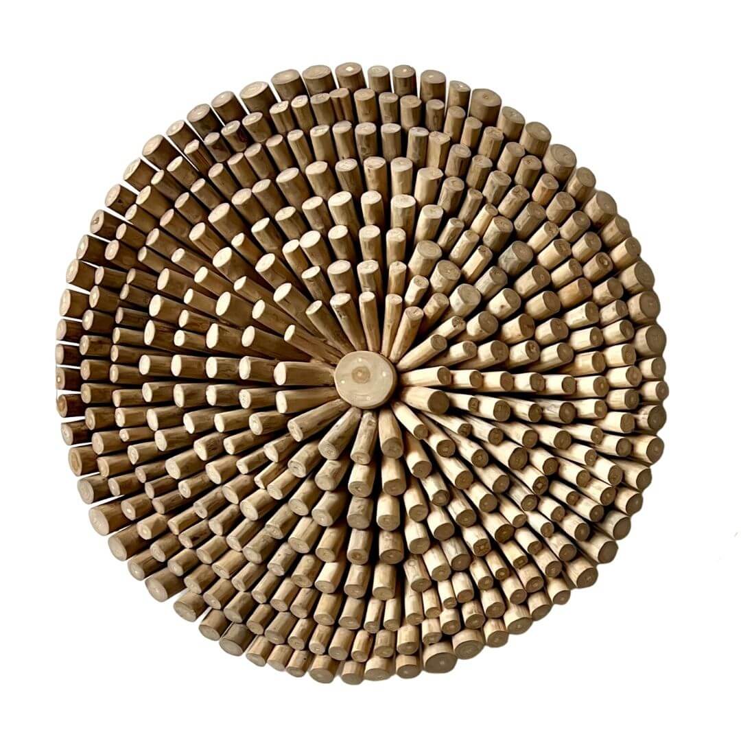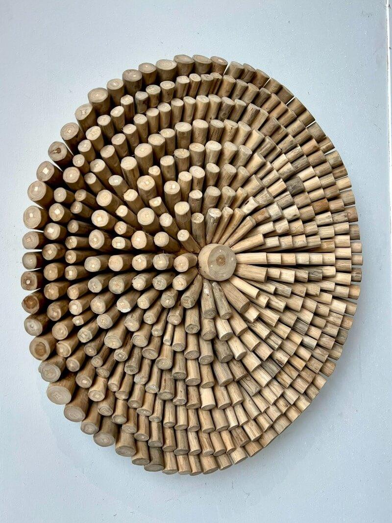 Handgemaakte wand decoratie. Dit ronde wandpaneel geeft uw interieur een unieke touch. Dit paneel wordt bevestigd aan de muur doormiddel van twee schroeven.