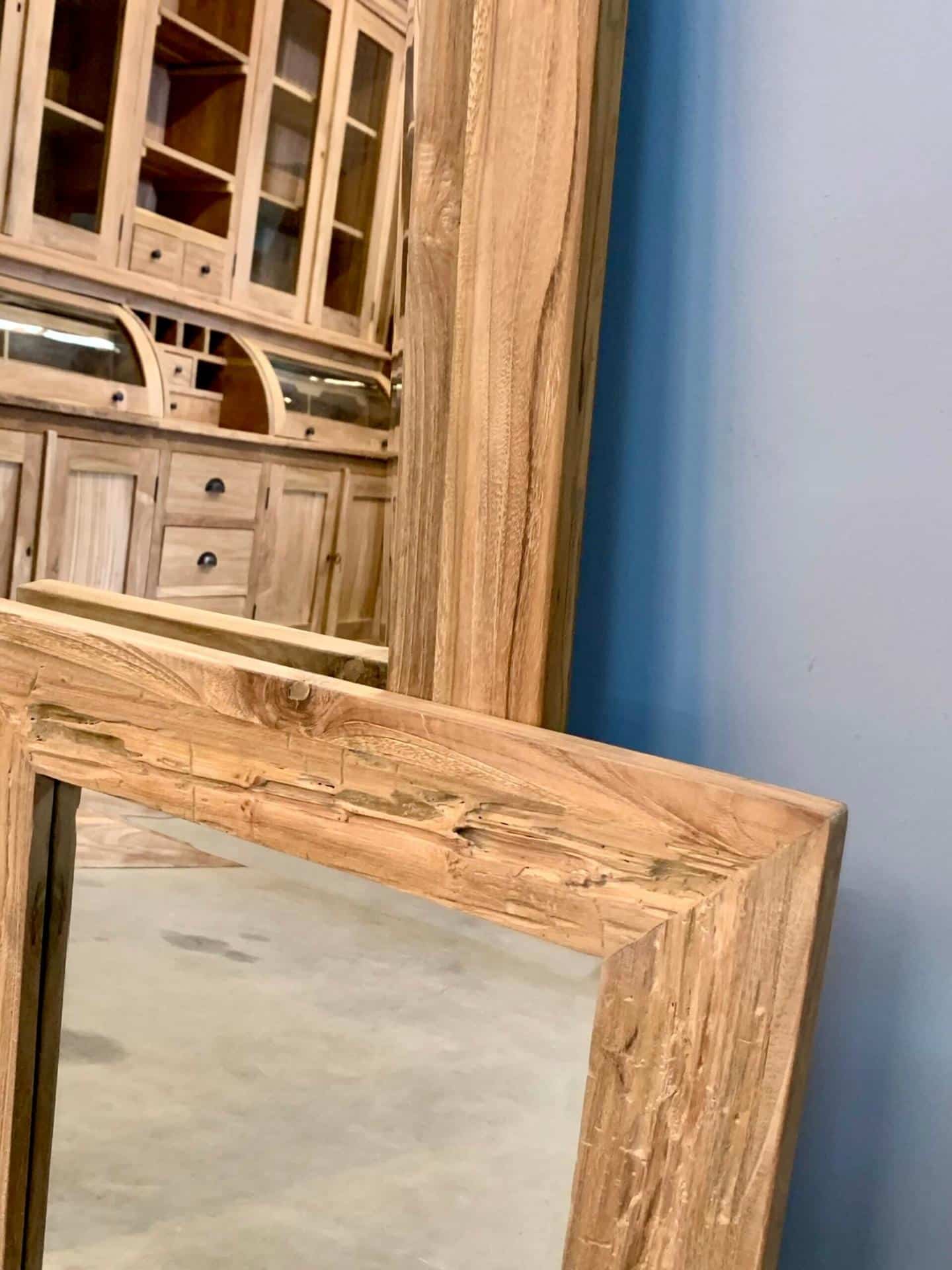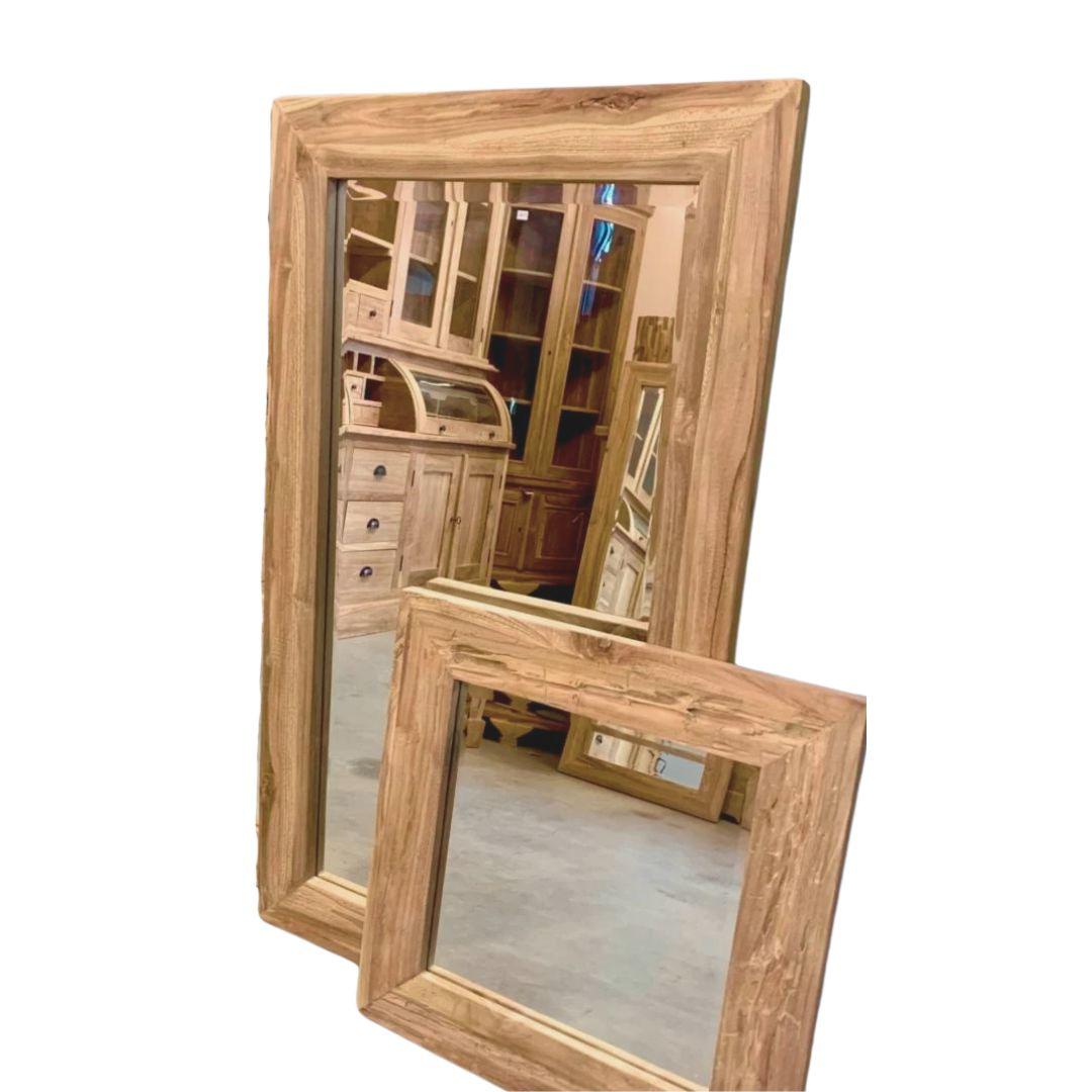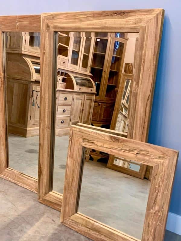 Spiegels met een rustieke teakhouten lijst. Het glas is facet geslepen.