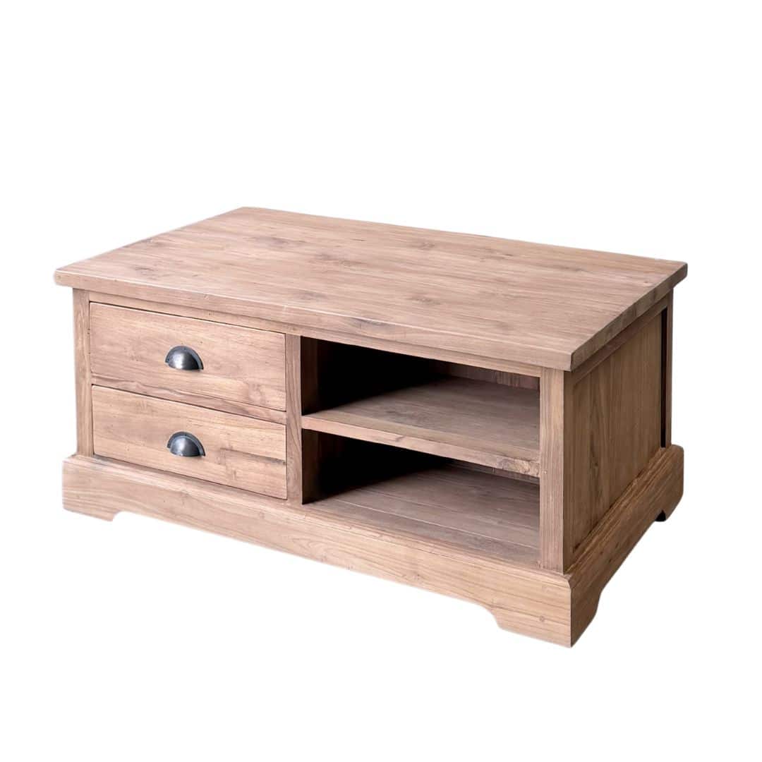 Deze salontafel is vervaardigd uit massief gerecycled teakhout en combineert een warme, landelijke uitstraling met praktisch gebruiksgemak. Het tafelblad benadrukt het natuurlijke karakter van het teakhout, waarbij iedere tafel uniek is door zijn eigen houttekening en kleurnuances.