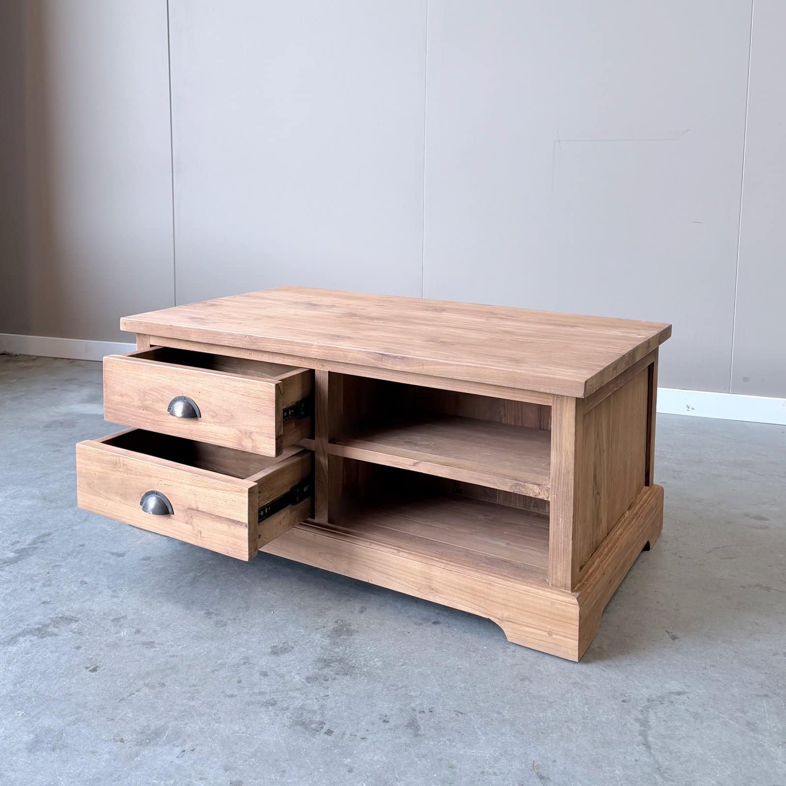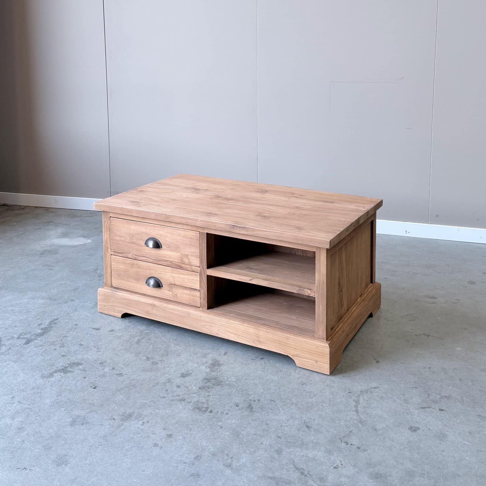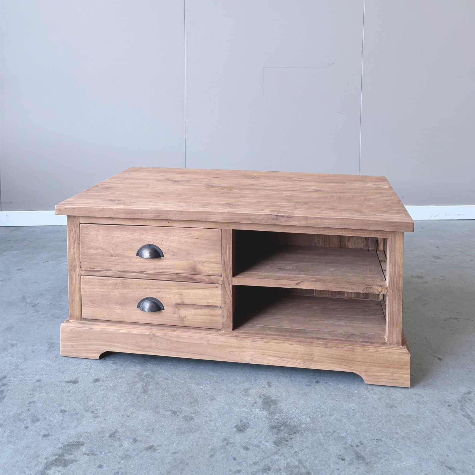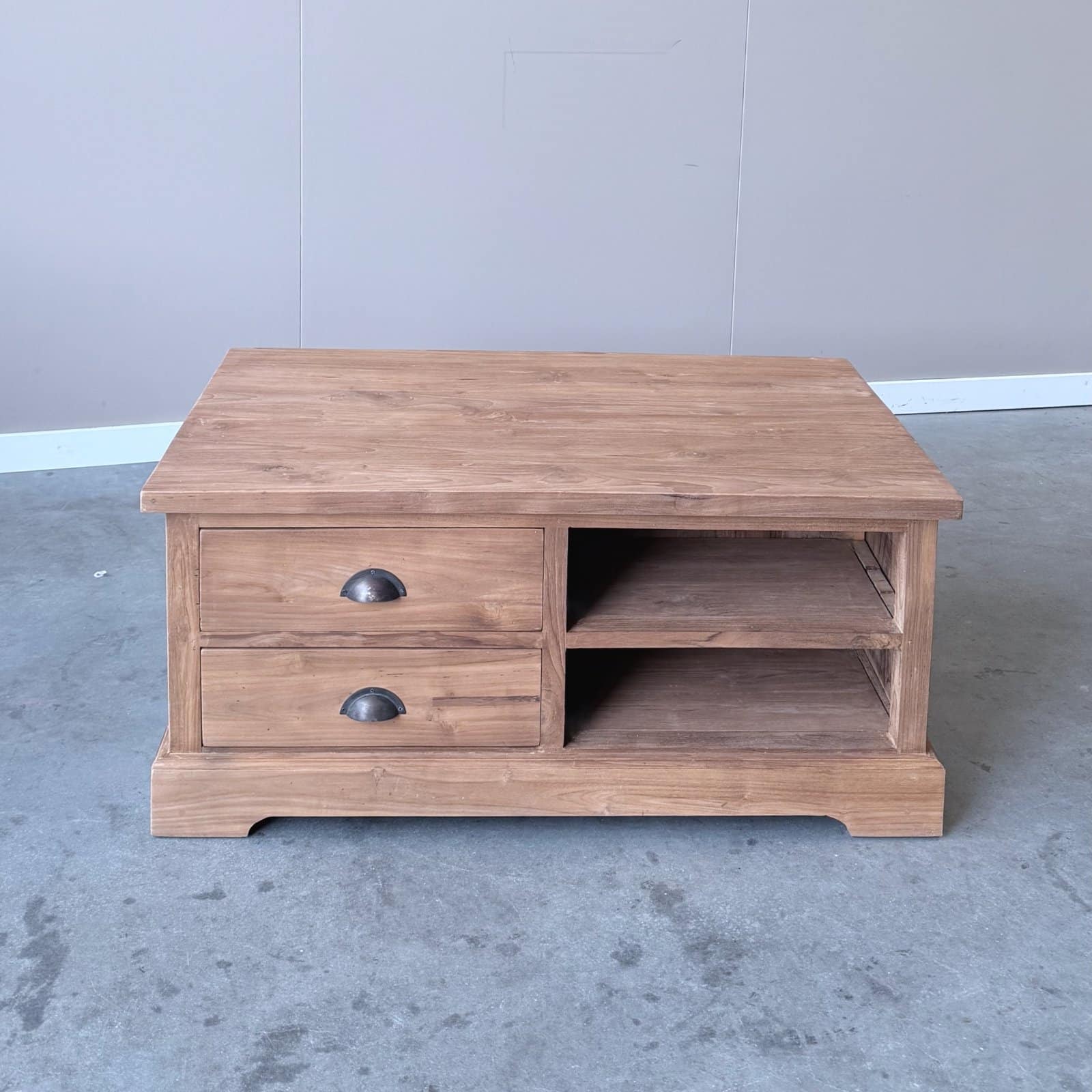 Deze salontafel is vervaardigd uit massief gerecycled teakhout en combineert een warme, landelijke uitstraling met praktisch gebruiksgemak. Het tafelblad benadrukt het natuurlijke karakter van het teakhout, waarbij iedere tafel uniek is door zijn eigen houttekening en kleurnuances.