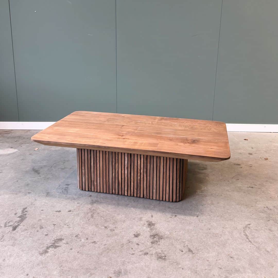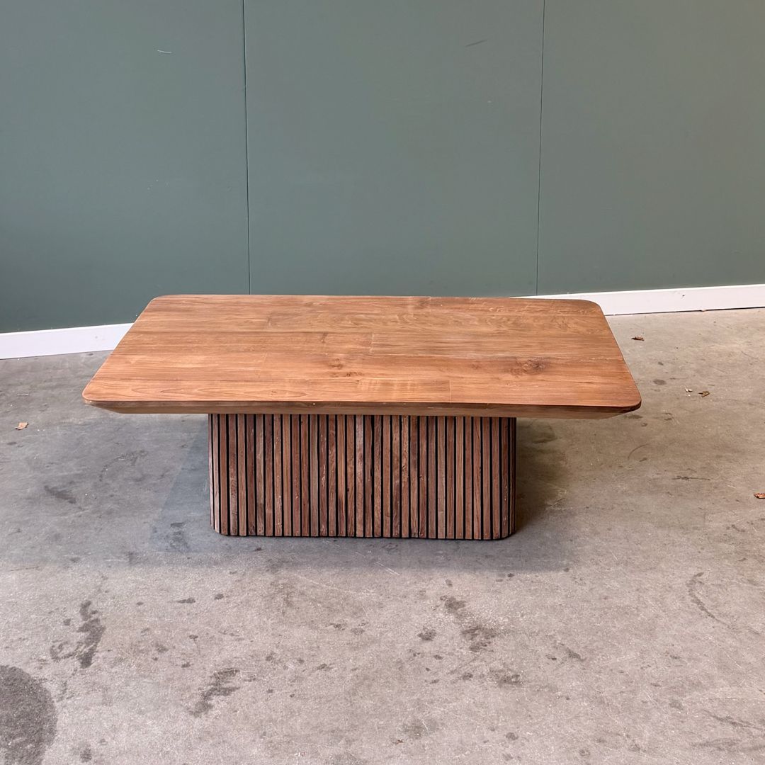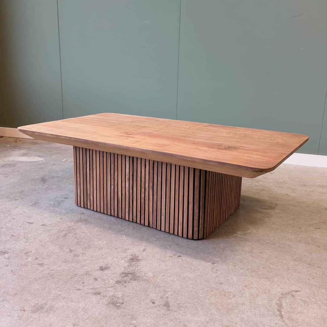 De stevige poot is uitgevoerd in de populaire lattenstructuur, een stijlvol en eigentijds ontwerp dat je vaak terugziet in luxe interieurs. Dit geeft de tafel niet alleen een moderne uitstraling, maar maakt hem ook een echte blikvanger in de woonkamer.
