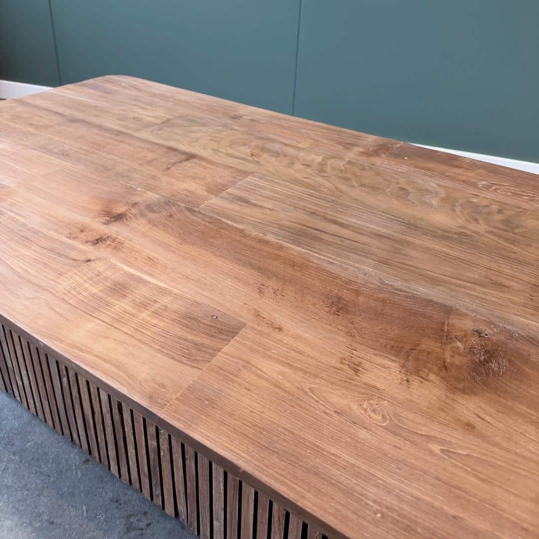 Wat jong teak bijzonder maakt, is de prachtige goudgele kleur en de rustige, egale uitstraling. Het hout heeft minder sporen van een vorig leven dan gerecycled teak en oogt daardoor strak en modern. Perfect voor wie houdt van een frisse, eigentijdse stijl. Voordat het hout verwerkt wordt, wordt het zorgvuldig geselecteerd en gedroogd. Dit helpt om de werking van het hout zoveel mogelijk te beperken en zorgt voor een stevig en duurzaam meubel.