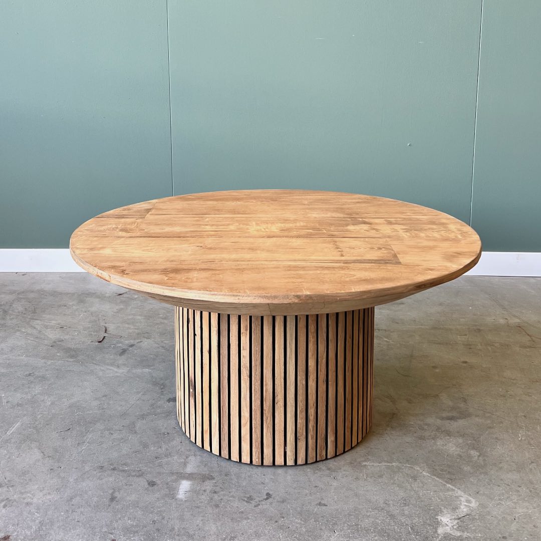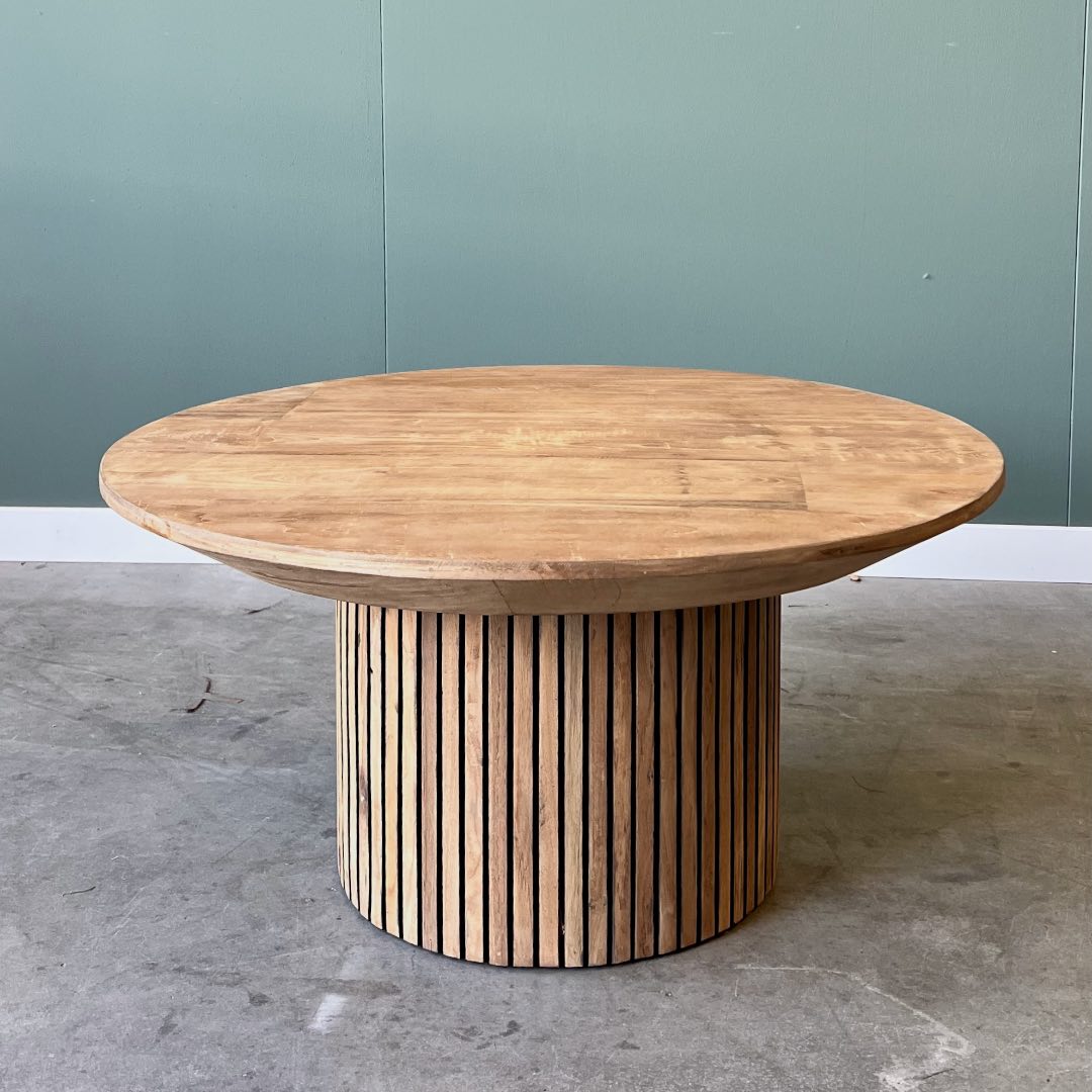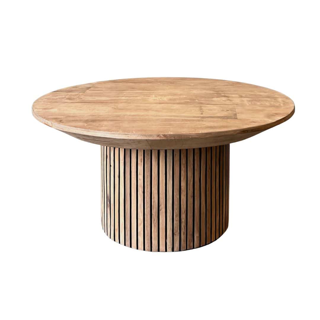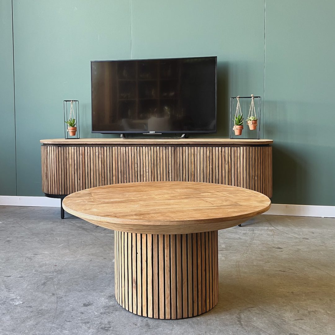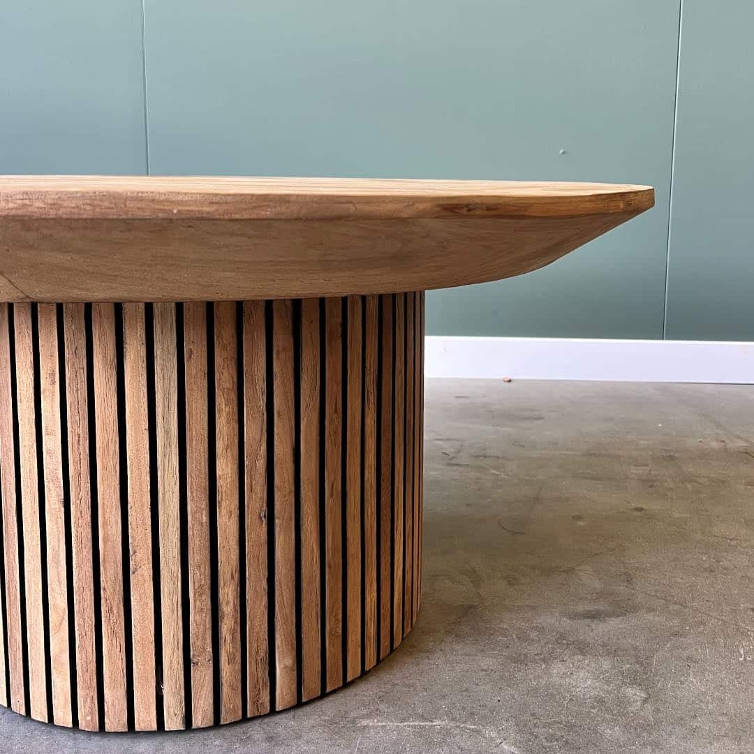 De salontafel Curve combineert zachte rondingen met een strak lattenpatroon voor een stijlvol en eigentijds design. Gemaakt van hoogwaardig gerecycled teakhout straalt dit meubel warmte, karakter en vakmanschap uit.