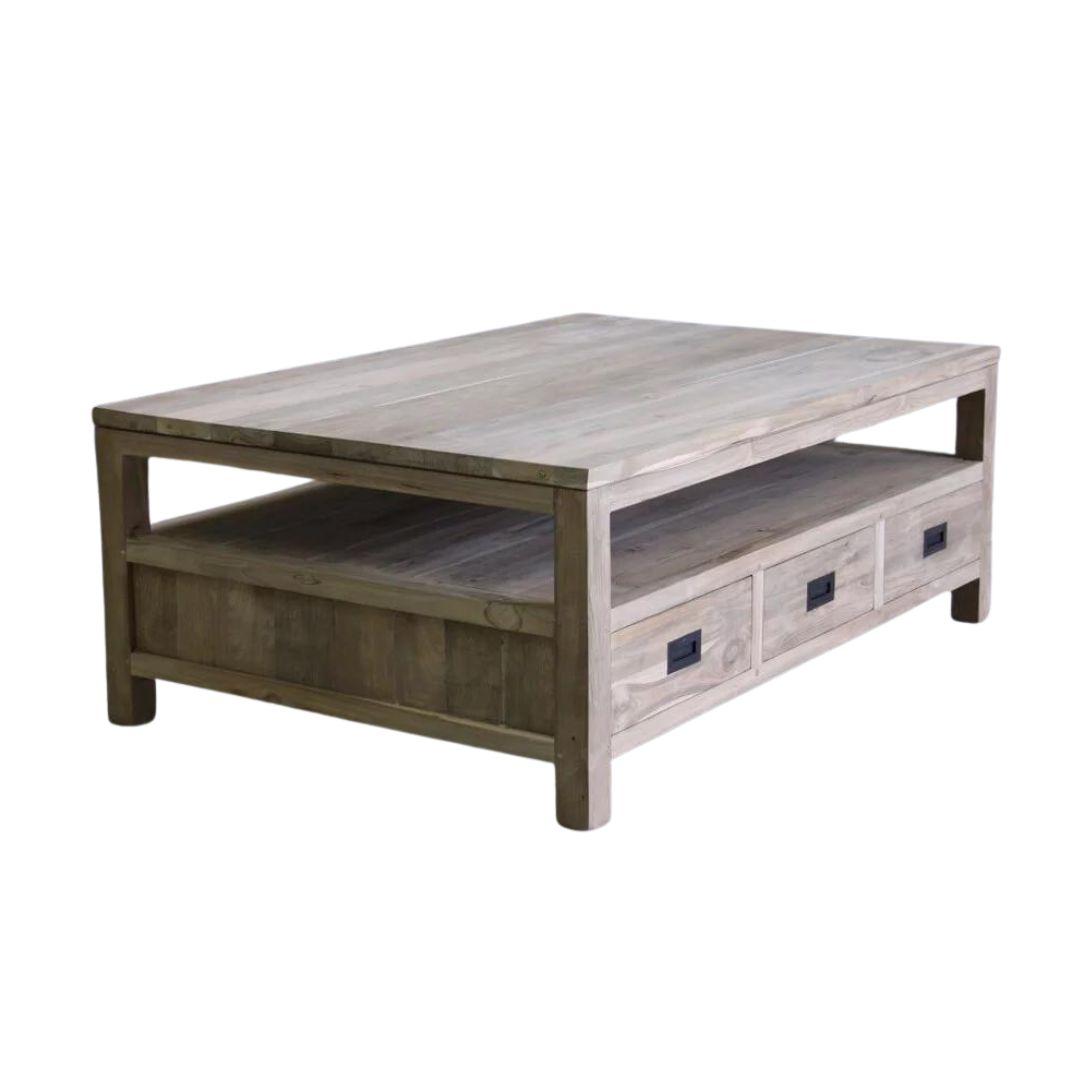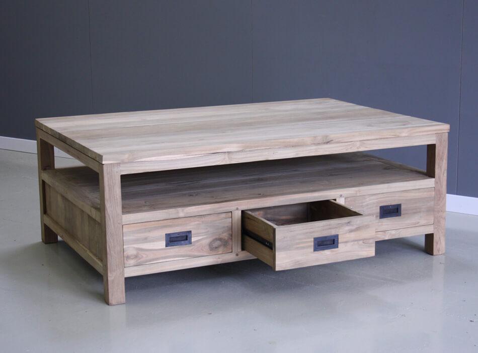 Schitterende salontafel met laden en een plank voor tijdschriften of andere spulletjes. De laden zijn voorzien van ijzeren geleiders.