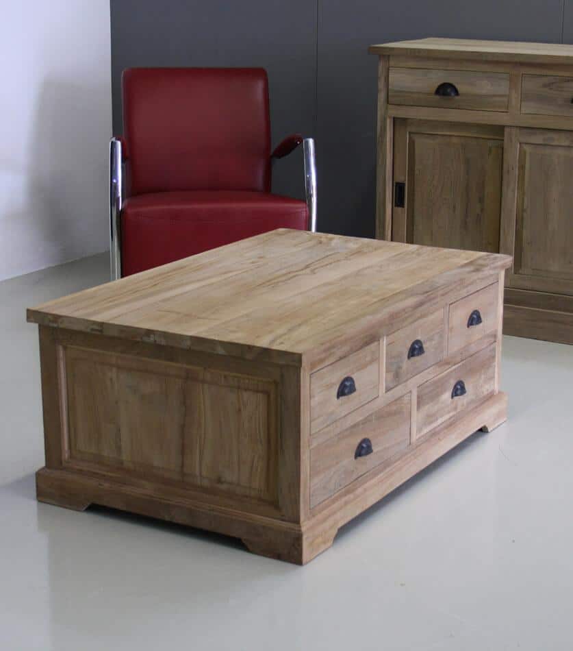 Salontafel van teakhout met 10 fijne laden. Erg veel opbergruimte door de vele laden.