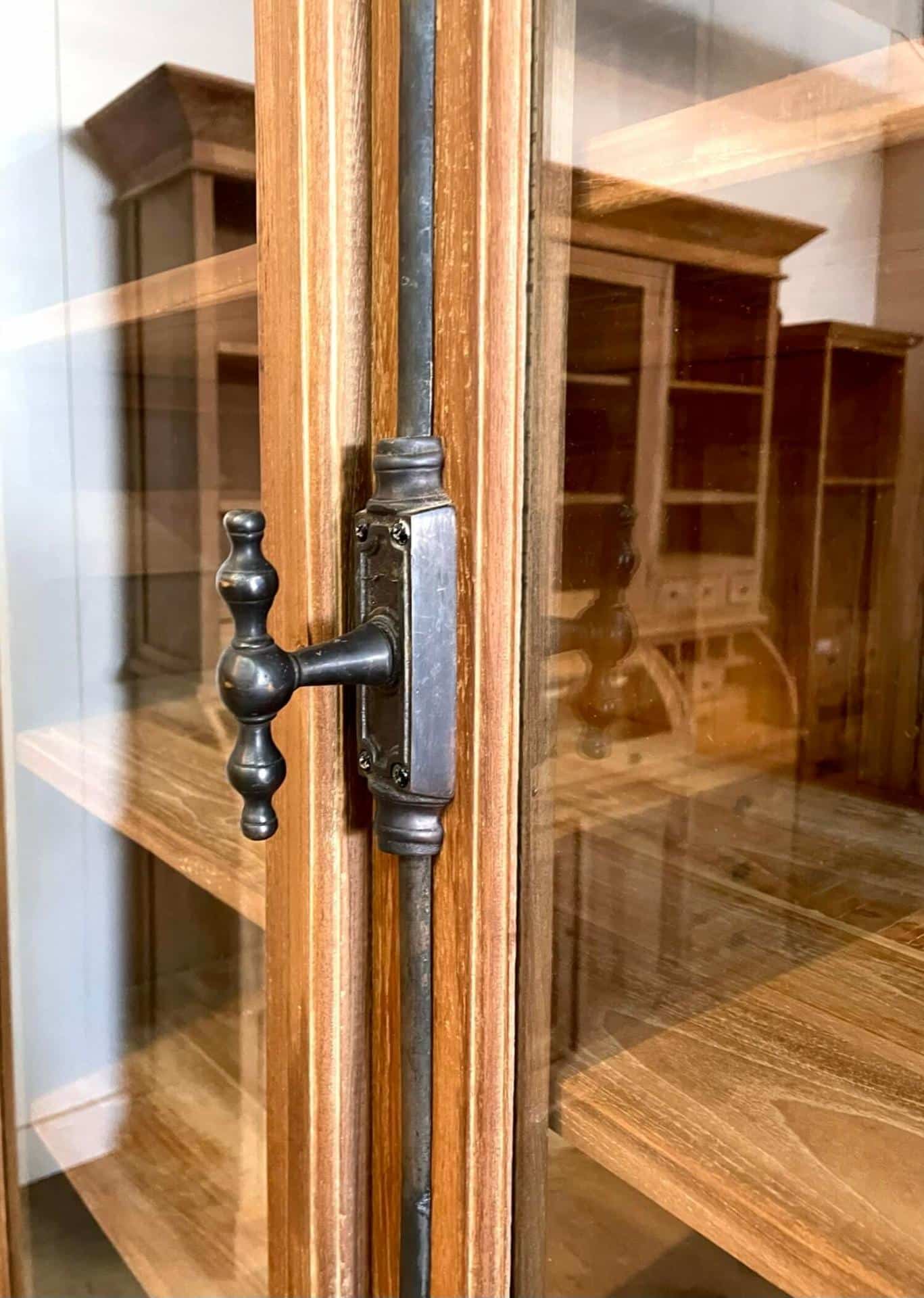 De kast is uitgevoerd met spanjolet sluitingen, het traditionele beslag dat je ook op oude boerenkasten terugvindt. Deze klassieke sluitingen geven de kast een tijdloze, ambachtelijke uitstraling en zorgen ervoor dat deuren stevig gesloten blijven.