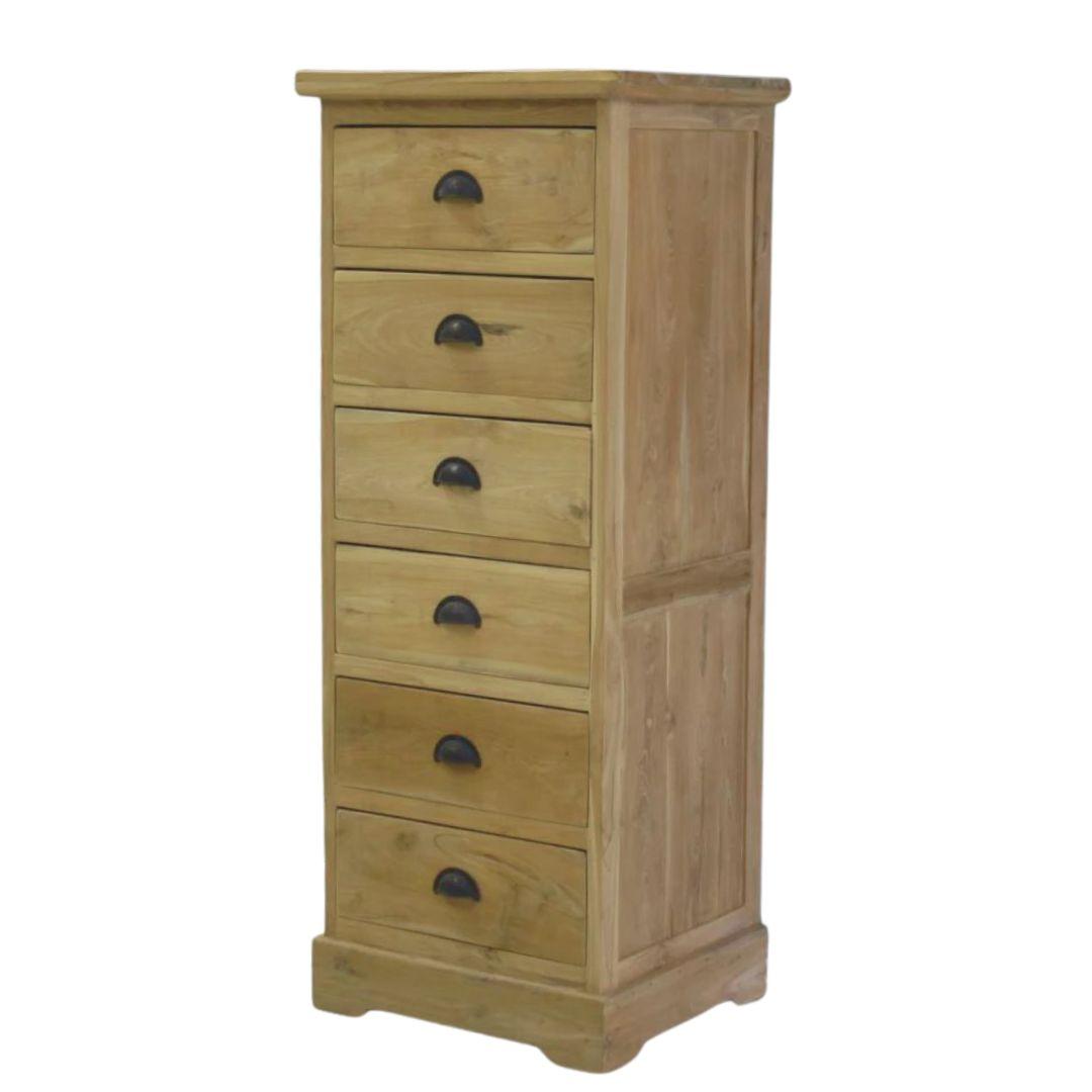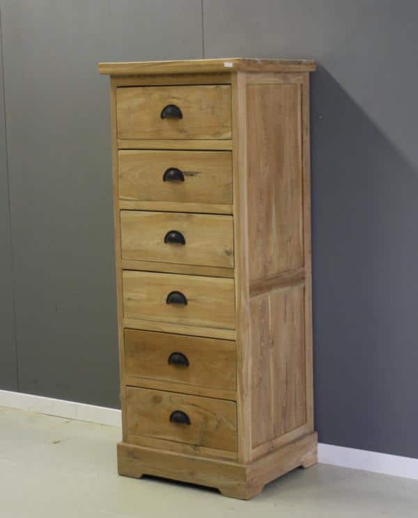 Deze smalle ladenkast van teakhout straalt warmte uit door de houtnerf en het slanke ontwerp. De kast is ideaal voor kleinere ruimtes, terwijl de laden voldoende opbergruimte bieden voor allerlei spullen.