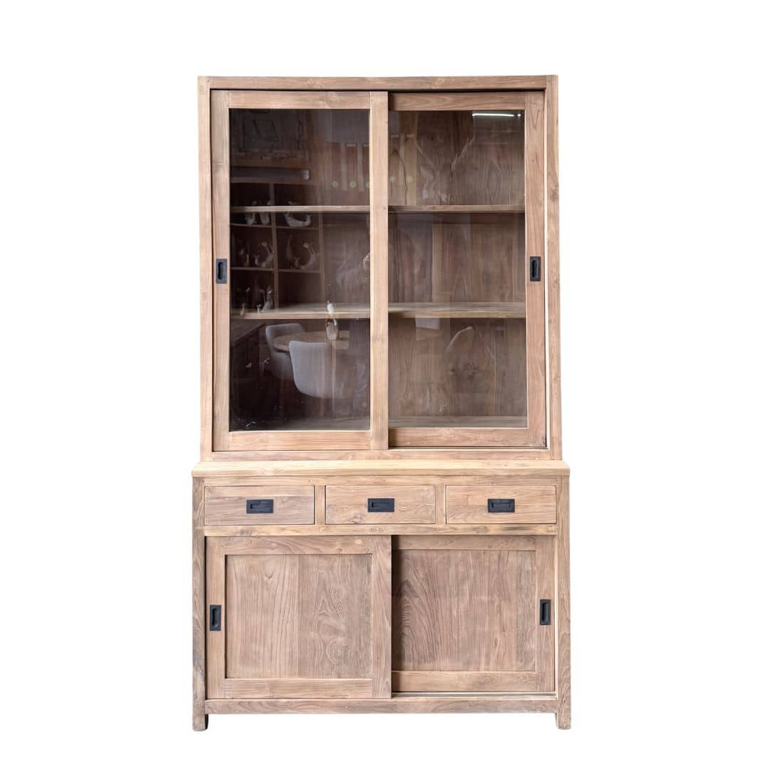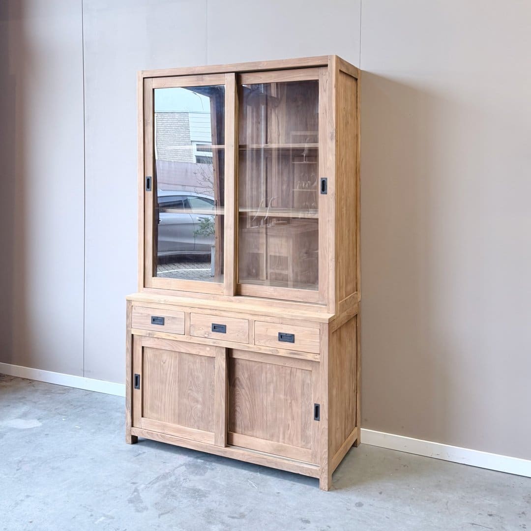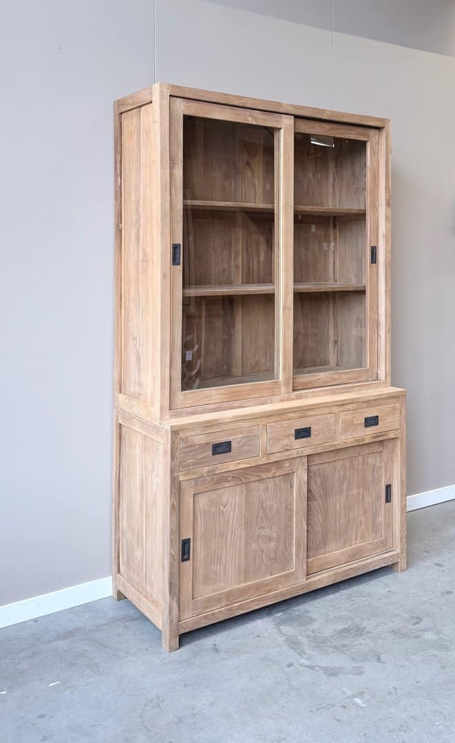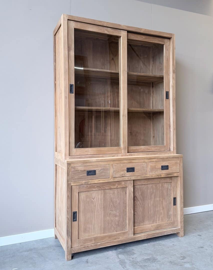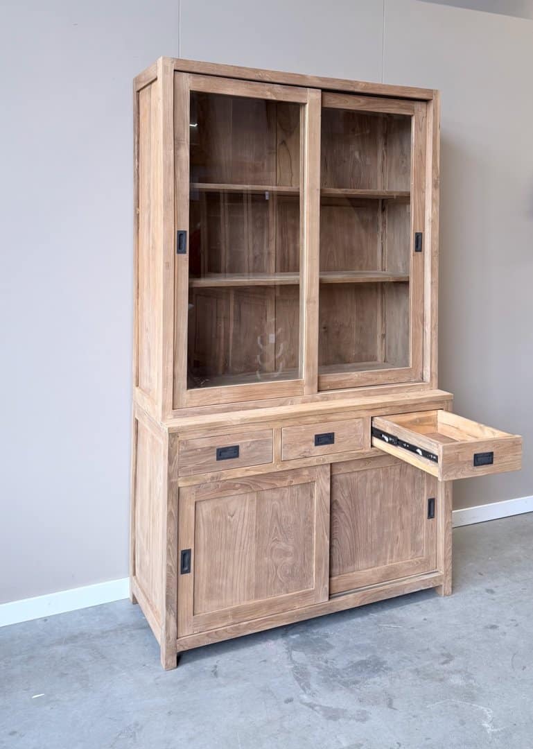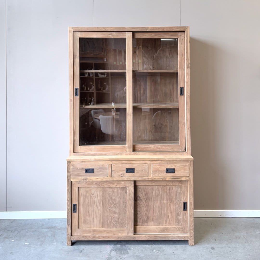 Het gerecyclede teakhout zorgt voor een warme, natuurlijke uitstraling met zichtbare houttekeningen. Door de rustige vormgeving kan de kast eenvoudig worden afgestemd op de ruimte met persoonlijke items en decoratieve accenten.