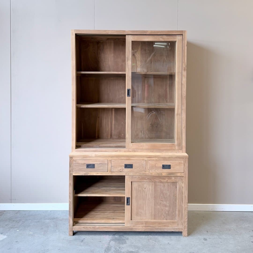 Het bovenste gedeelte is voorzien van glazen schuifdeuren met daarachter legplanken voor servies, glaswerk of persoonlijke accessoires. Het onderste deel heeft houten schuifdeuren, open vakken en drie lades. De lades en deuren bewegen soepel dankzij de geleiding op rails, wat bijdraagt aan dagelijks gebruiksgemak.