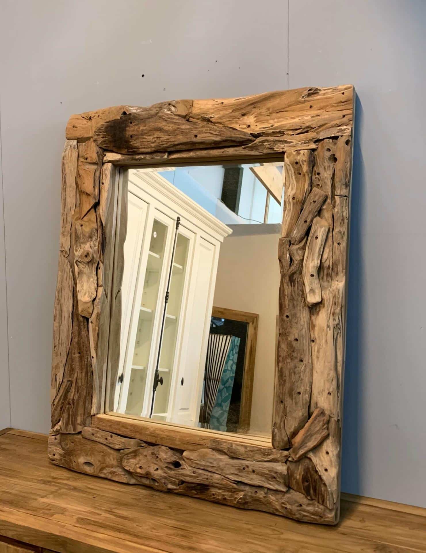 Diverse maten spiegels met een lijst gemaakt van drijfhout. Hierdoor is elke spiegel uniek.