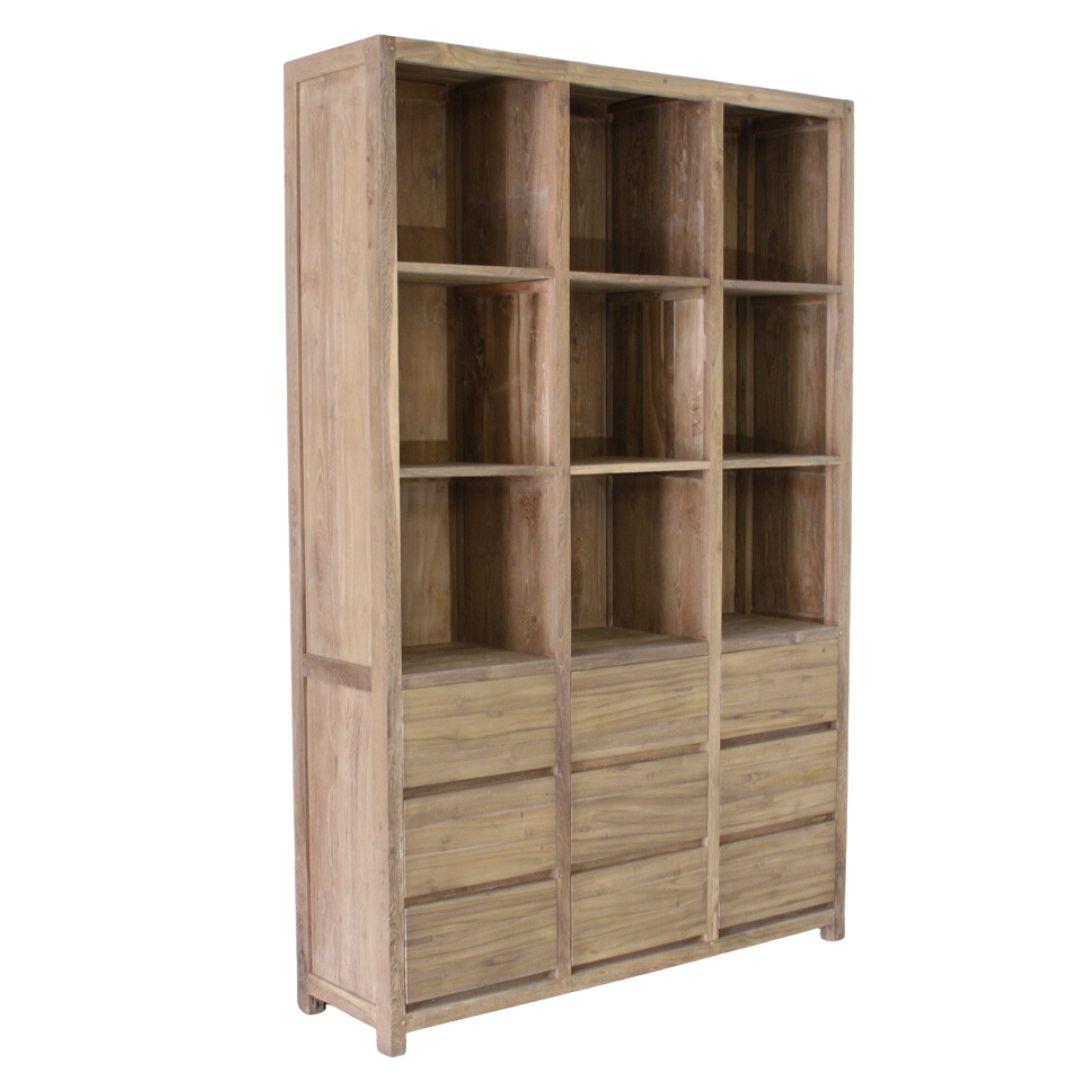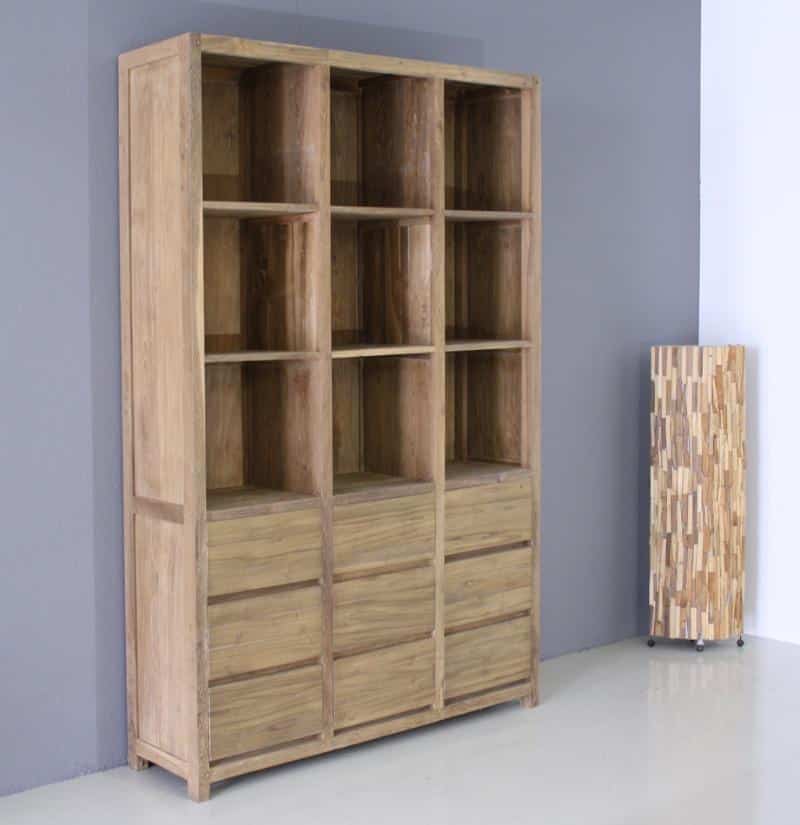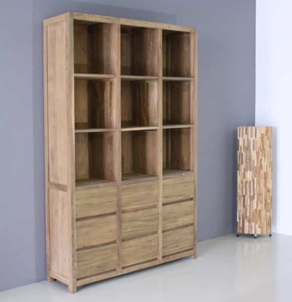 Strakke moderne boekenkast met 9 vakken en 9 laden. Gemaakt van uitstekende kwaliteit hergebruikt teakhout.