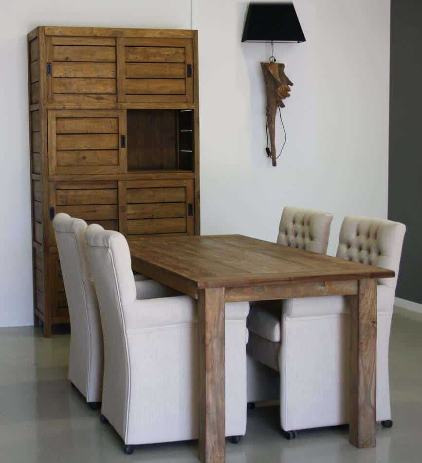 Gerecycled teakhout is afkomstig uit oude slooppanden. De panden worden gesloopt en het hout wordt verzameld en klaargemaakt voor hergebruik. Dit betekend dat spijkers verwijderd worden en oude verfresten worden eraf geschuurd. De gaatjes worden opgevuld en het hout is nu klaar voor verder gebruik. Soms kan het voorkomen dat er aan de binnenkant of achterkant van het meubel nog verfresten zitten. Dit zorgt er dus voor dat elk meubelstuk uniek is, ondanks dat het model wel het zelfde is. Verder is gerecycled teakhout beter voor het milieu. Er worden namelijk geen bomen gekapt. Daarnaast zal het hout minimaal gaan werken. Houd er rekening mee dat het een natuurlijk product is en er dus altijd kans is dat het wel zal gaan werken.
