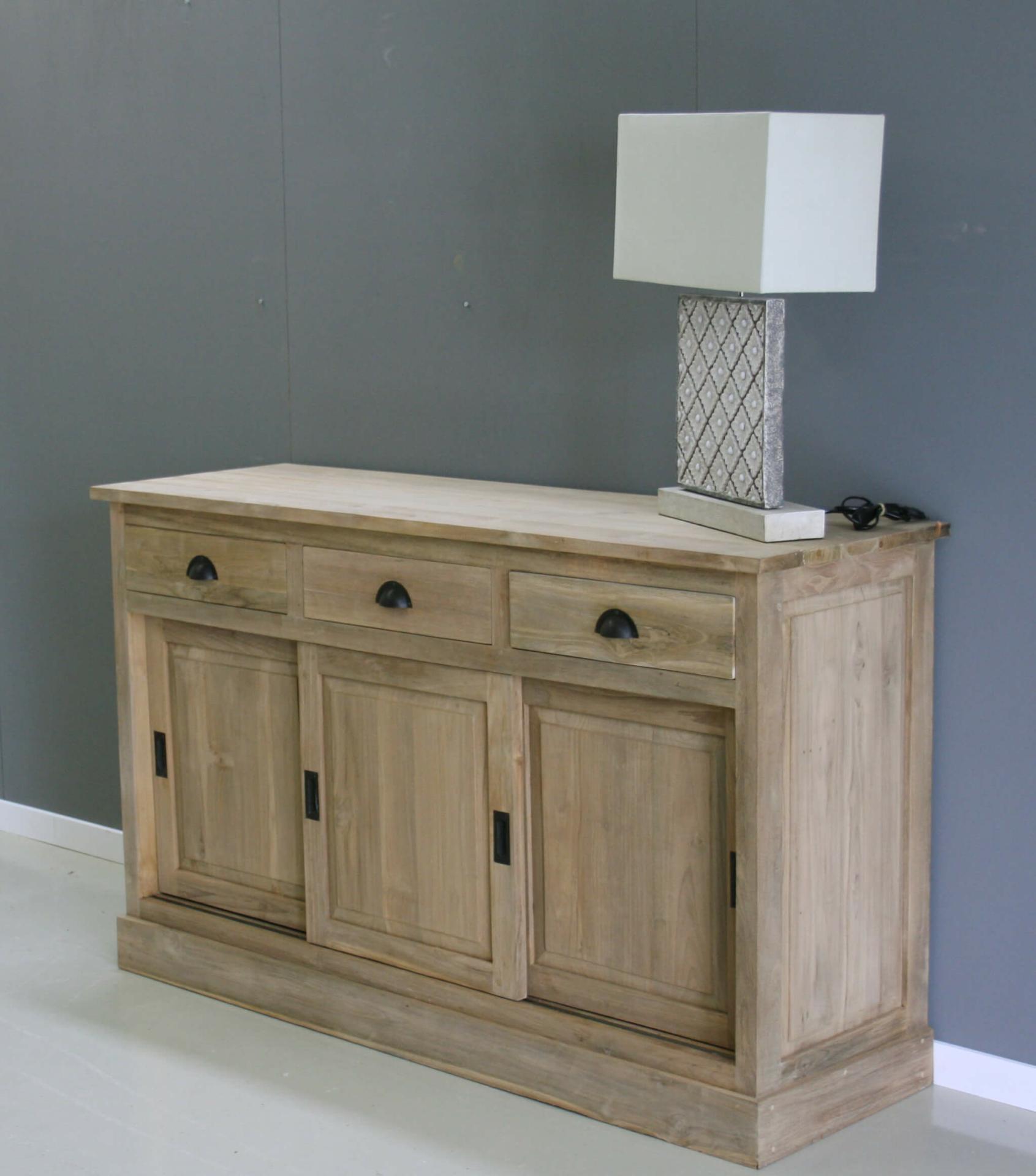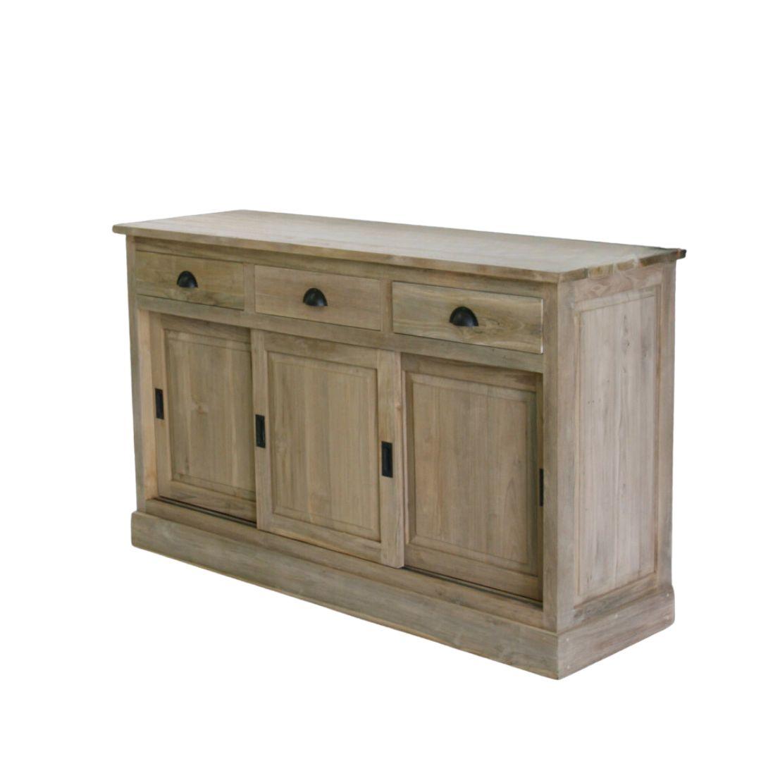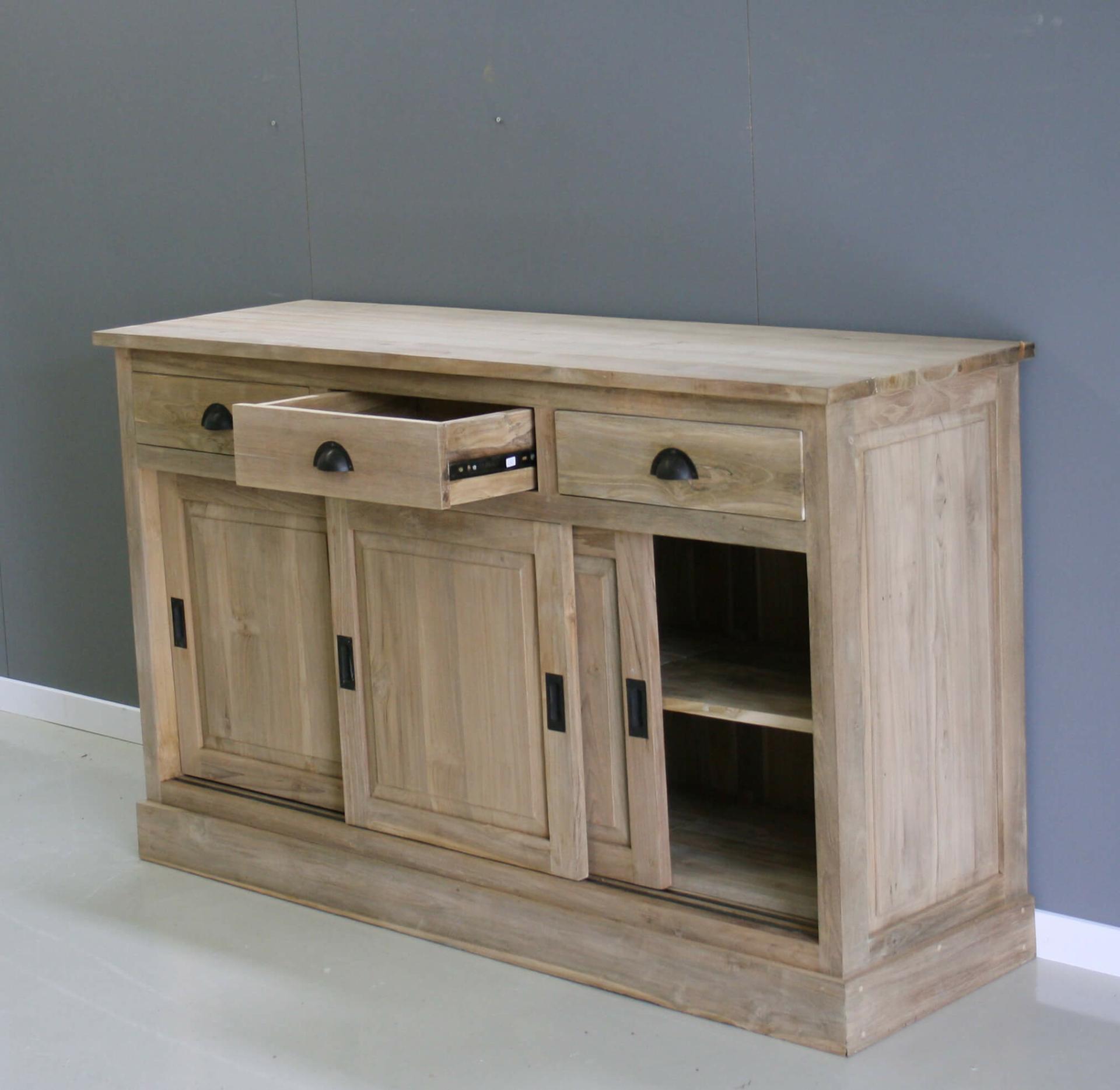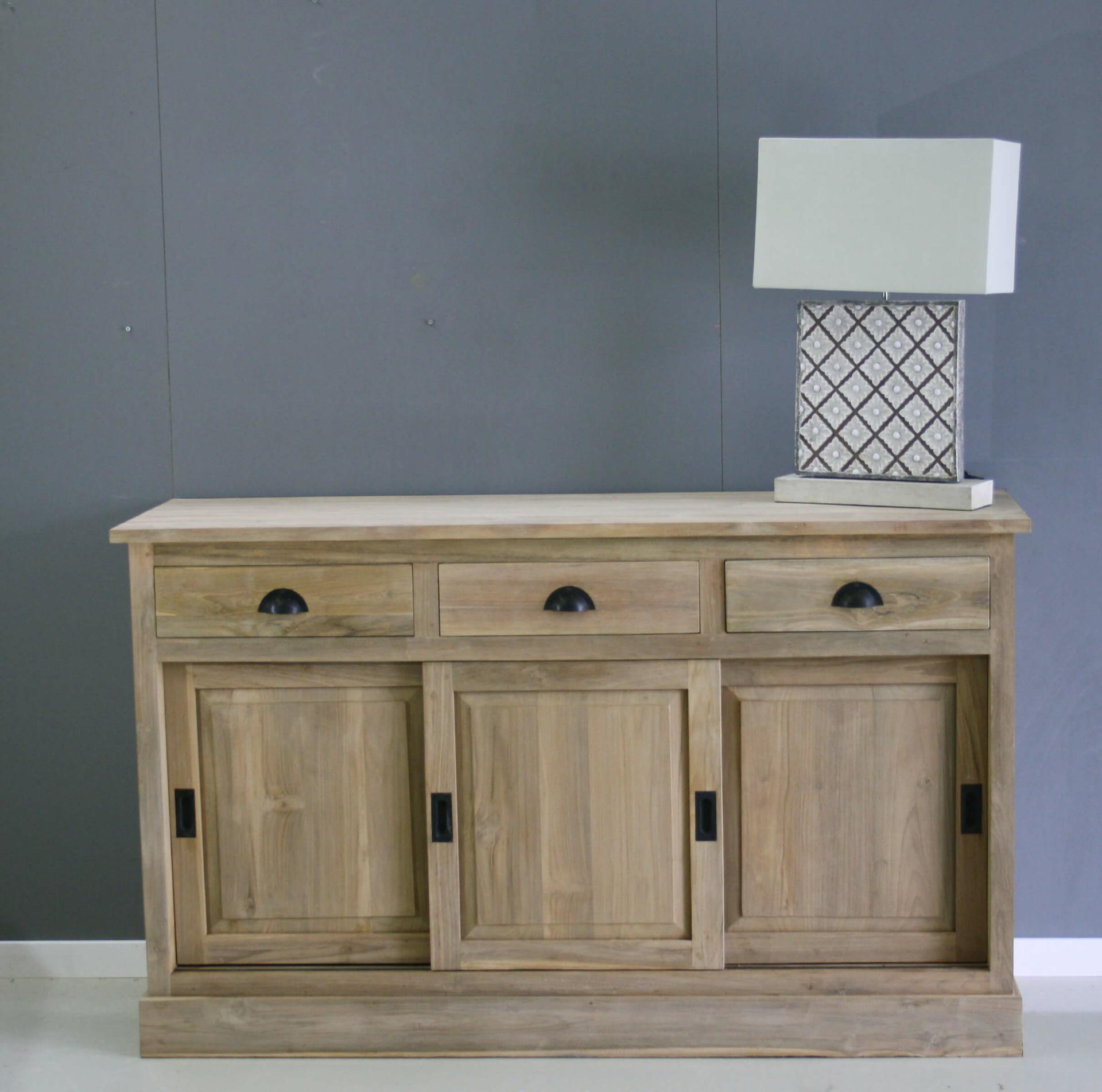 Heel charmant dressoir met schuifdeuren en laden. De deuren en laden lopen soepel op een metalen rail. Het dressoir is gemaakt van gerecycled teakhout en glad afgewerkt.