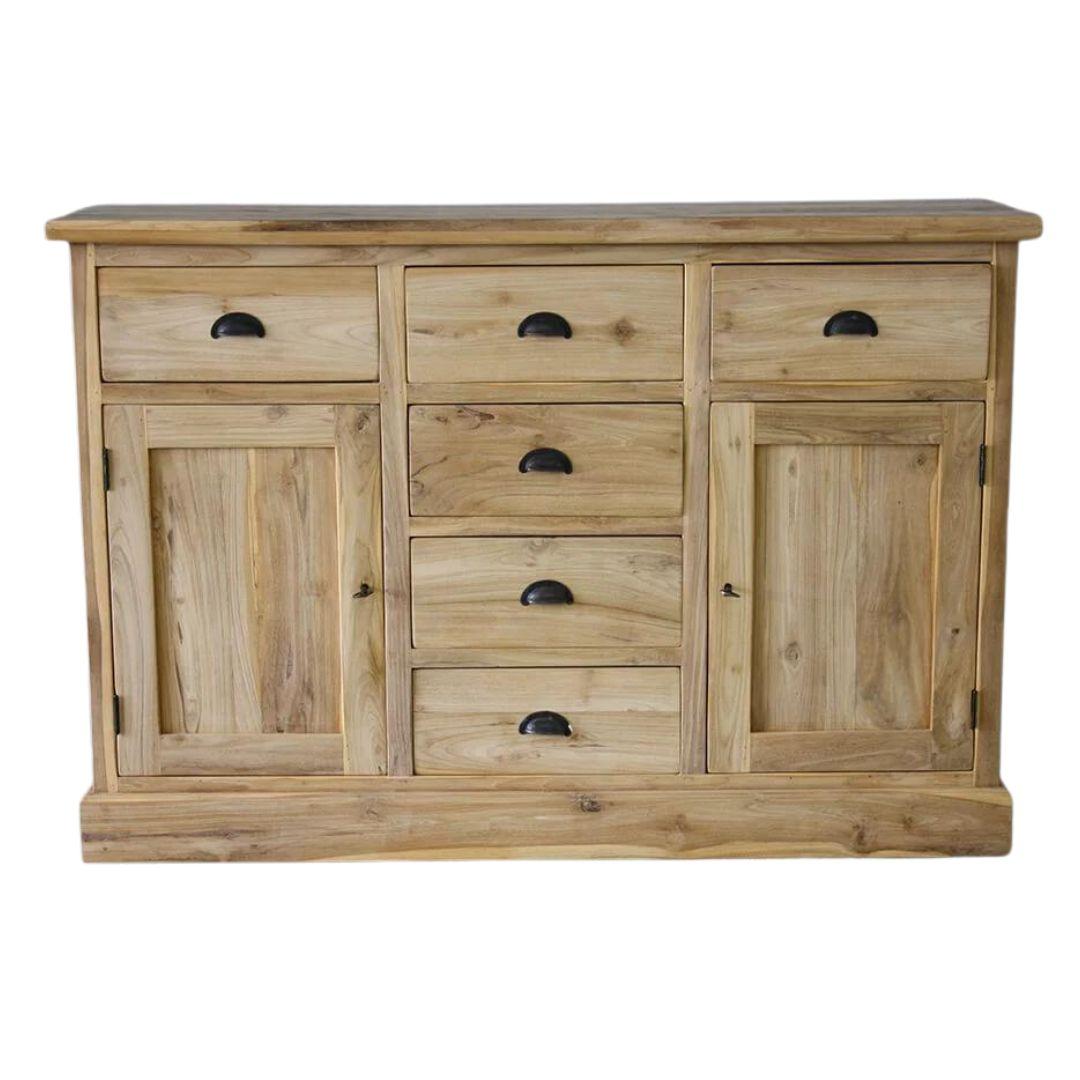 Klein teak dressoir met zes laden en twee deuren. De laden lopen niet op geleiders, achter de deuren zit een legplank.