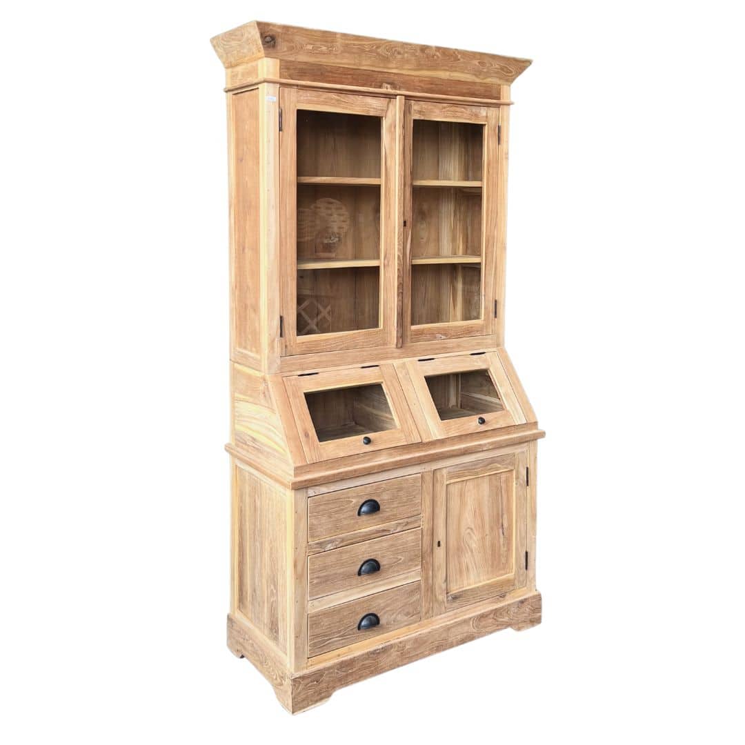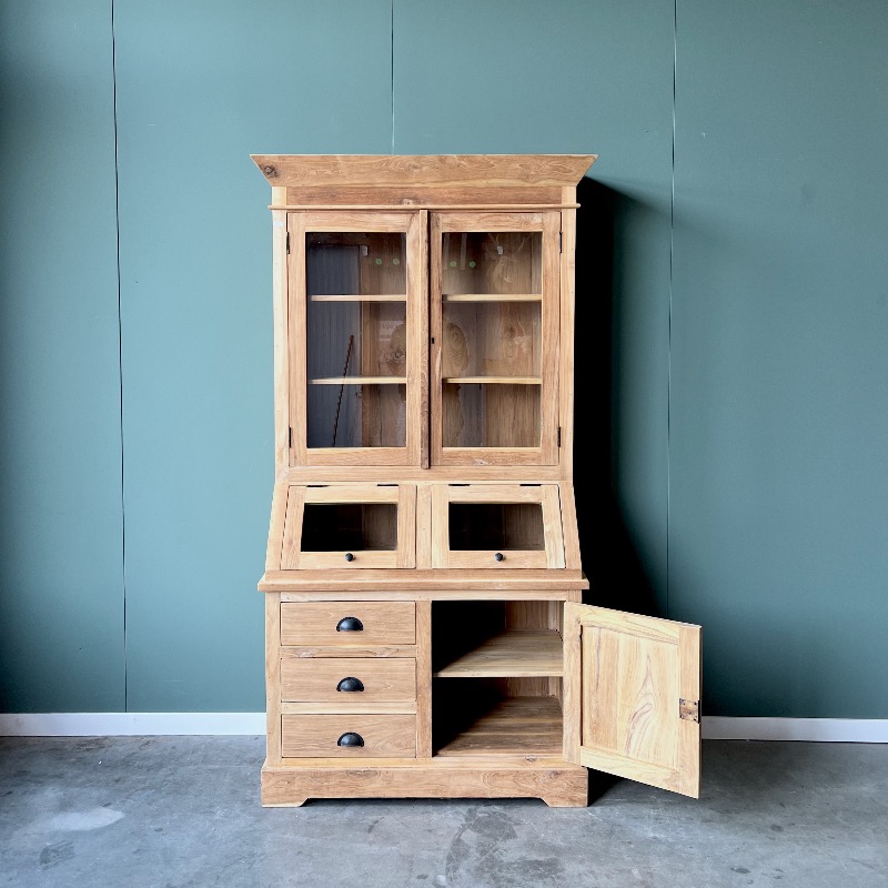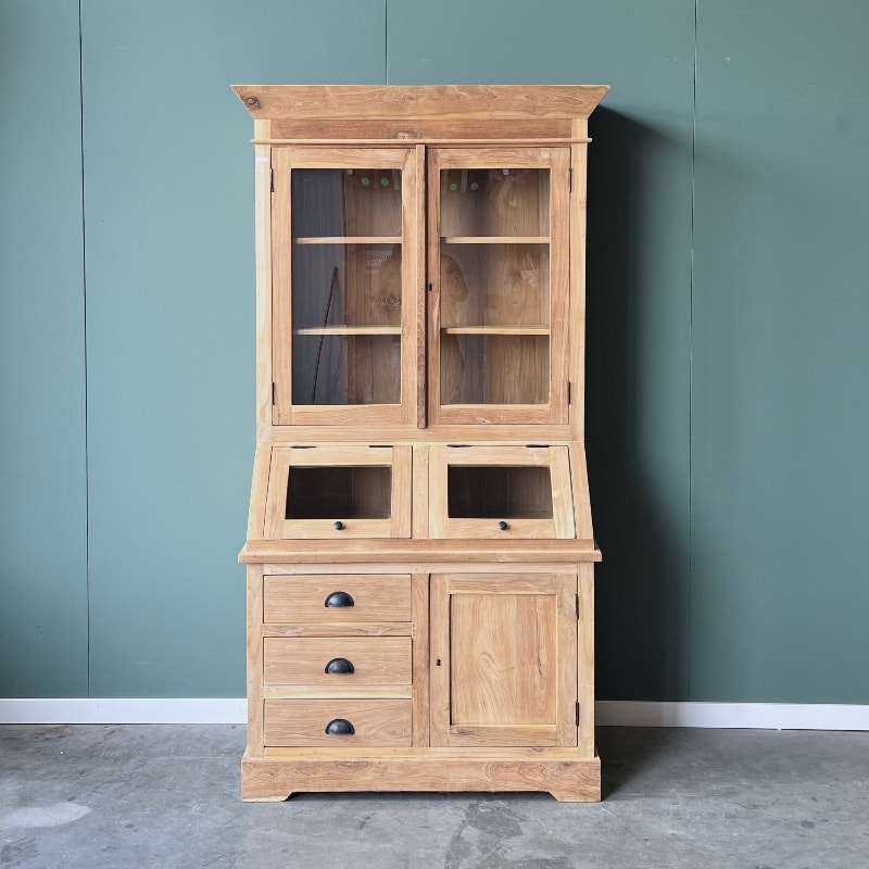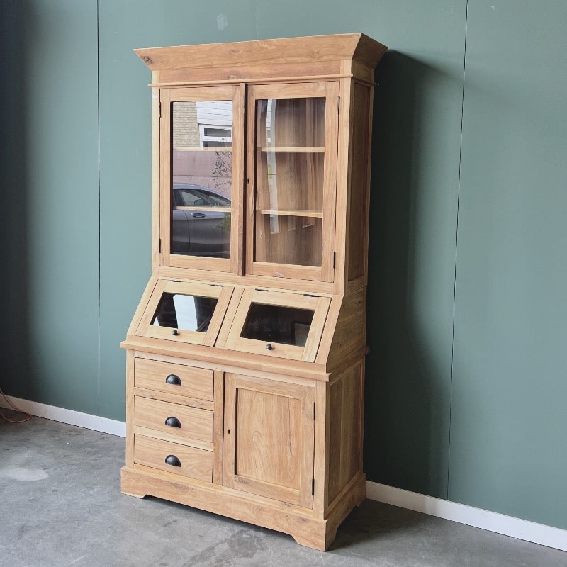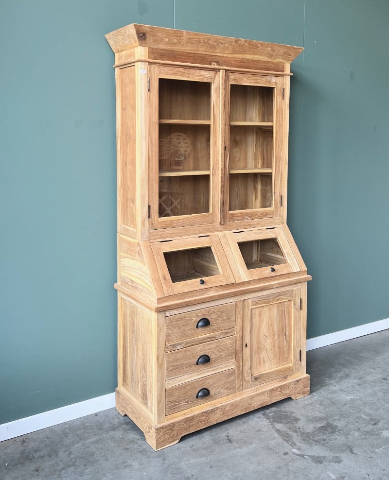 De teakhouten grutterskast heeft een doordachte driedelige opbouw: