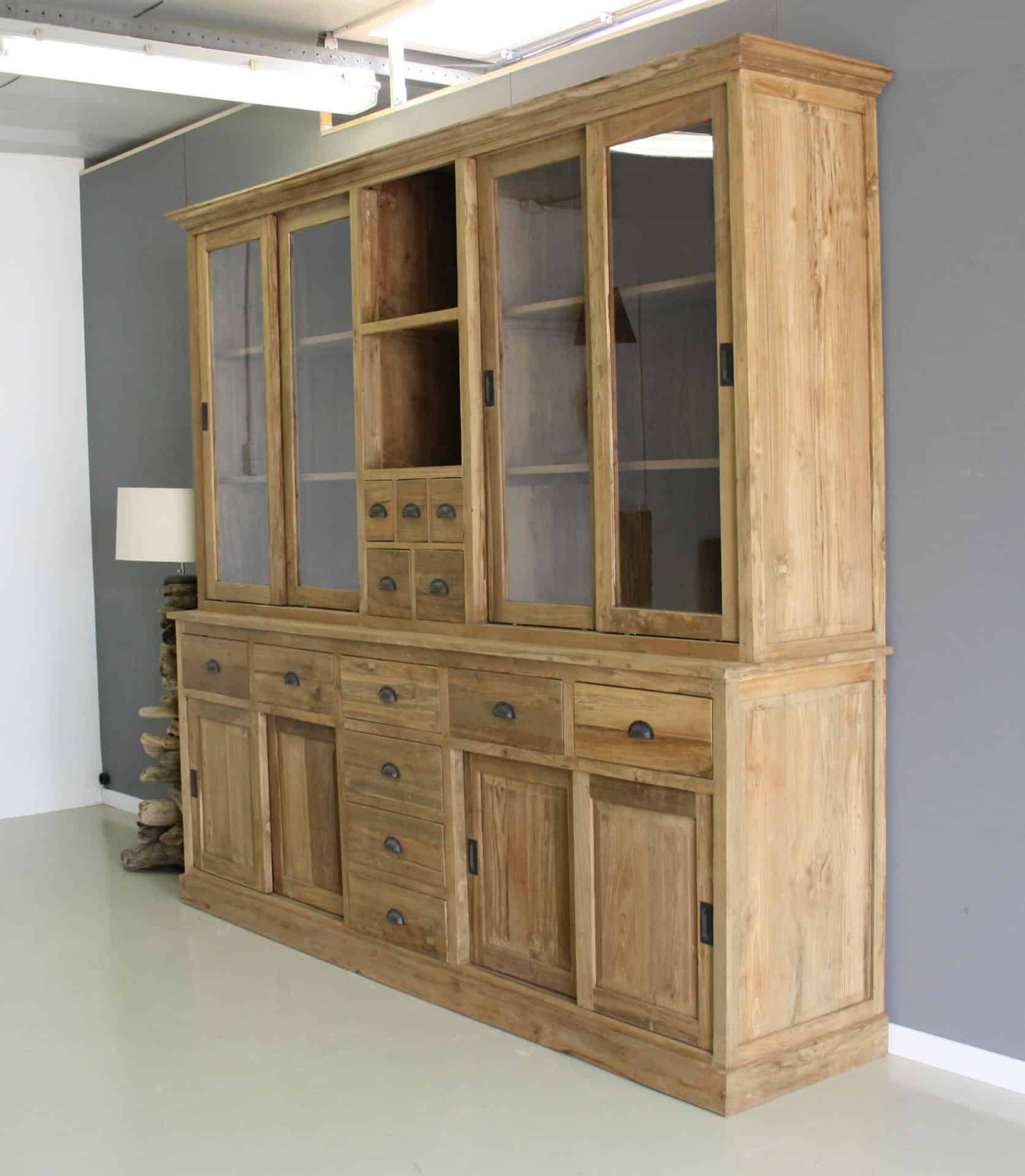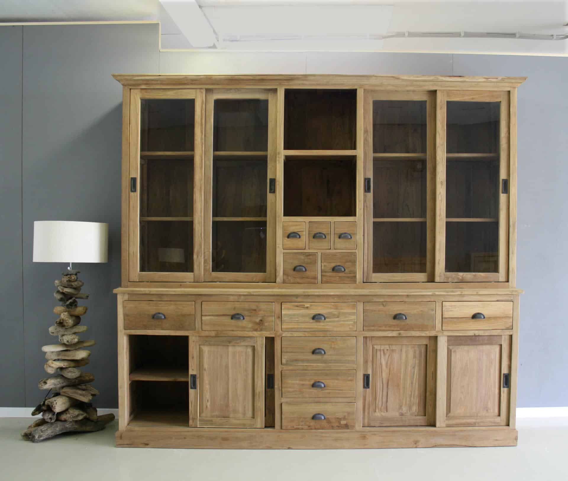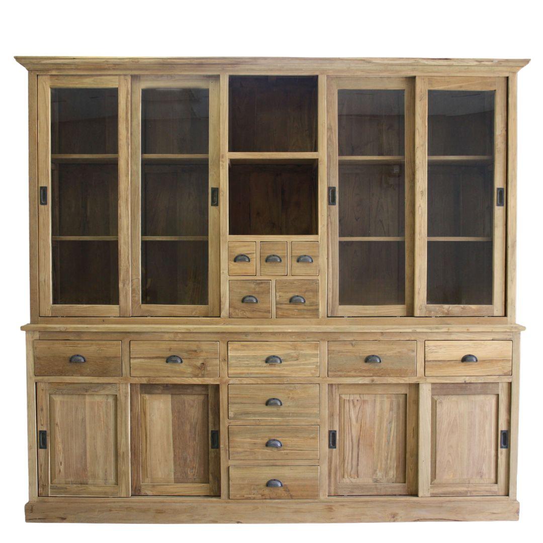 Deze winkelkast bestaat uit twee delen. Dit maakt transport en het plaatsen in huis eenvoudiger, ondanks het formaat. Het gerecyclede teakhout geeft het meubel een warme uitstraling met natuurlijke tekeningen in het hout.