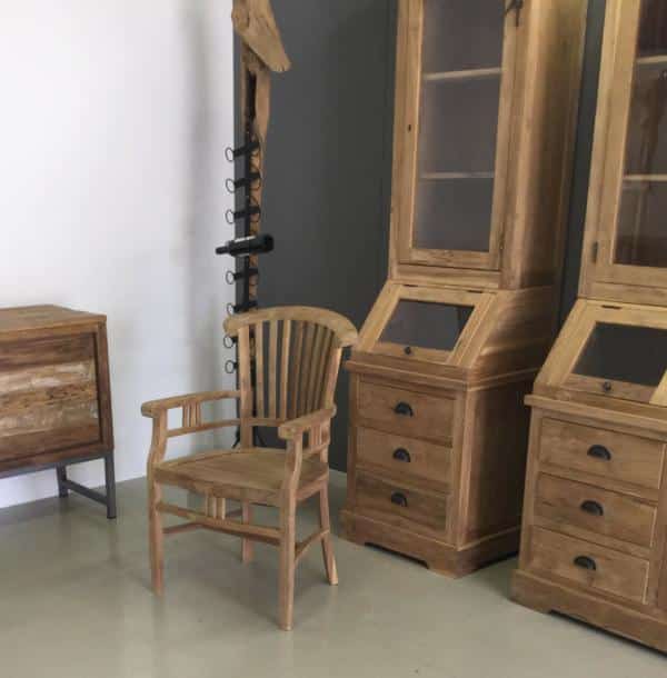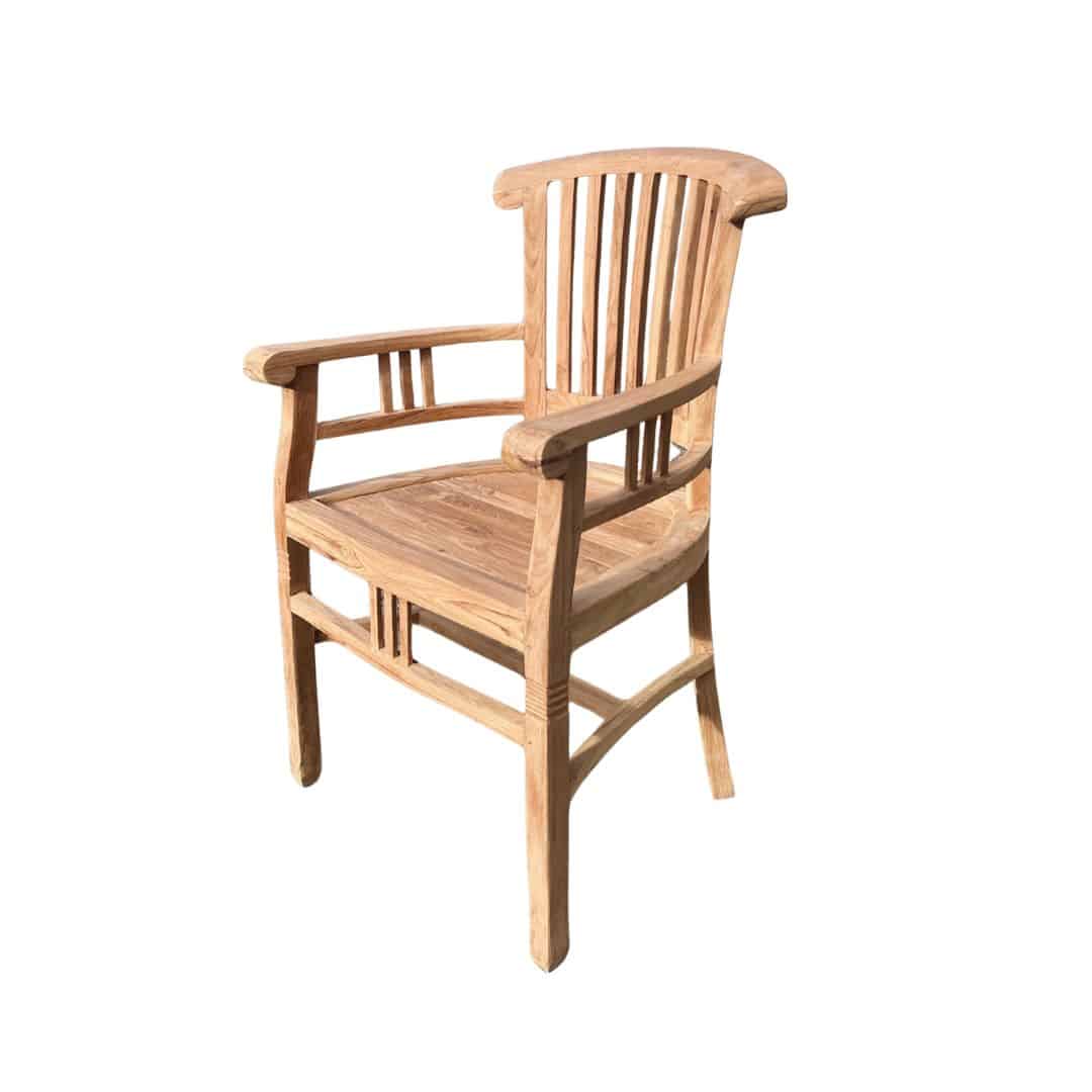 Teakhouten stoel met armleuningen. De hoogte van de armleuning is 68cm. Een hele comfortabele stoel, mede door de ronding in de rug.