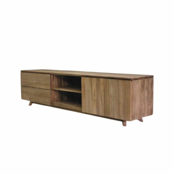 Voor dit meubel wordt uitsluitend de beste kwaliteit hergebruikt teak gebruikt. Hergebruikt teak komt uit oude slooppanden. Dit hout wordt eerst verzameld en daarna klaar gemaakt voor hergebruik, denk hierbij aan het verwijderen van oude verf lagen en spijkergaatjes vullen. Het voordeel hiervan is dat het oude teakhout op een natuurlijke wijze jaren heeft kunnen drogen en daardoor minder werkt. Samengevat oud teakhout is een stuk duurzamer dan plantage teak er is immers geen boom voor om gezaagd. De laden van het teak tv meubel gaan soepel open op een metalen rail.