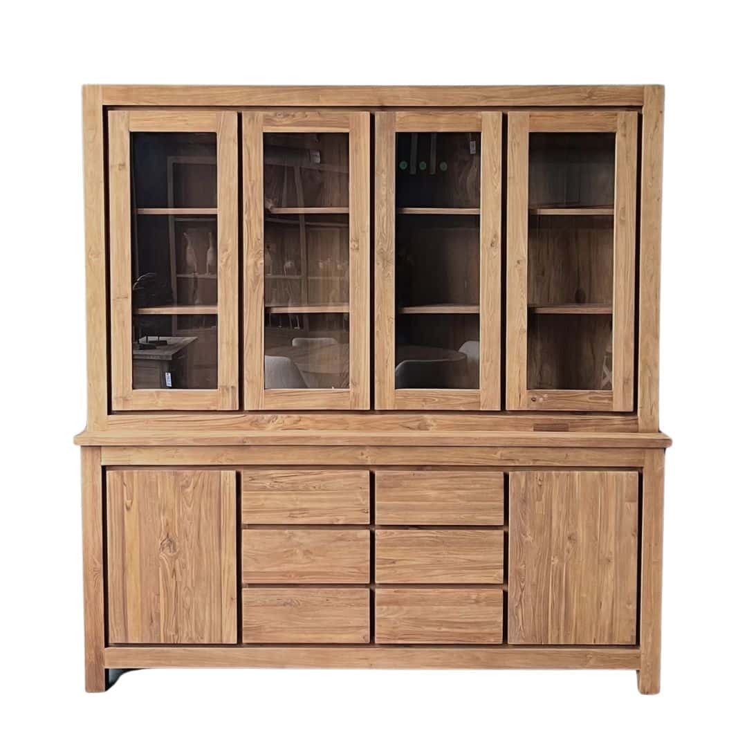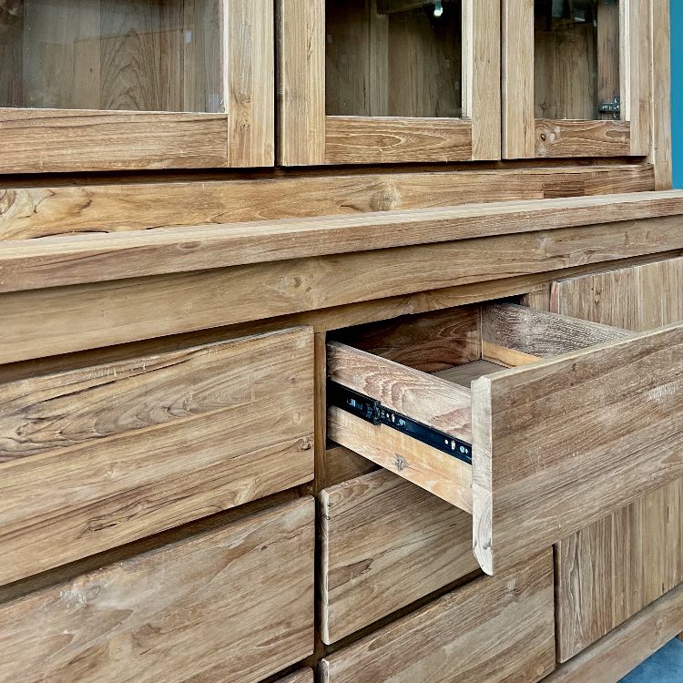 Deze moderne buffetkast is gemaakt van gerecycled teakhout, wat niet alleen zorgt voor een tijdloze uitstraling, maar ook voor een duurzame keuze. De kast heeft ruime opbergvakken en is voorzien van deuren met een soft close systeem, wat zorgt voor een rustige en elegante sluiting. Daarnaast lopen de laden erg soepel op metalen geleiders. Perfect voor het combineren van functionaliteit en stijl in jouw interieur.