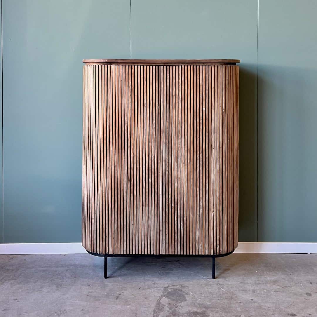 De Curve kast combineert zachte rondingen met een strak lattenpatroon voor een stijlvol en eigentijds design. Gemaakt van hoogwaardig gerecycled teakhout straalt dit meubel warmte, karakter en vakmanschap uit. De afgeronde hoeken zorgen voor een verfijnde, organische look die perfect past in een modern, natuurlijk interieur.
