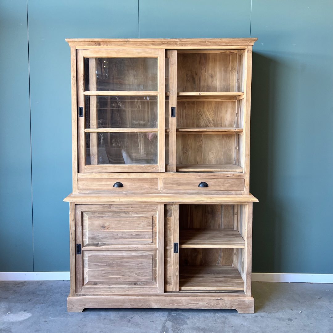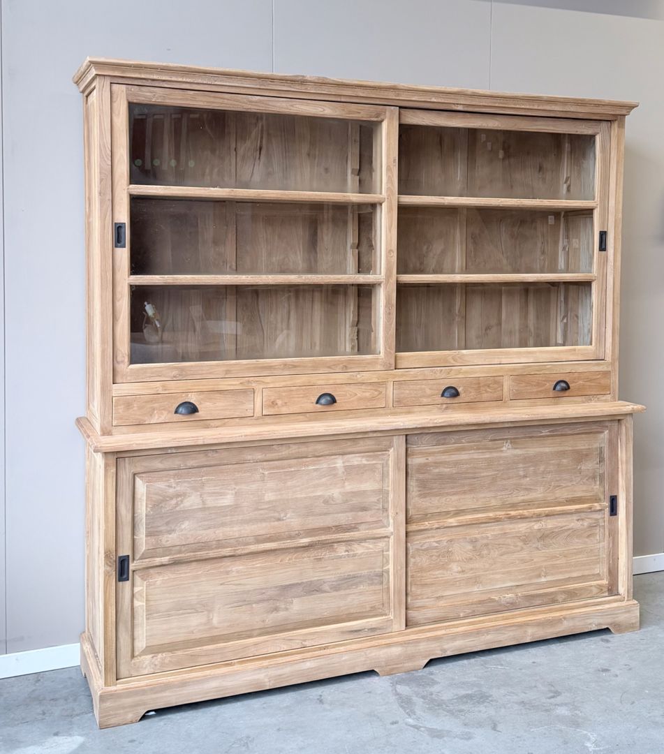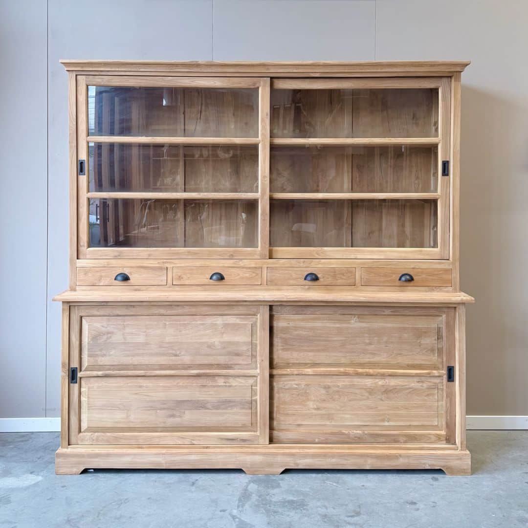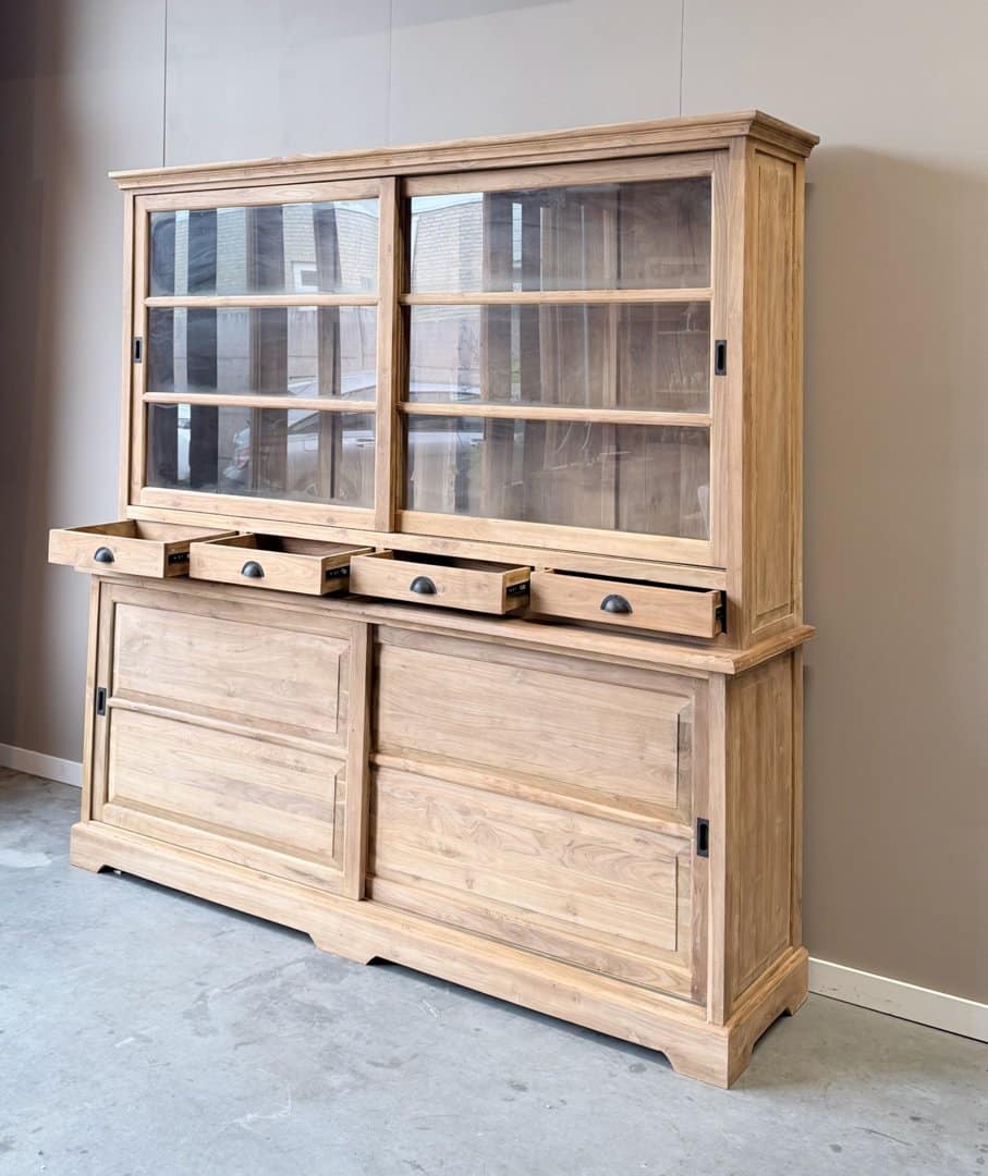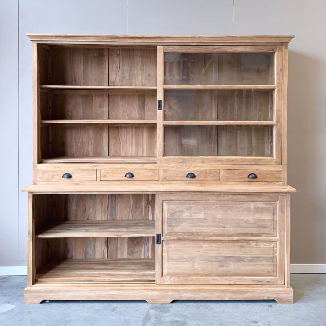 De Teakkast Utrecht is een prachtige buffetkast van FSC-gecertificeerd gerecycled teakhout die zowel stijlvol als functioneel is. Het unieke ontwerp met schuifdeuren en laden in het bovenstuk zorgt ervoor dat het onderstuk extra bergruimte biedt, ideaal voor servies, boeken of andere spullen.