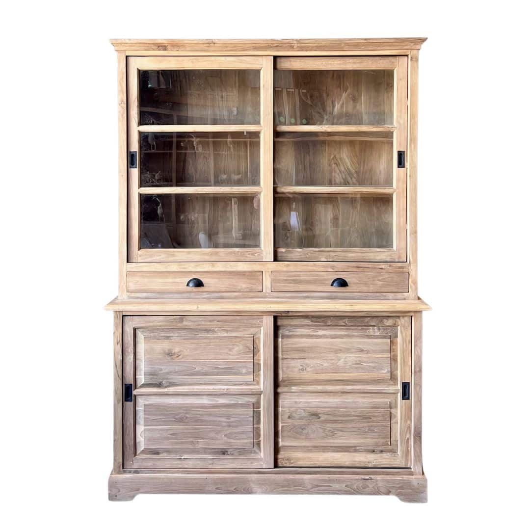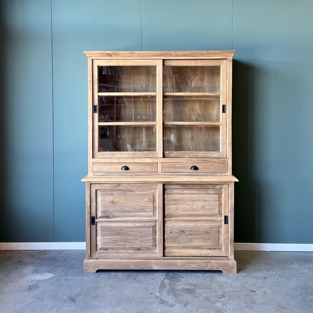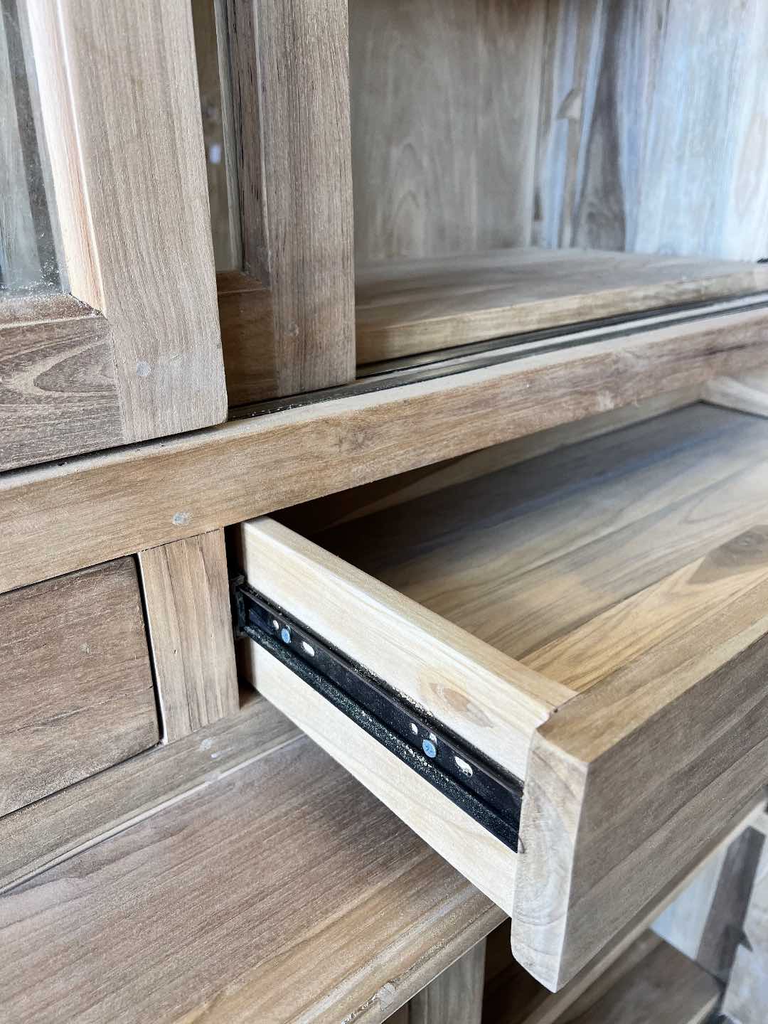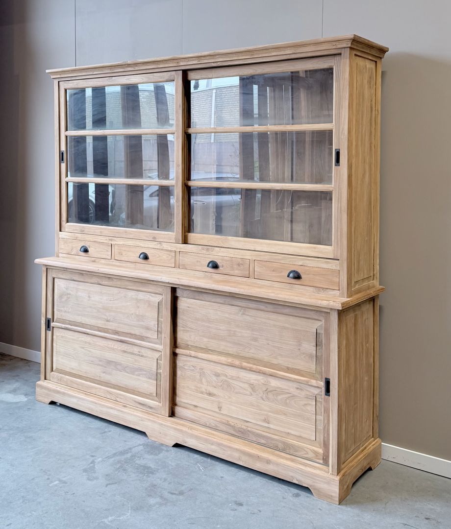 De Teakkast Utrecht is een prachtige buffetkast van FSC-gecertificeerd gerecycled teakhout die zowel stijlvol als functioneel is. Het unieke ontwerp met schuifdeuren en laden in het bovenstuk zorgt ervoor dat het onderstuk extra bergruimte biedt, ideaal voor servies, boeken of andere spullen.