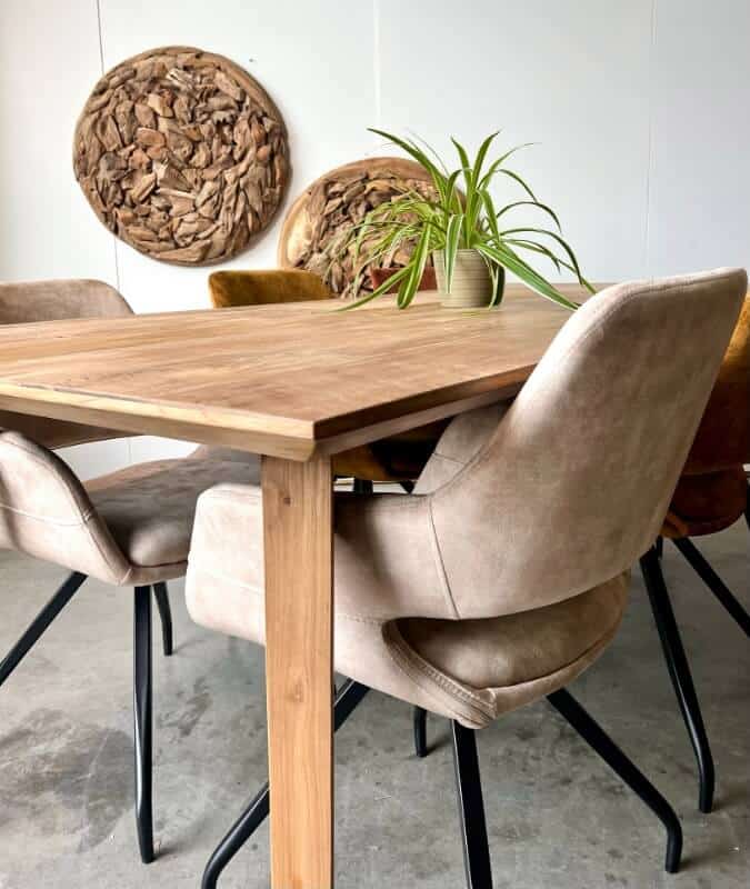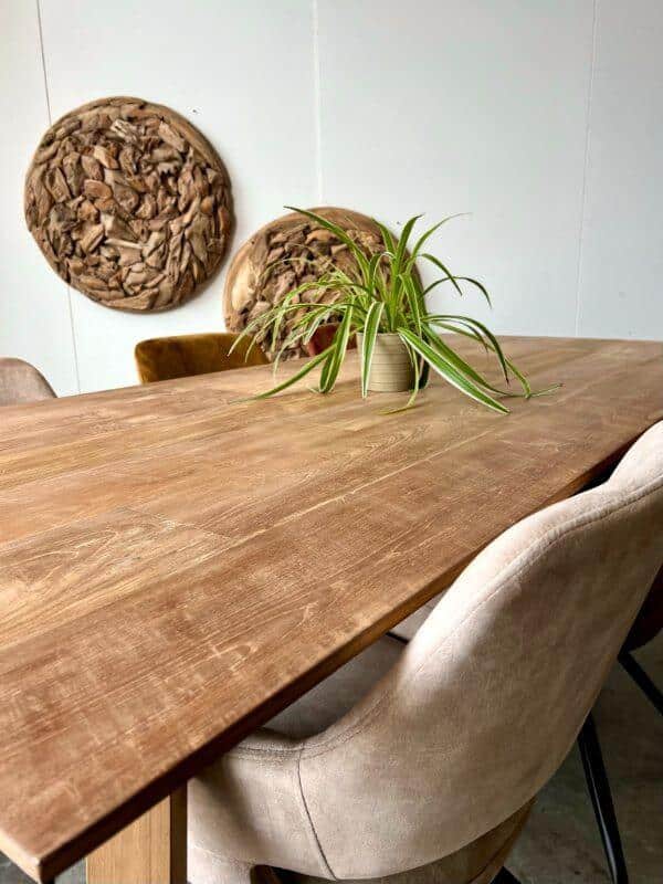 Wat jong teak bijzonder maakt, is de prachtige goudgele kleur en de rustige, egale uitstraling. Het hout heeft minder sporen van een vorig leven dan gerecycled teak en oogt daardoor strak en modern. Perfect voor wie houdt van een frisse, eigentijdse stijl. Voordat het hout verwerkt wordt, wordt het zorgvuldig geselecteerd en gedroogd. Dit helpt om de werking van het hout zoveel mogelijk te beperken en zorgt voor een stevig en duurzaam meubel.