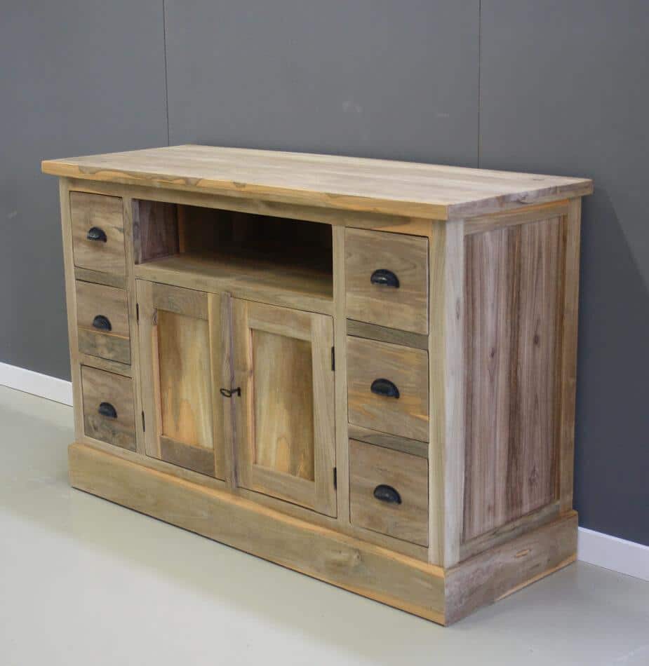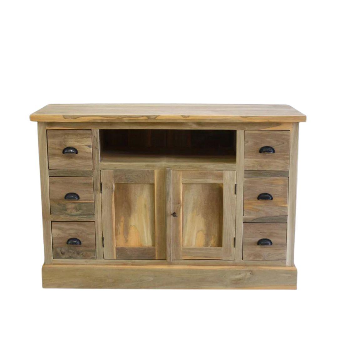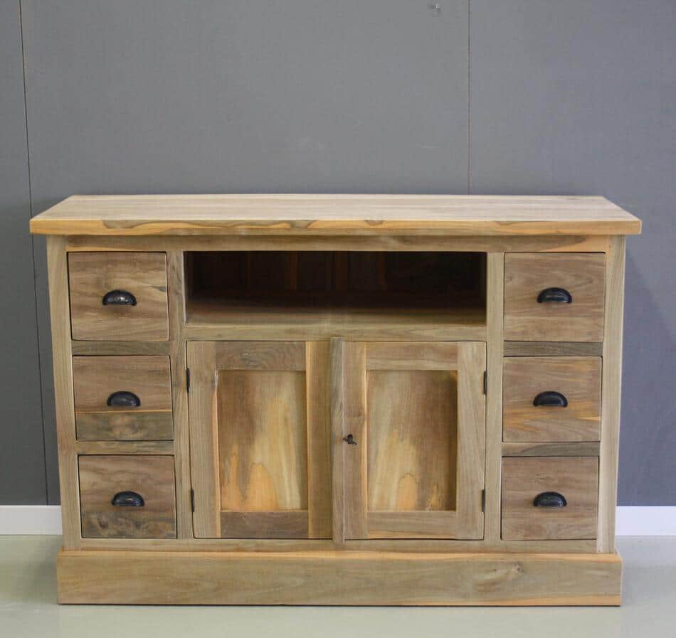 TV meubel met zes laden, twee deuren en een open vak. De laden hebben geen geleiders.