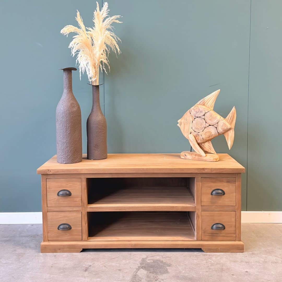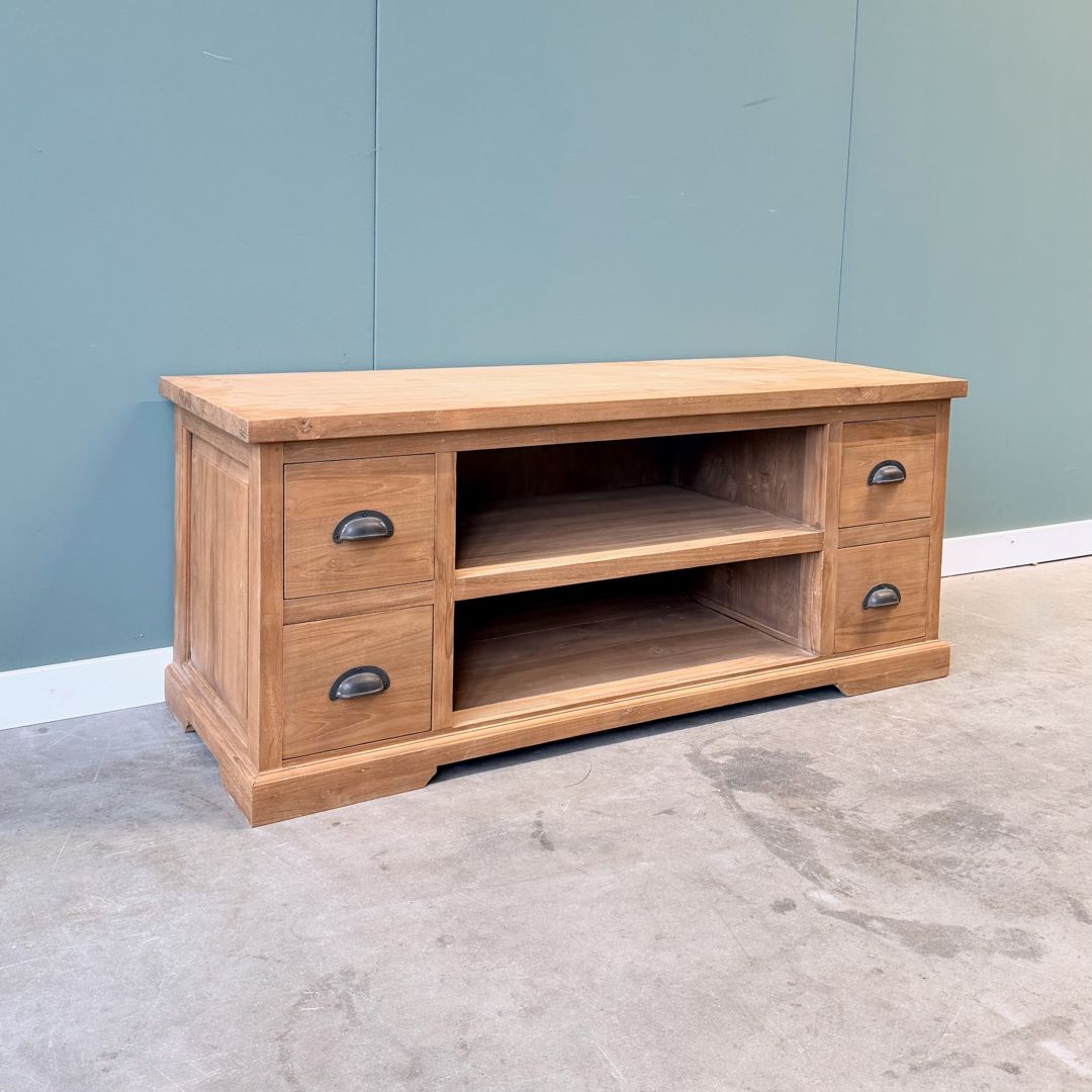 Stijlvol tv-meubel vervaardigd uit gerecycled teakhout van hoge kwaliteit. Met een breedte van 120 cm biedt dit meubel volop functionaliteit: twee ruime open vakken in het midden voor apparatuur en aan beide zijden twee laden boven elkaar voor extra opbergruimte. De sierlijke plint en de fraai afgewerkte panelen geven het meubel een tijdloze en elegante uitstraling.