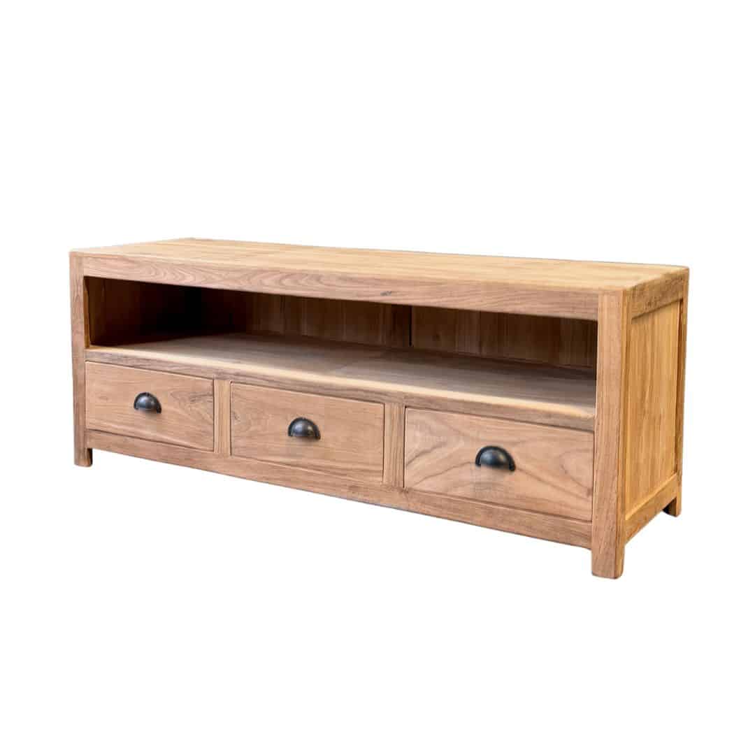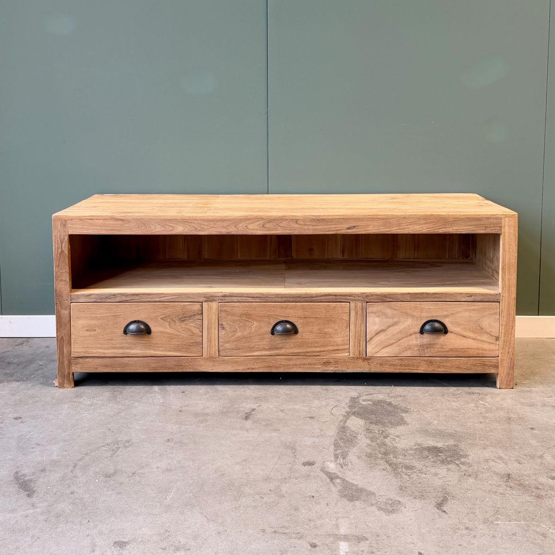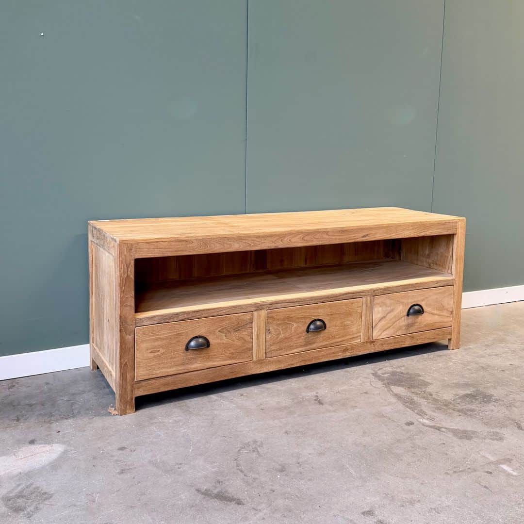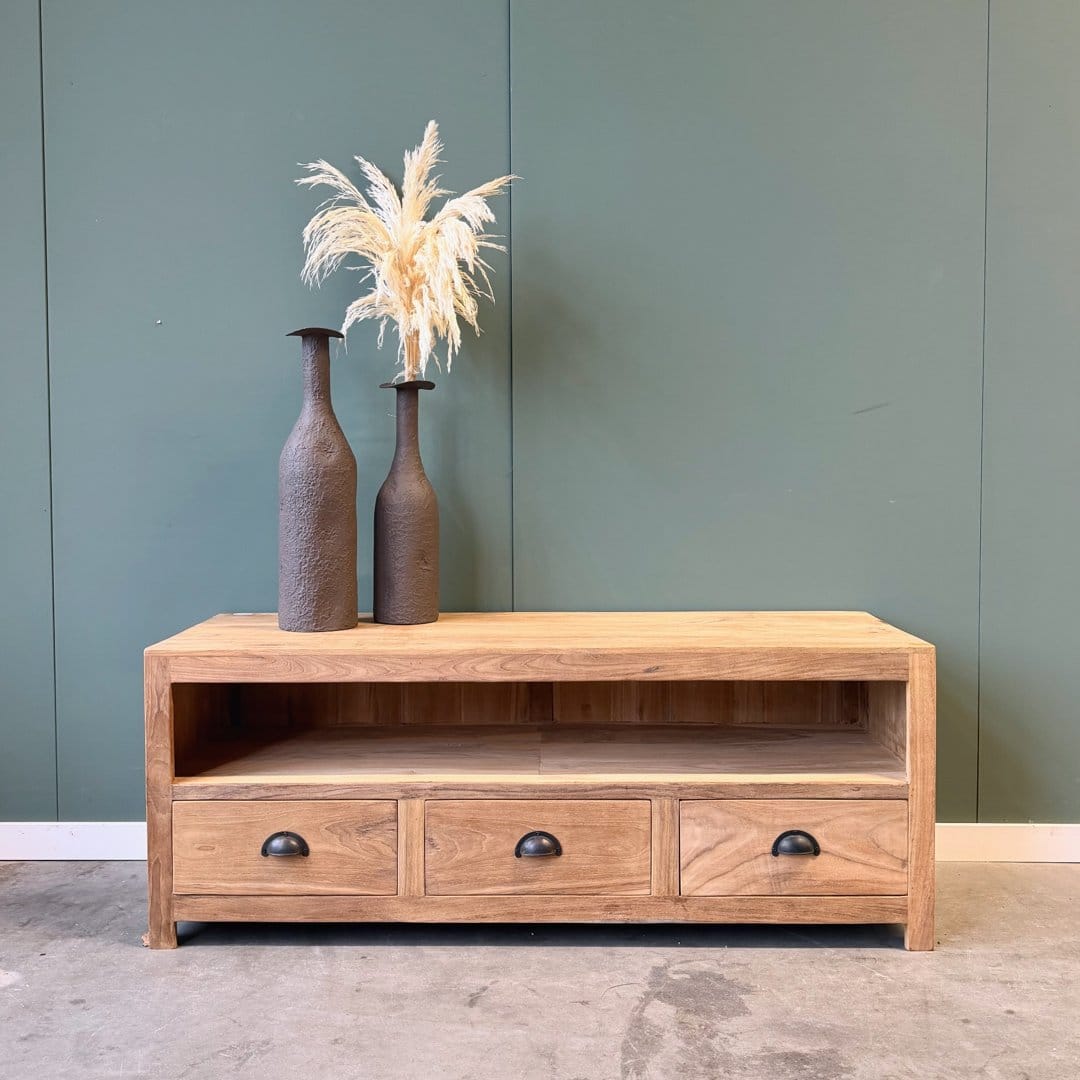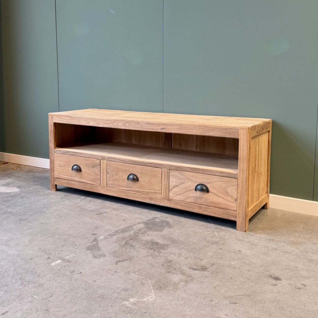 Dit tv-meubel is gemaakt van plantage teakhout met een mooie goudgele kleur. Het heeft een ruim open vak voor apparatuur en laden met zwarte komgrepen voor extra opbergruimte. Een praktisch en sfeervol meubel dat in elk interieur tot zijn recht komt.