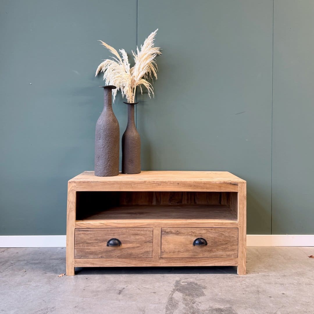 Dit tv-meubel is gemaakt van plantage teakhout met een mooie goudgele kleur. Het heeft een ruim open vak voor apparatuur en laden met zwarte komgrepen voor extra opbergruimte.