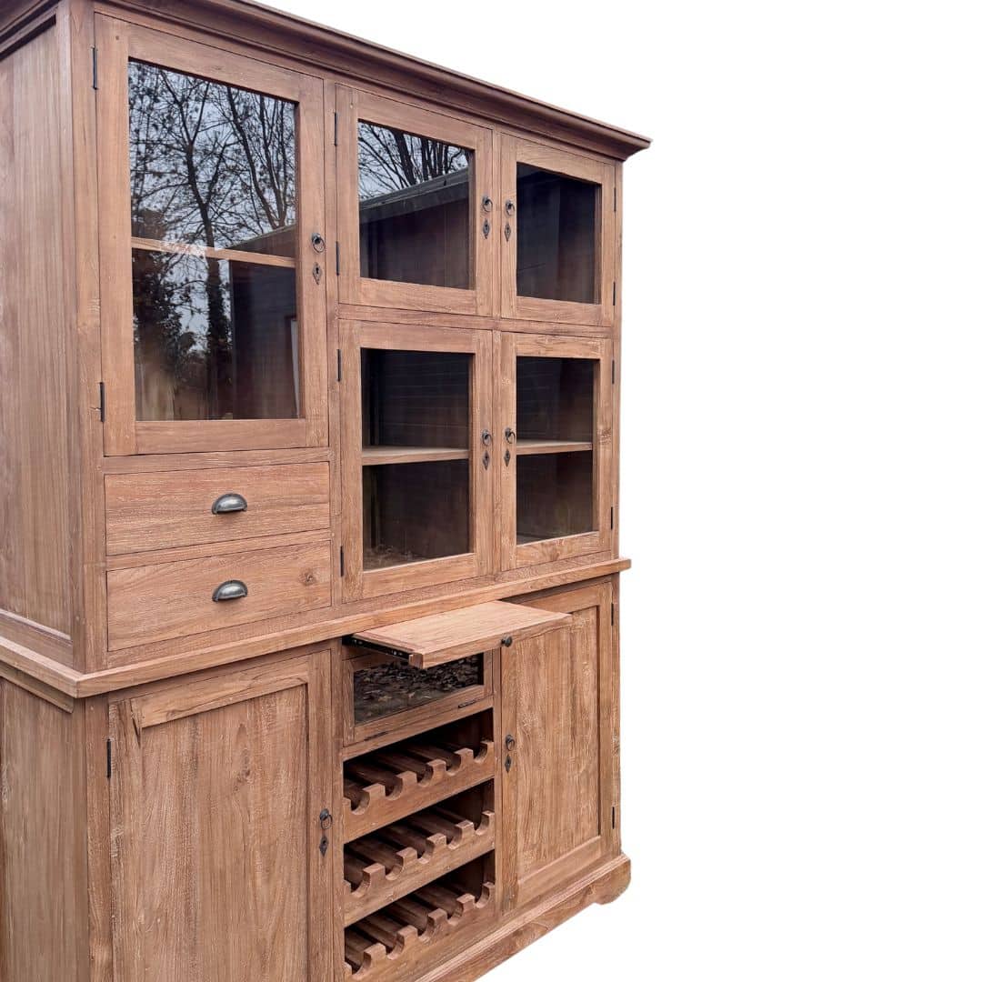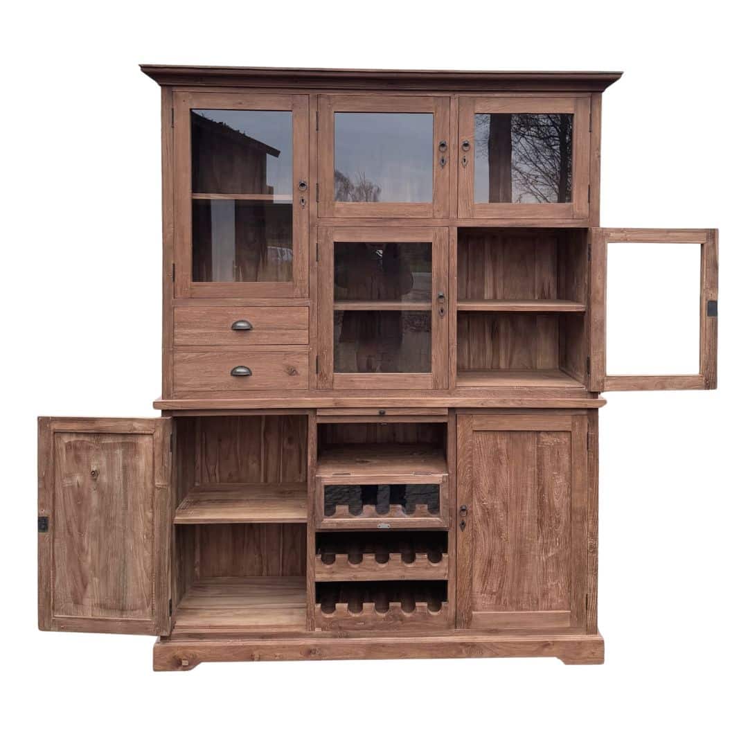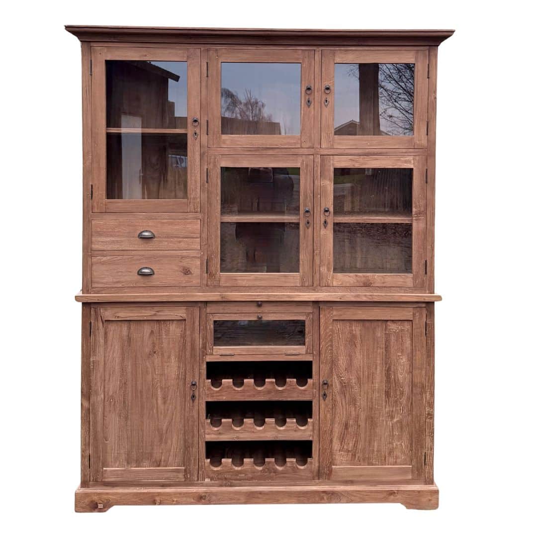 Deze buffetkast combineert functionaliteit, karakter en ambacht in één meubel. Het gerecyclede teakhout geeft de kast een unieke uitstraling en maakt elk stuk volledig uniek.