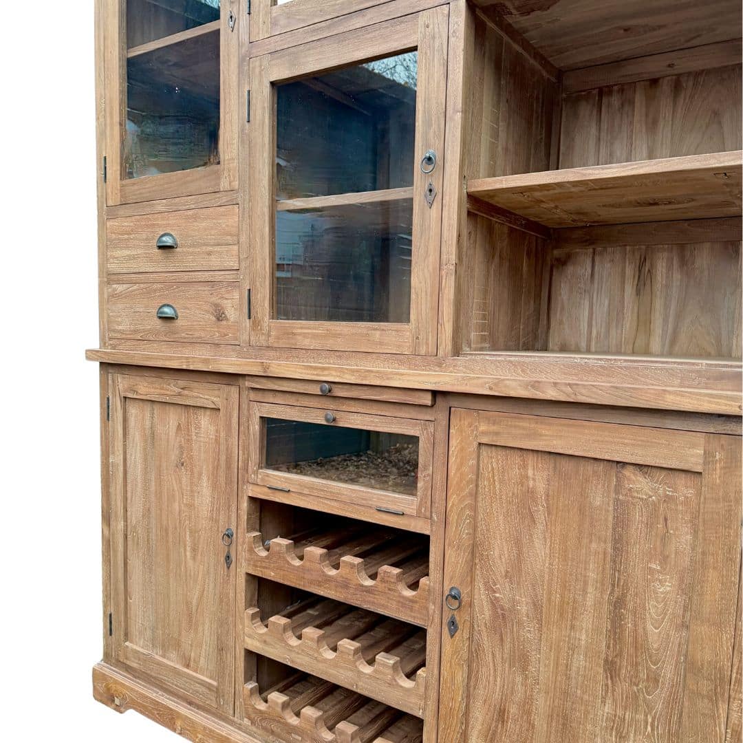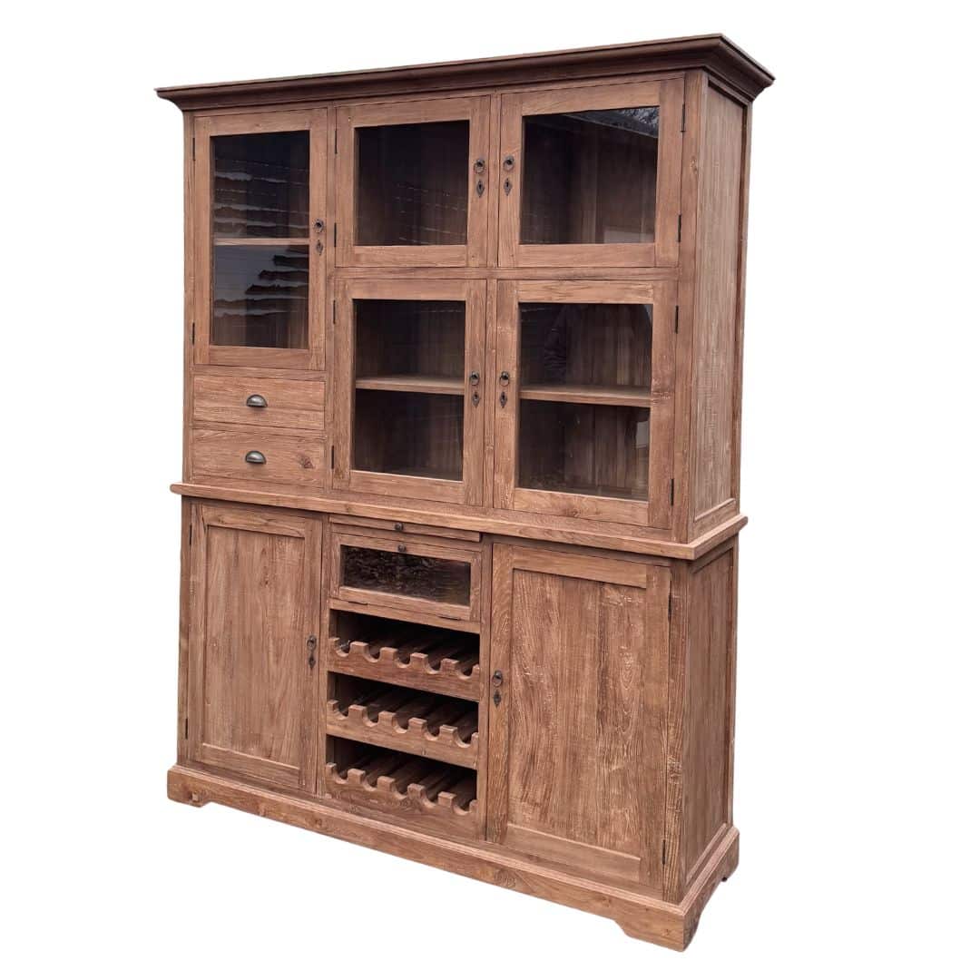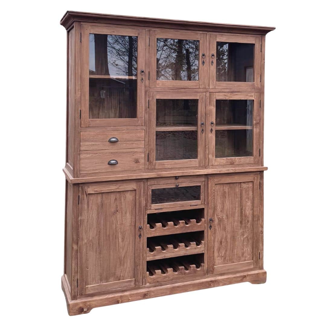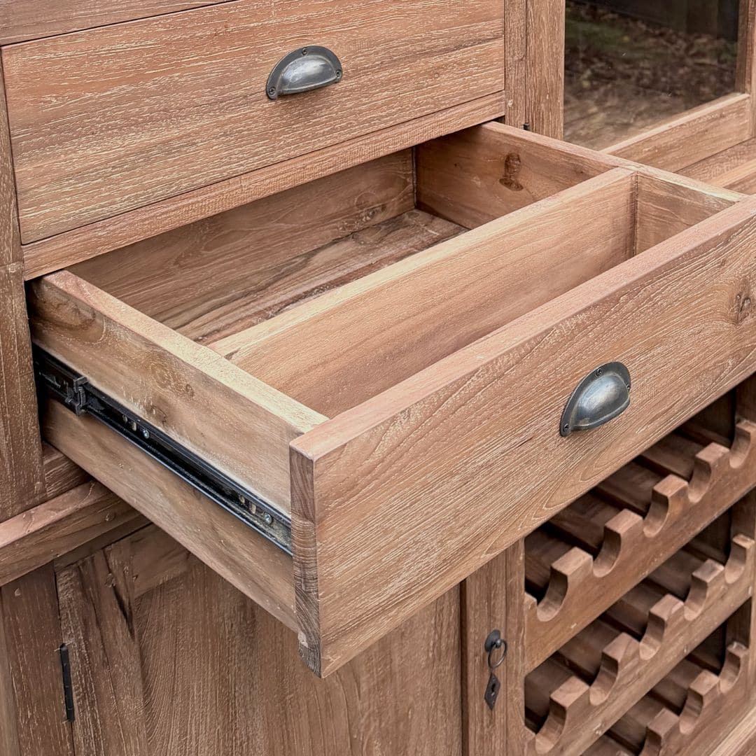 Deze buffetkast combineert functionaliteit, karakter en ambacht in één meubel. Het gerecyclede teakhout geeft de kast een unieke uitstraling en maakt elk stuk volledig uniek.