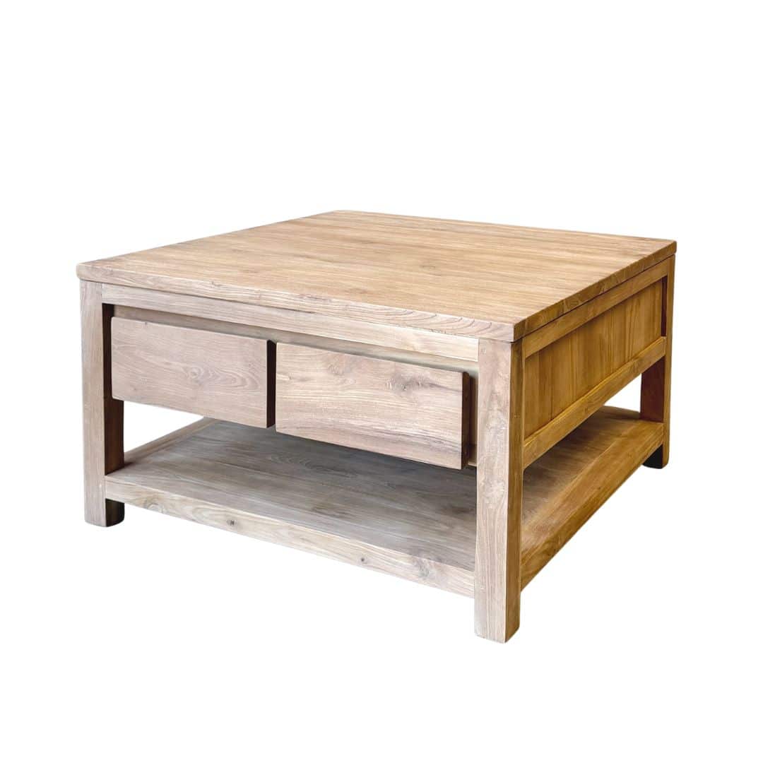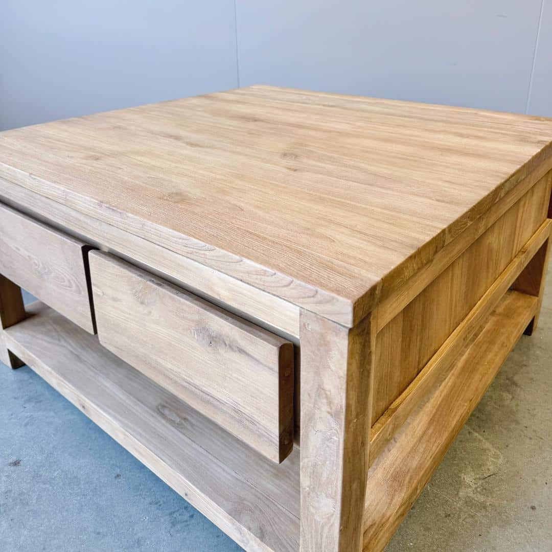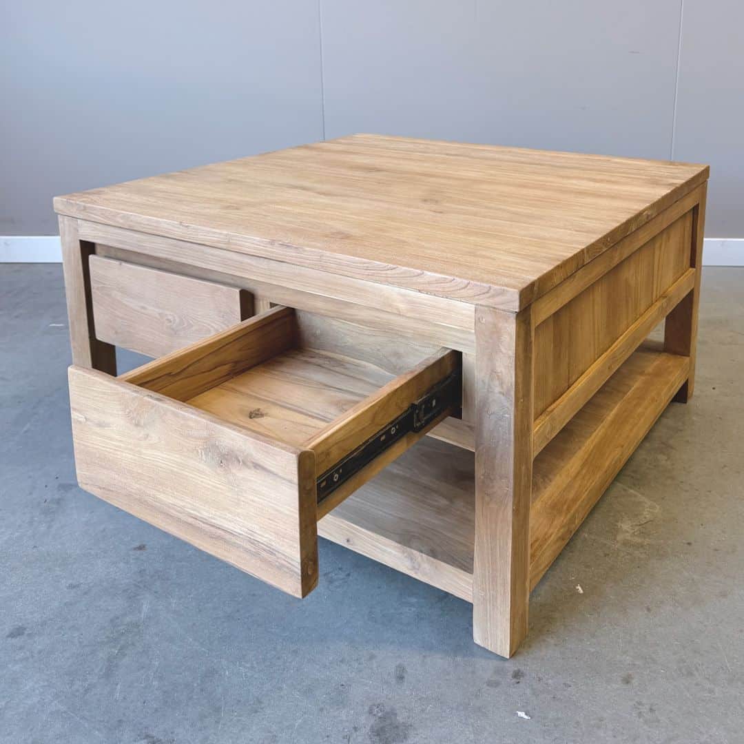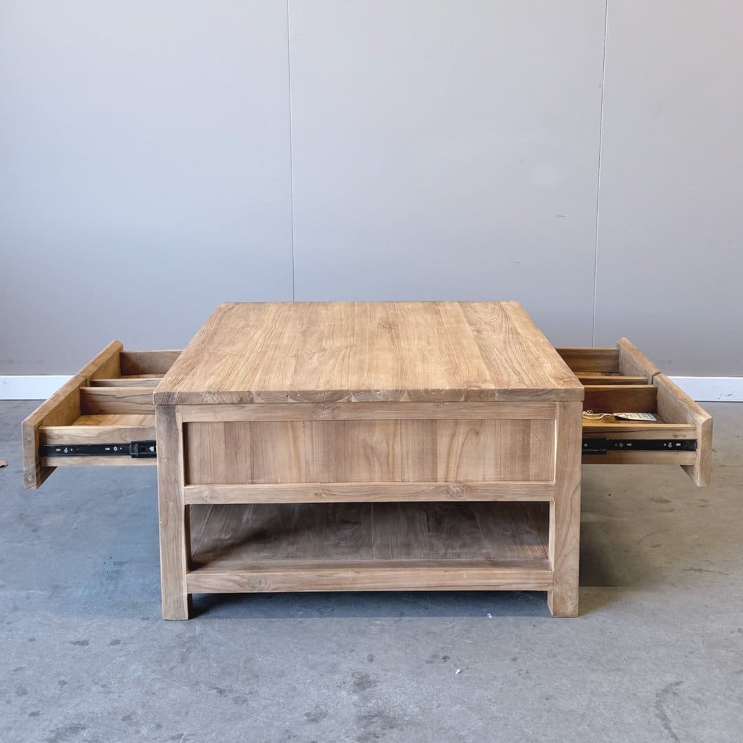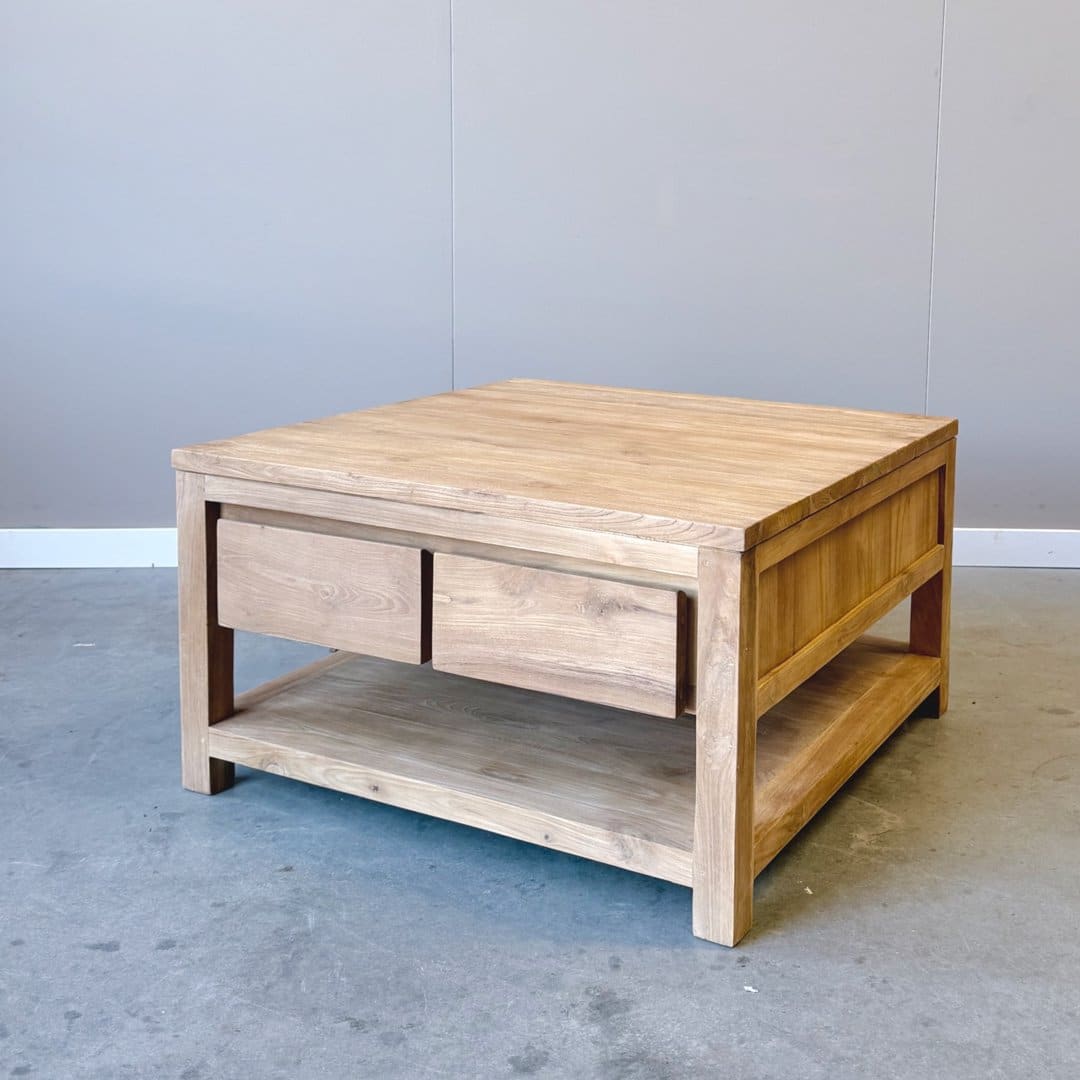Deze vierkante salontafel is gemaakt van massief gerecycled teakhout en heeft een warme, natuurlijke uitstraling. Het gebruikte hout beschikt over een FSC-keurmerk en geeft de tafel niet alleen karakter, maar ook een duurzaam verhaal.