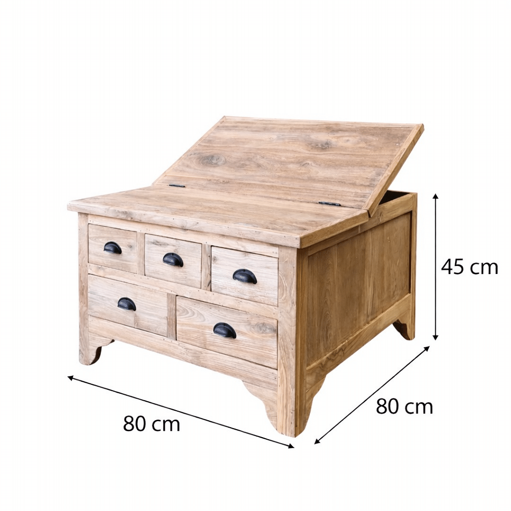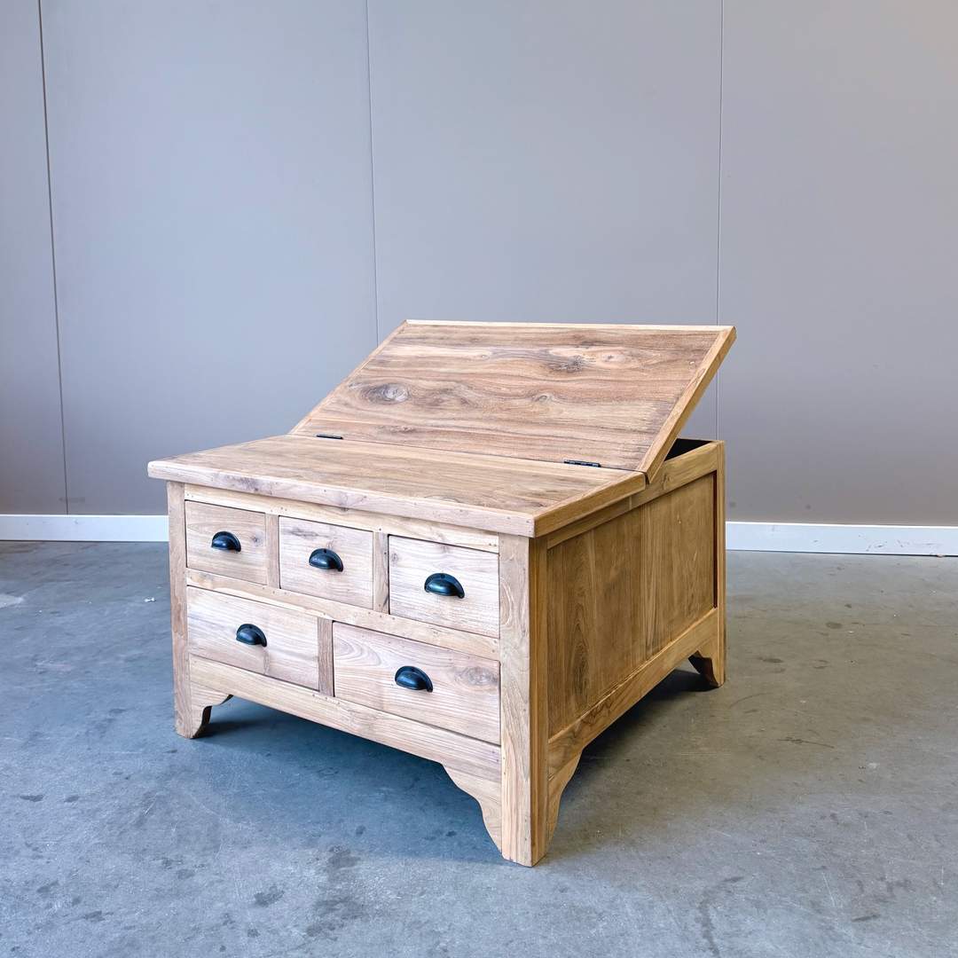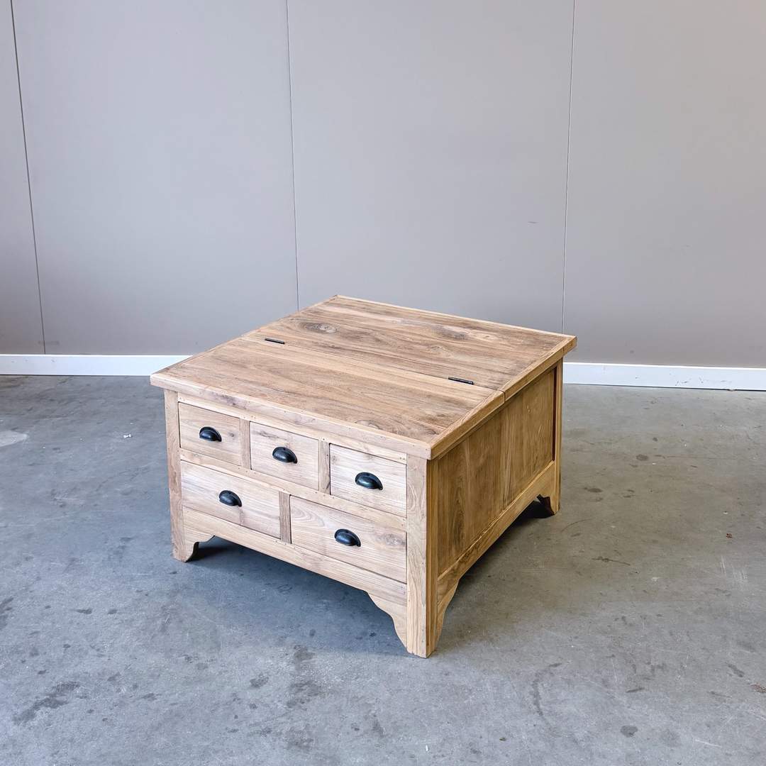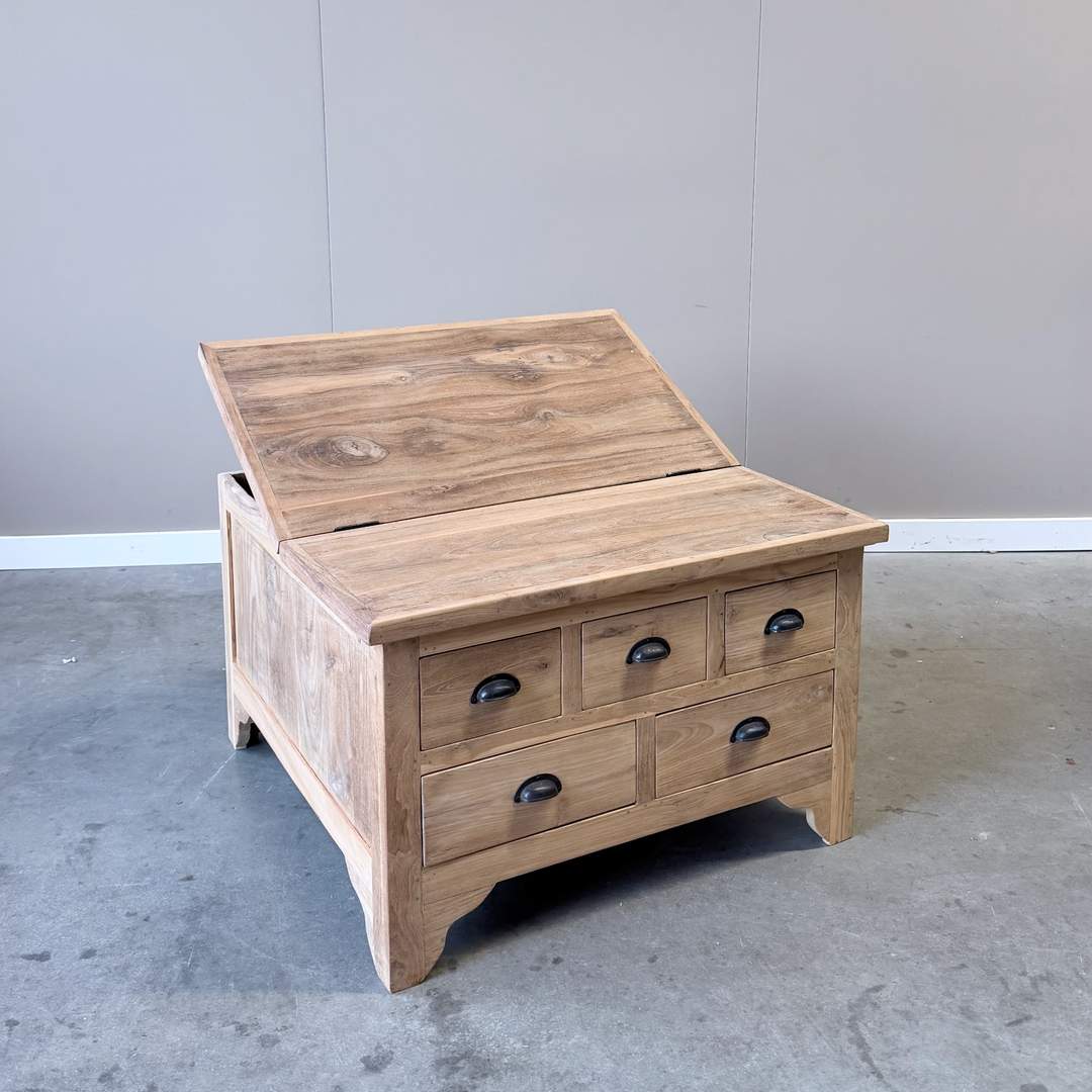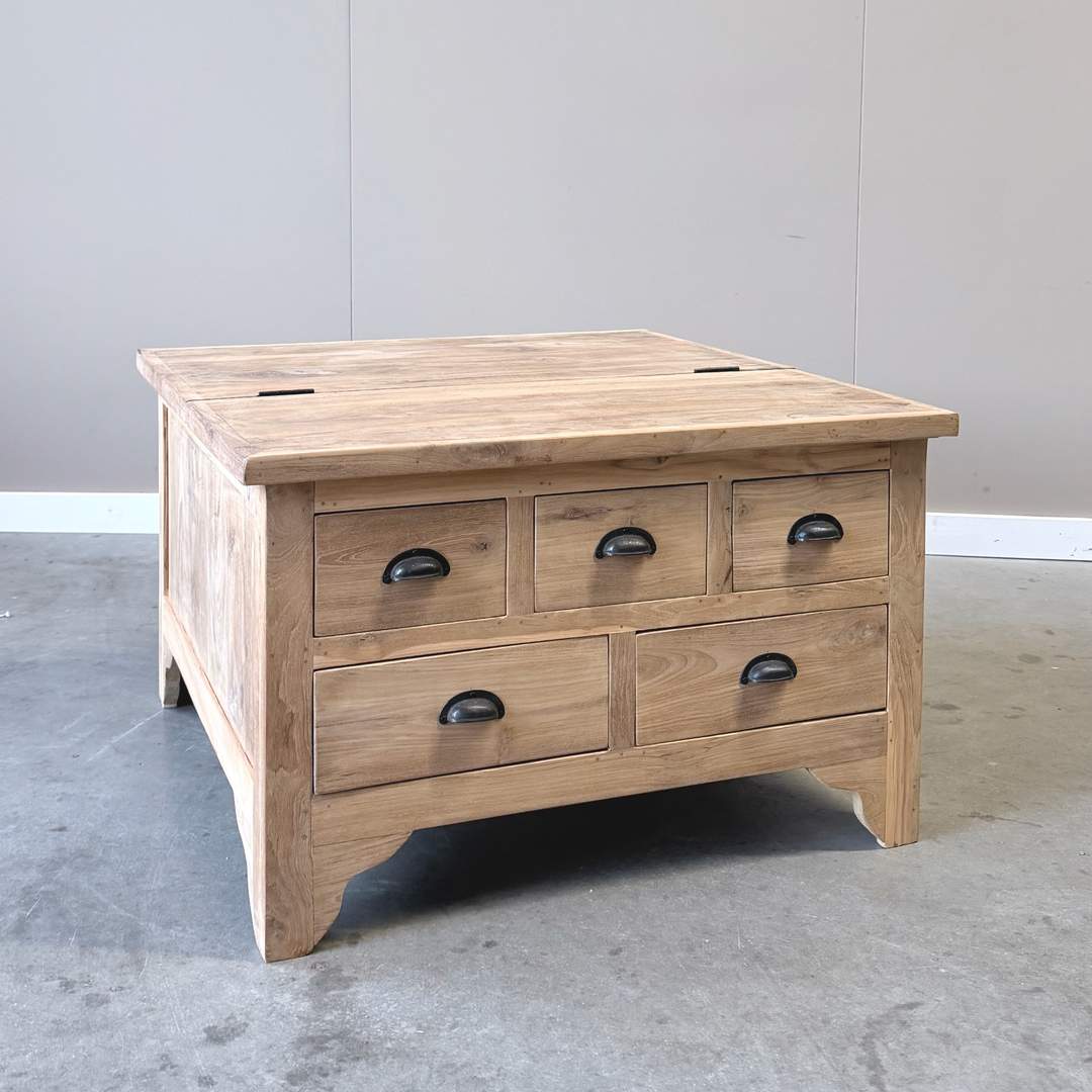 Deze vierkante salonkist van 80×80 cm is vervaardigd uit massief plantage teakhout en combineert een robuuste uitstraling met praktisch gebruiksgemak. De tafel is voorzien van meerdere lades én een openklapbaar blad, waardoor er verrassend veel opbergruimte ontstaat. De warme houtkleur, natuurlijke nerf en zwarte komgrepen geven de salonkist een tijdloos en karaktervol design dat perfect past in zowel landelijke als moderne interieurs.
