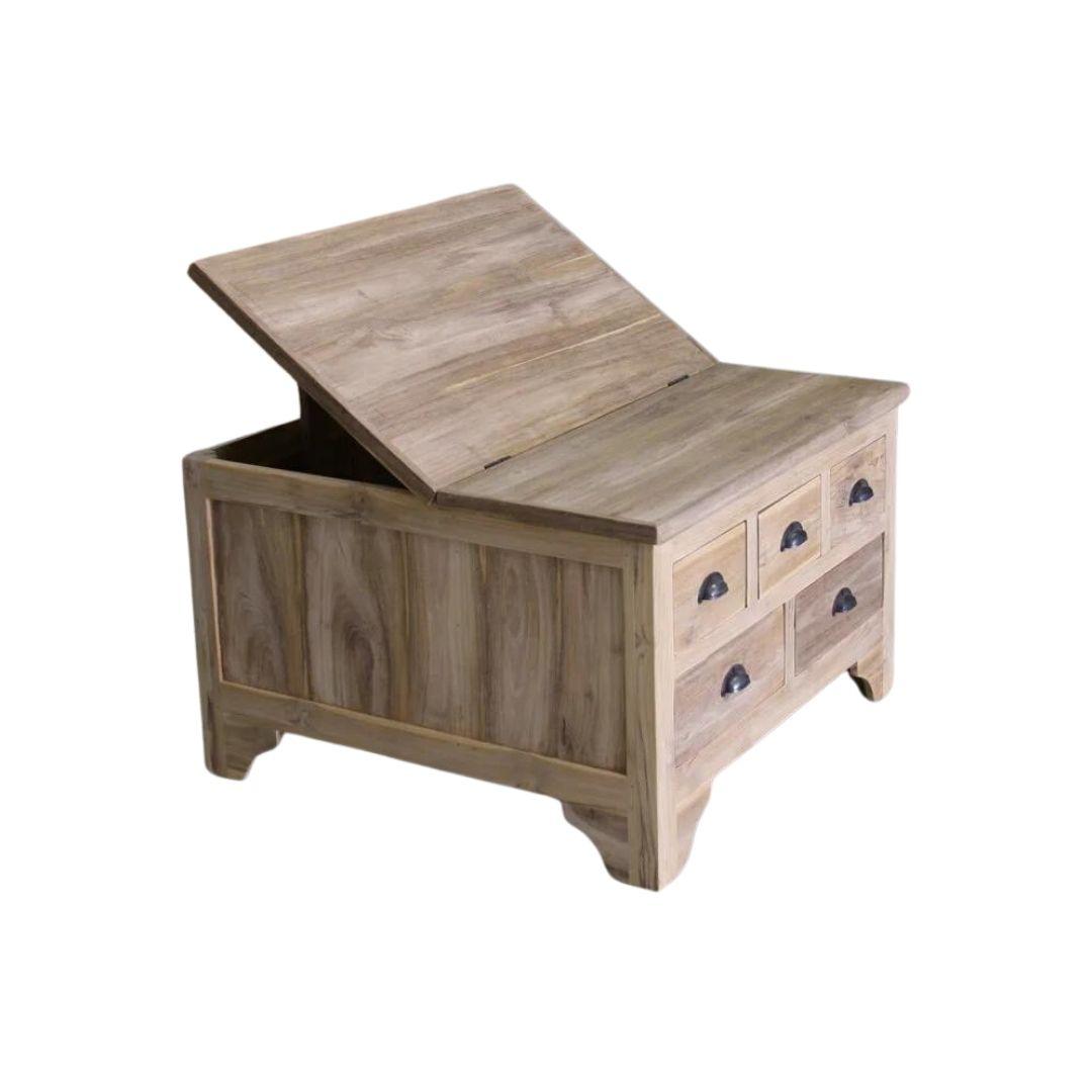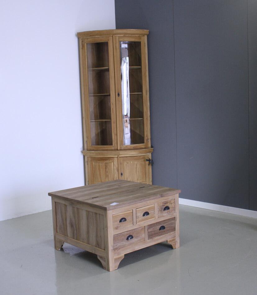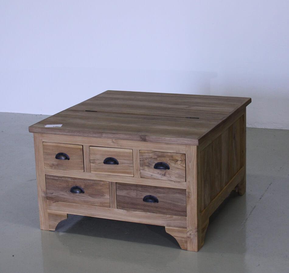 Salontafel van plantage teakhout. De tafel heeft vijf laden en onder de klep een grote ruimte waarin u snel en makkelijk spullen opbergt. ’s Avonds met een dekentje op de bank, de volgende dag het dekentje opgeborgen in de tafel.