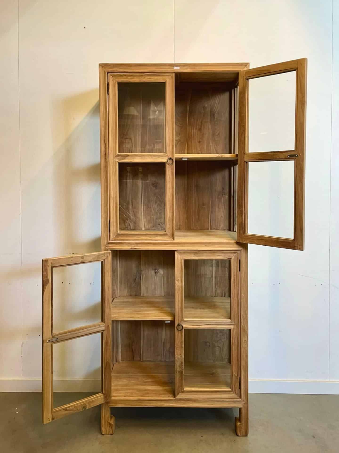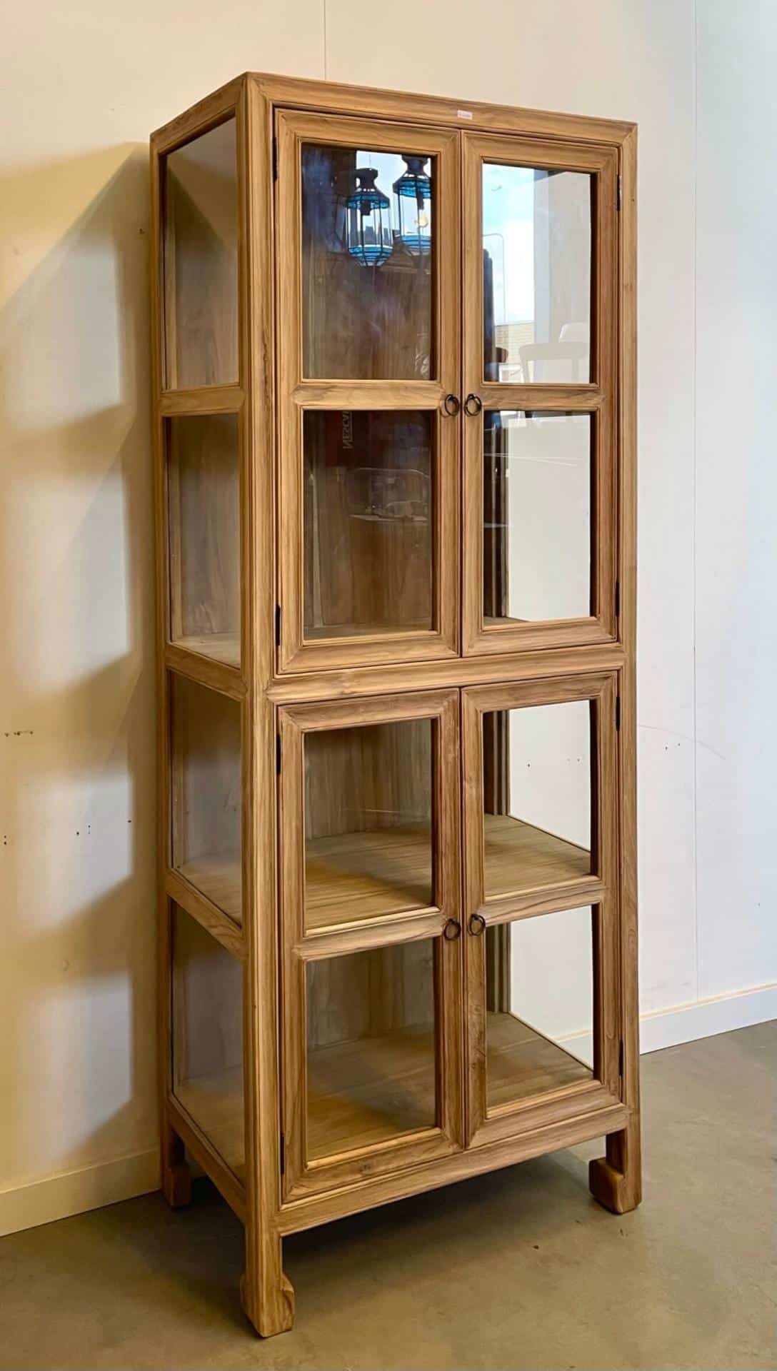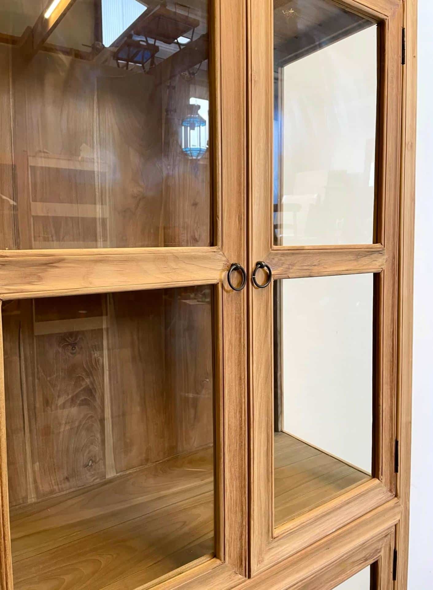 De vitrinekast is vervaardigd uit plantage teakhout, wat garant staat voor stabiliteit en duurzaamheid. Het meubel is stevig, gaat jarenlang mee en behoudt zijn warme uitstraling door het natuurlijke houtpatroon.