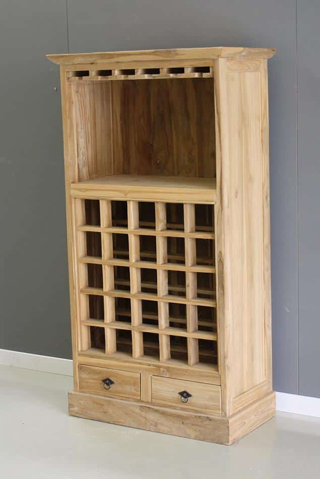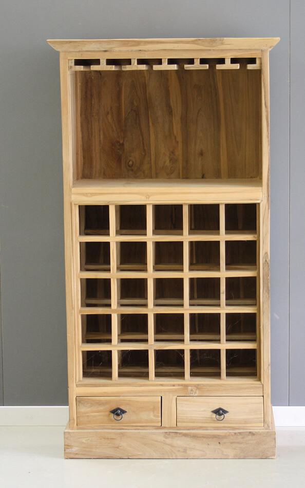 Groot wijnrek van teakhout. Ideaal om al uw mooie wijnen in op te bergen.